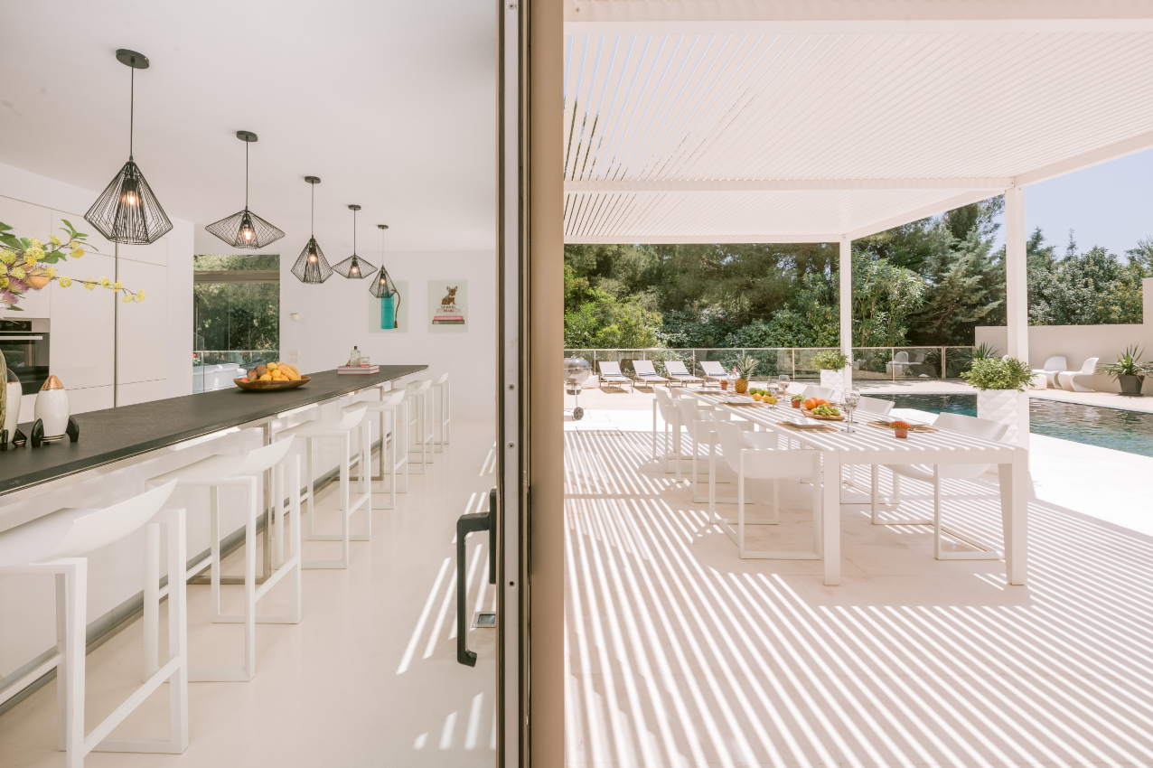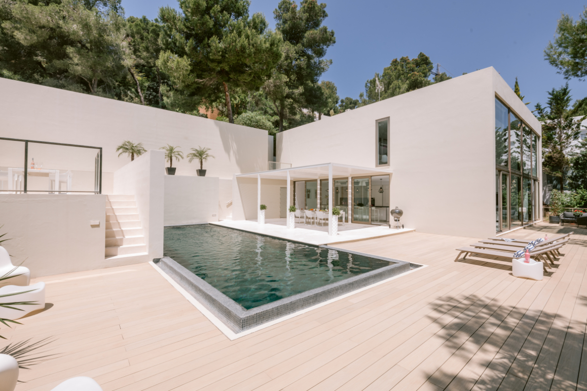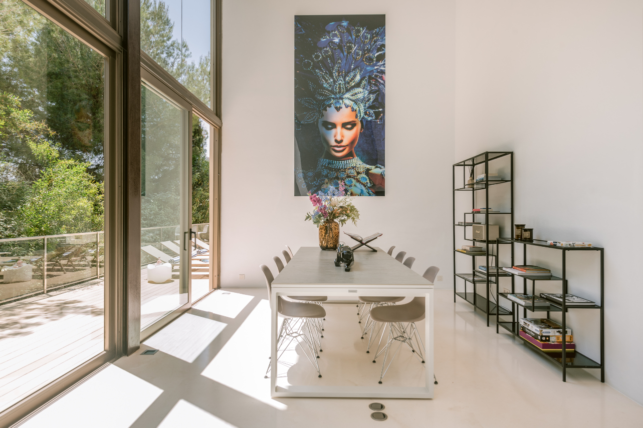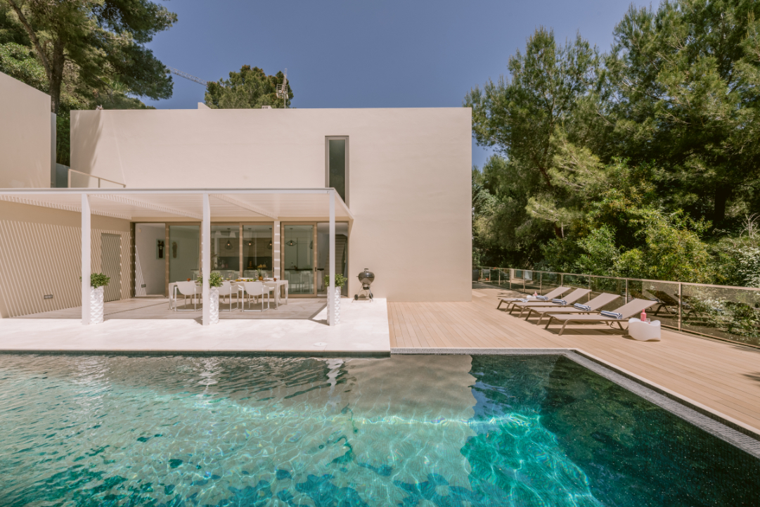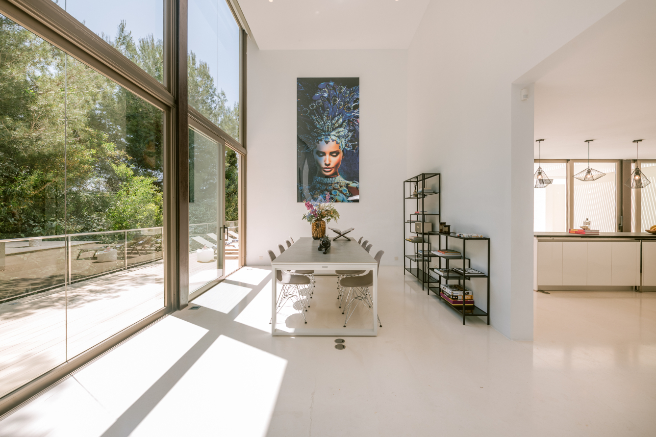 Architect Bruno Erpicum is famous for creating houses that seem to float, minimising their impact on their surroundings. Surrounded by tall trees, this impressive villa exemplifies the approach. Its lines are pure, a lot of pristine white, and then the vast expanse of glass in the double-height living room reflects the green of the forest outside, softening the ambiance. The kitchen is sleekly beautiful and innovative. Units built along the length of the wall allow for a long table, it is a sociable space. Outside is wooden decking, with a deep porch for shady al fresco dining, the pool and a staircase to a solarium for catching the winter sun. Three bedrooms, all en suite, and a peaceful office/4th bedroom on the upper floor, have private outside spaces. With its gym, steam room and easy access to Ibiza town, this villa would make a welcoming holiday home or long-term base.