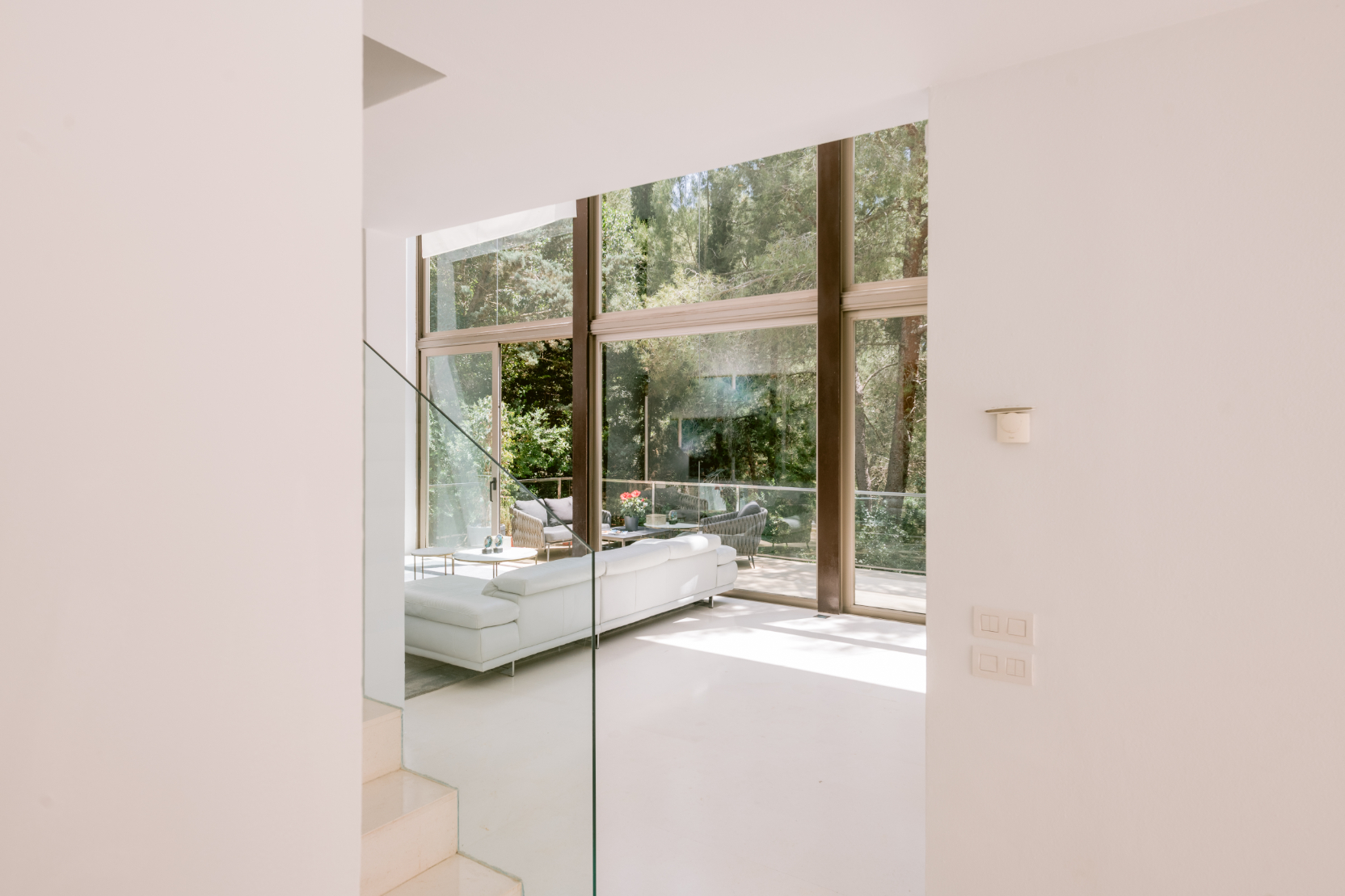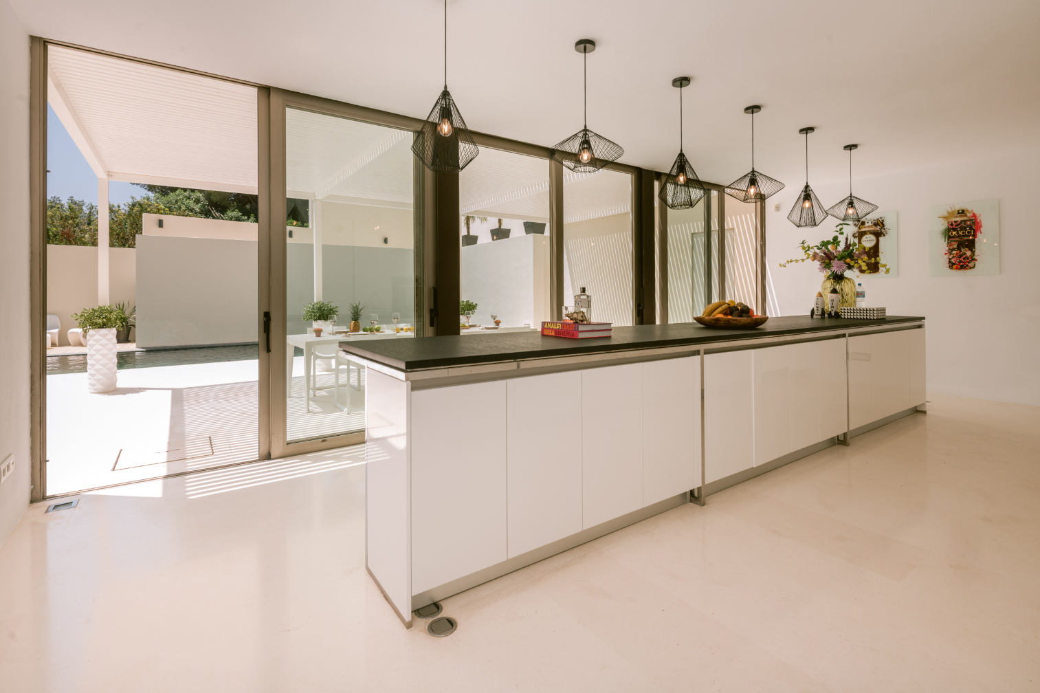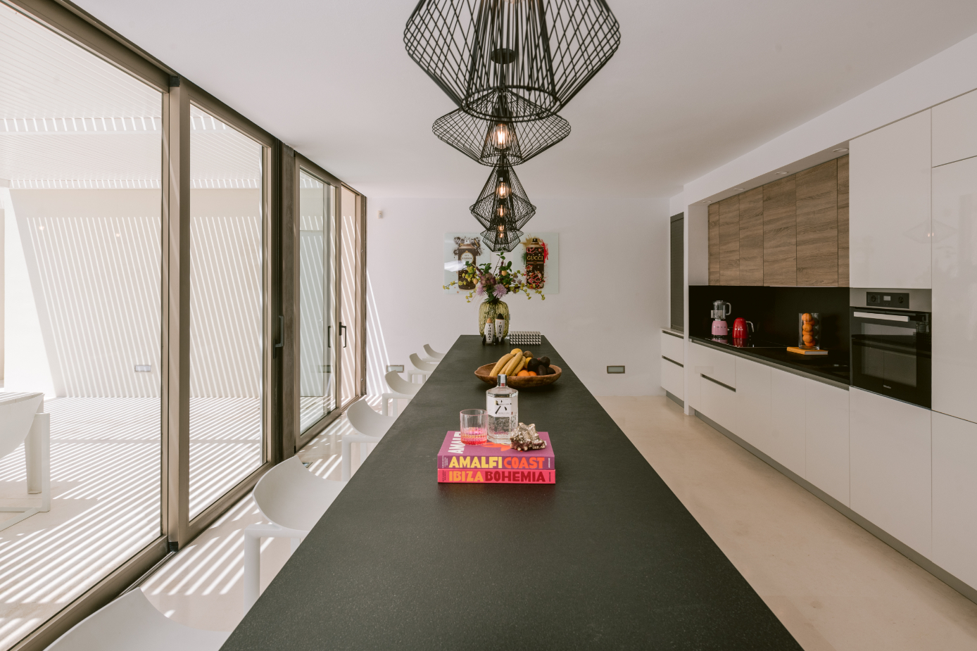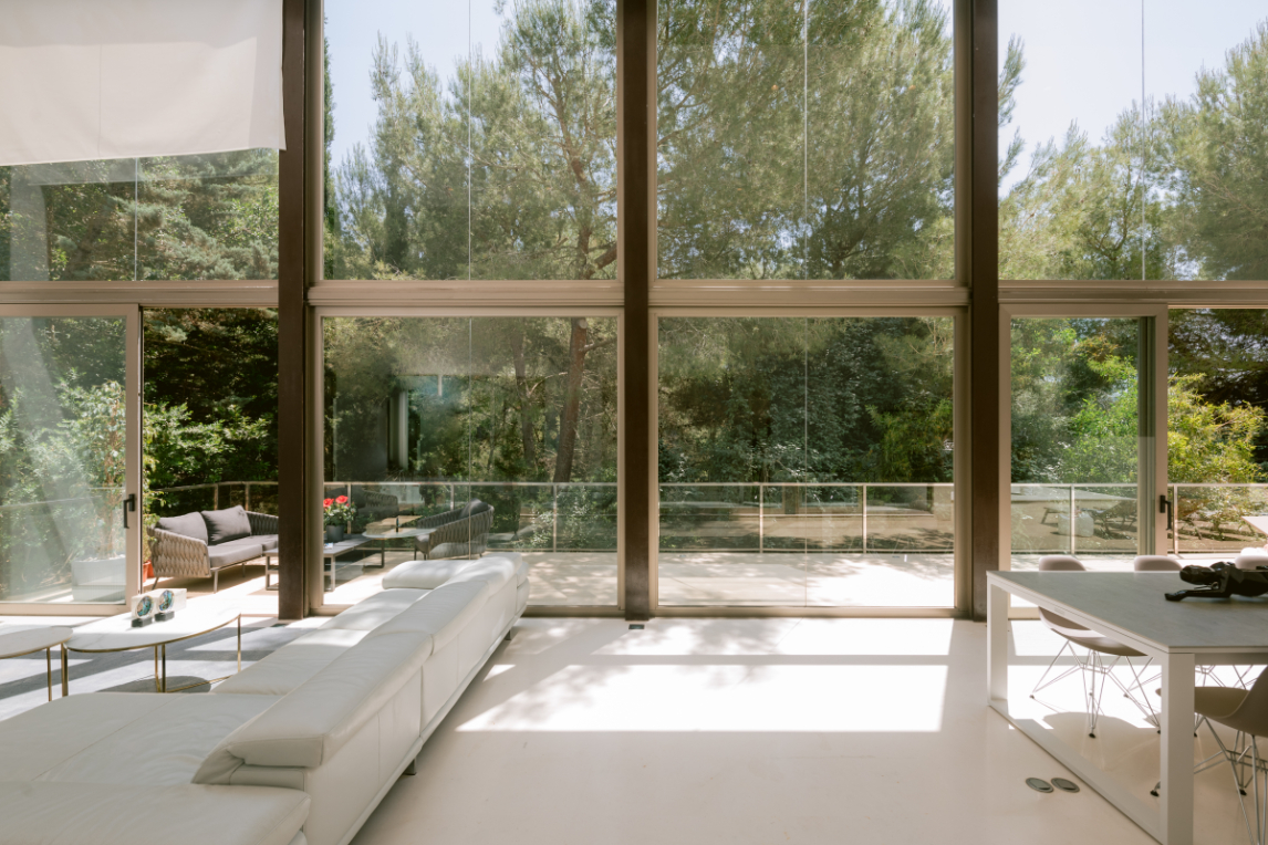 Architect Bruno Erpicum is famous for creating houses that seem to float, minimising their impact on their surroundings. Surrounded by tall trees, this impressive villa exemplifies the approach. Its lines are pure, a lot of pristine white, and then the vast expanse of glass in the double-height living room reflects the green of the forest outside, softening the ambiance. The kitchen is sleekly beautiful and innovative. Units built along the length of the wall allow for a long table, it is a sociable space. Outside is wooden decking, with a deep porch for shady al fresco dining, the pool and a staircase to a solarium for catching the winter sun. Three bedrooms, all en suite, and a peaceful office/4th bedroom on the upper floor, have private outside spaces. With its gym, steam room and easy access to Ibiza town, this villa would make a welcoming holiday home or long-term base.