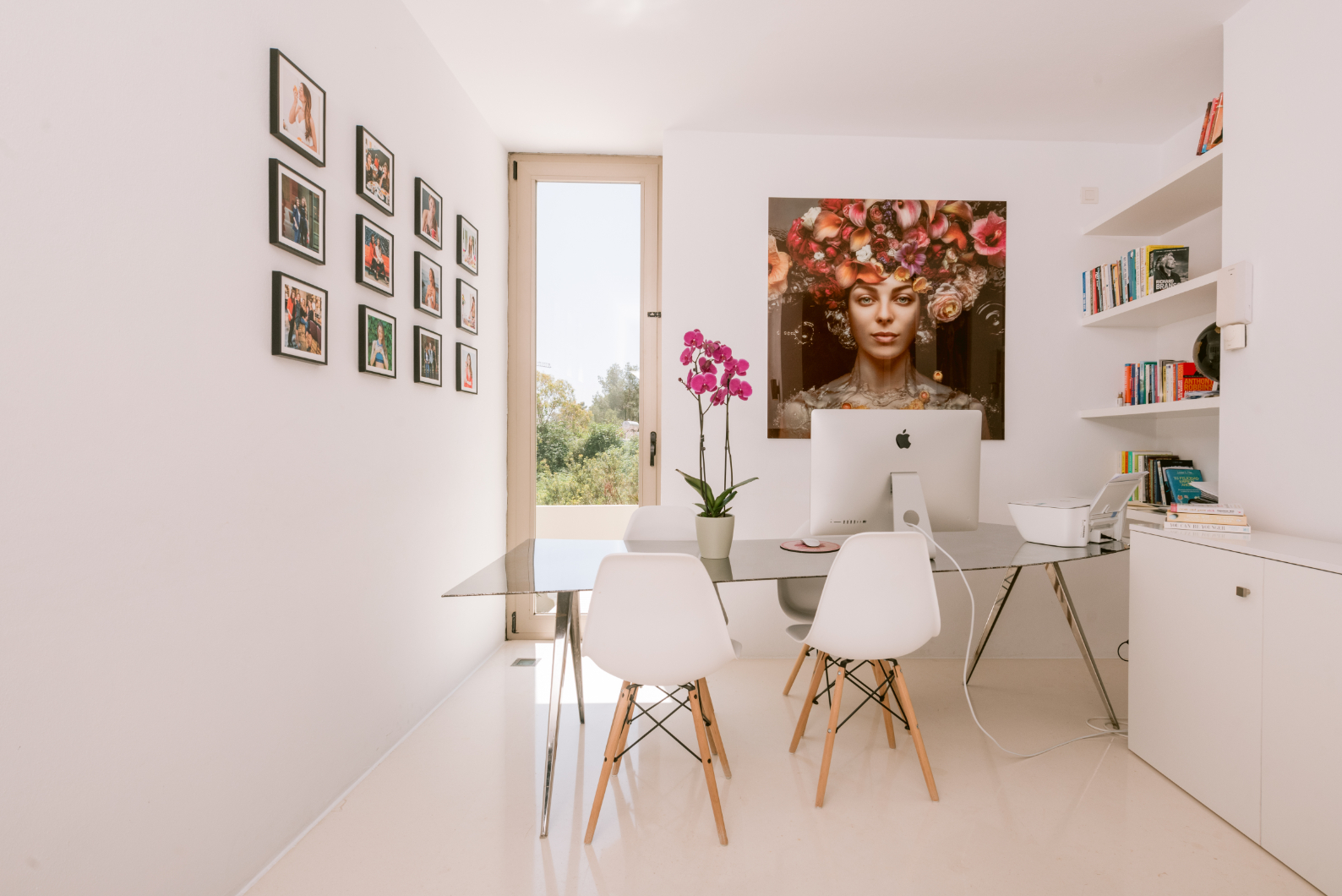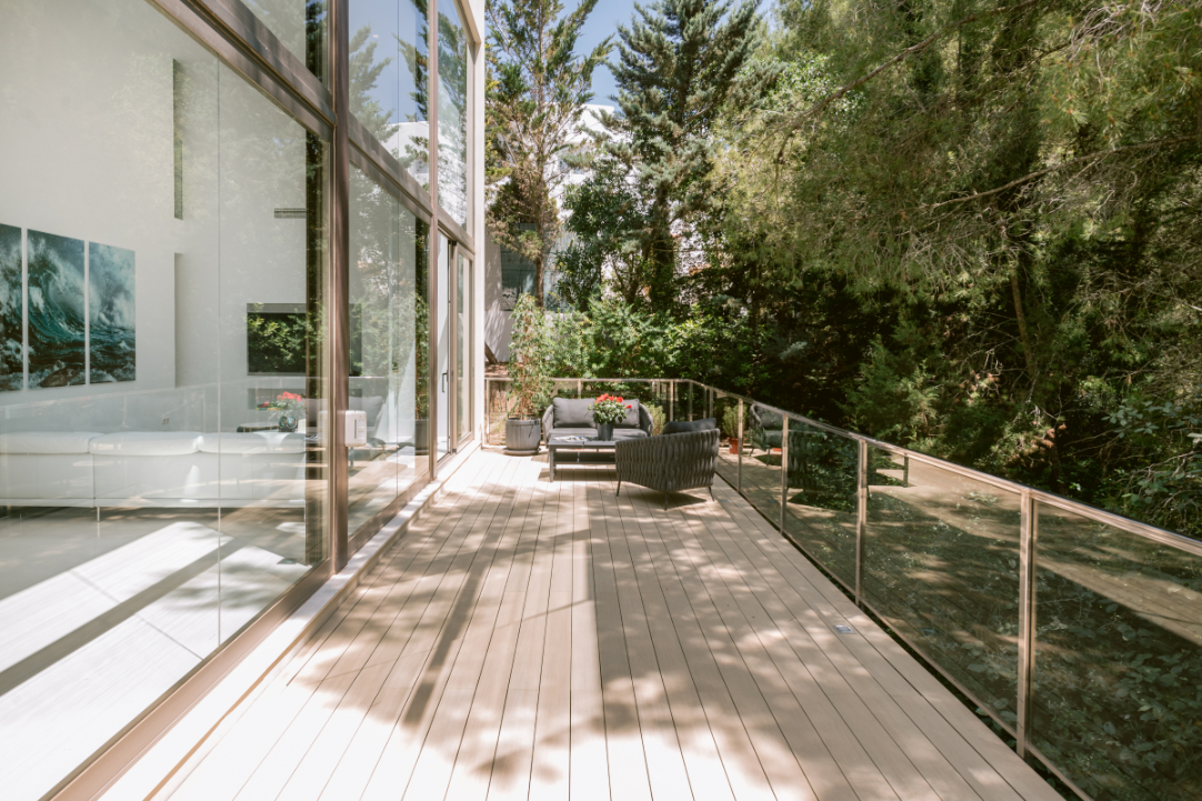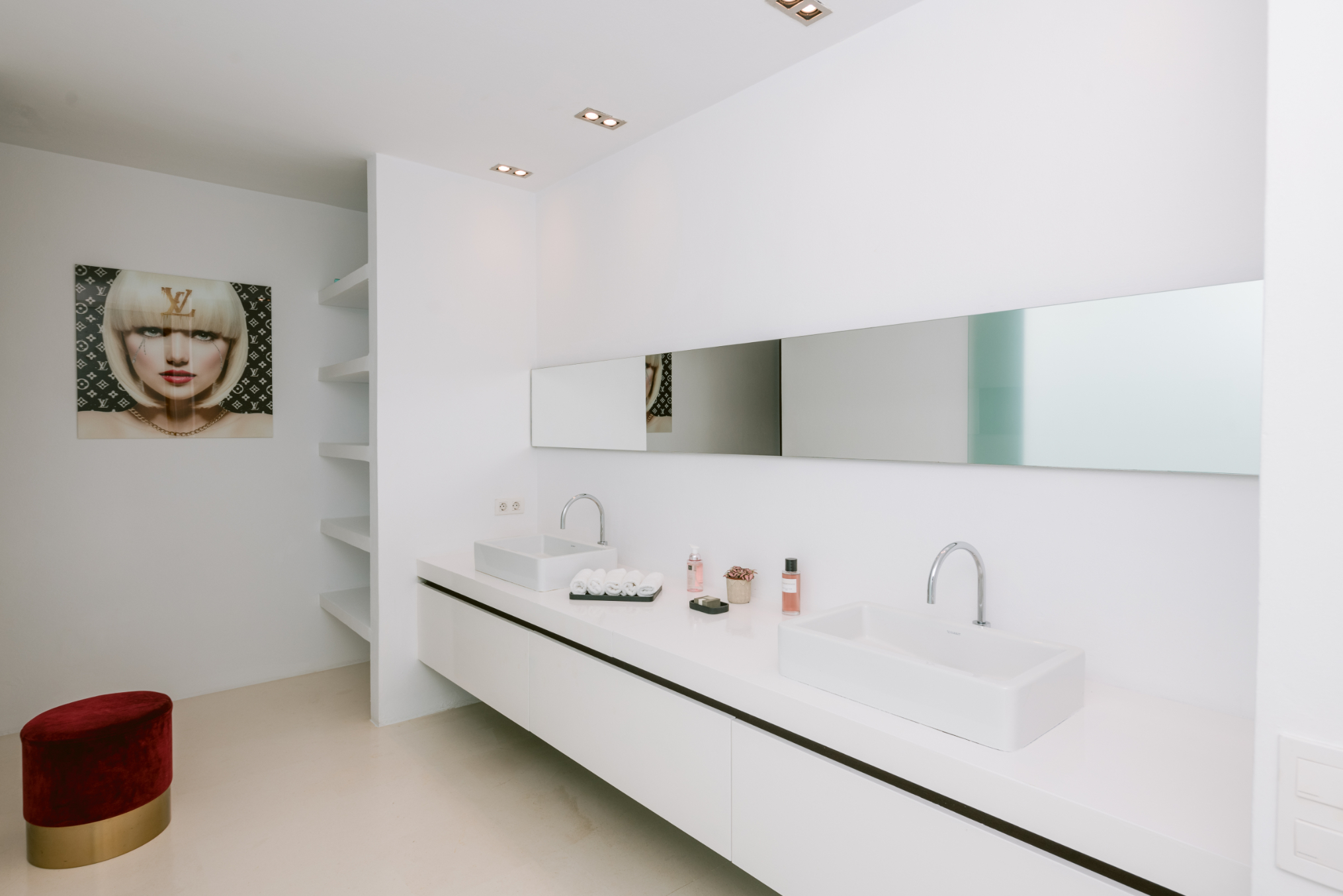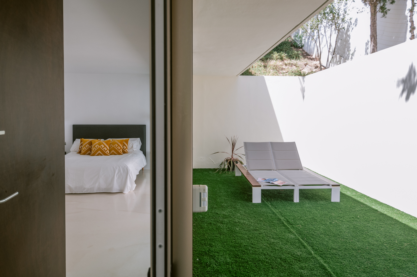 Architect Bruno Erpicum is famous for creating houses that seem to float, minimising their impact on their surroundings. Surrounded by tall trees, this impressive villa exemplifies the approach. Its lines are pure, a lot of pristine white, and then the vast expanse of glass in the double-height living room reflects the green of the forest outside, softening the ambiance. The kitchen is sleekly beautiful and innovative. Units built along the length of the wall allow for a long table, it is a sociable space. Outside is wooden decking, with a deep porch for shady al fresco dining, the pool and a staircase to a solarium for catching the winter sun. Three bedrooms, all en suite, and a peaceful office/4th bedroom on the upper floor, have private outside spaces. With its gym, steam room and easy access to Ibiza town, this villa would make a welcoming holiday home or long-term base.