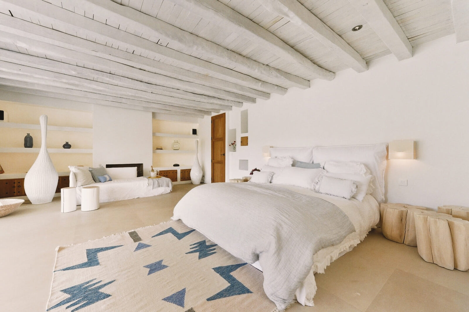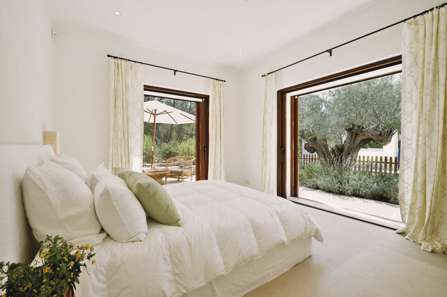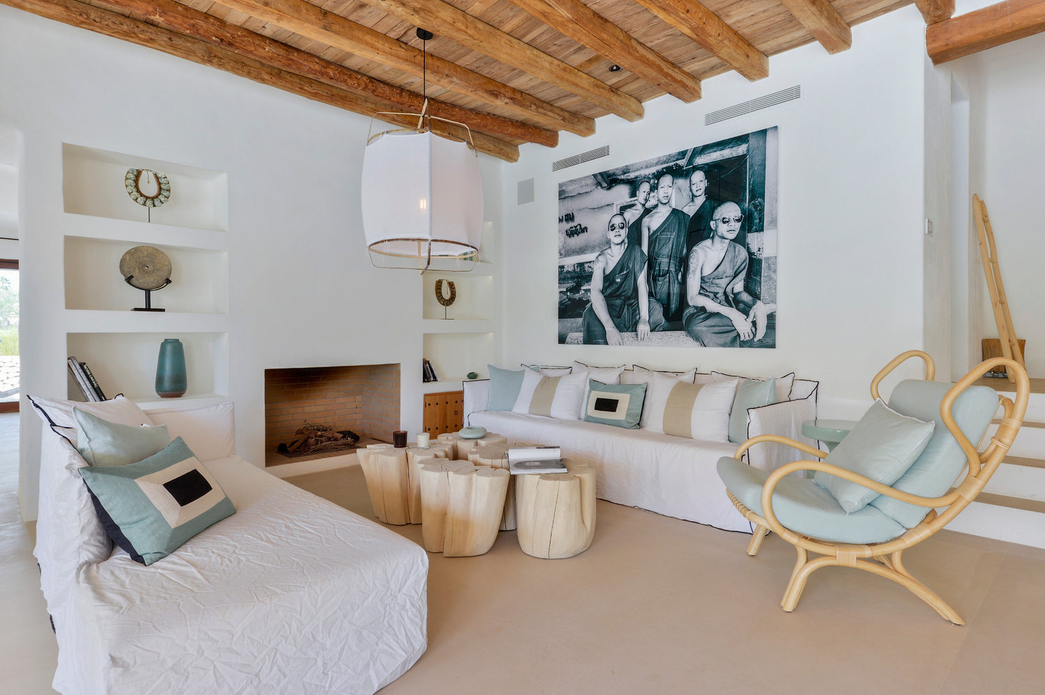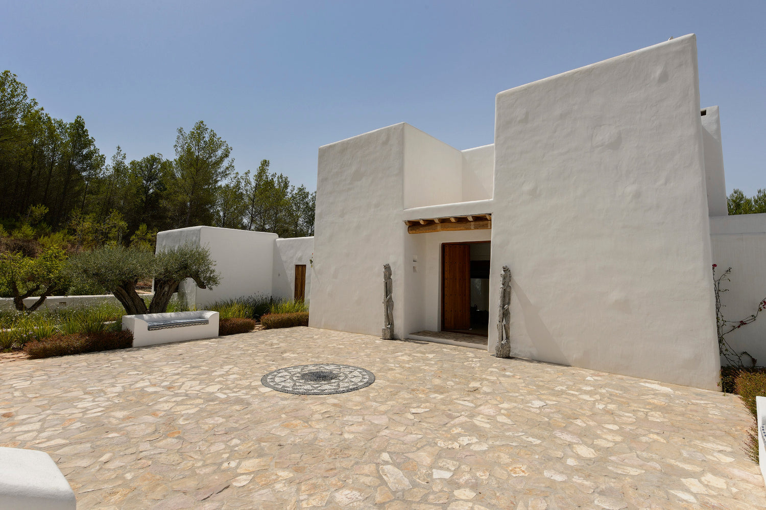 This light-filled villa is pure Blakstad, the remarkable Ibizan architecture and design company whose work pays homage to the white island. Reverence to traditional features and materials alongside subtle luxury resonates throughout this harmonious home. Bewitching design features – the magnificent wooden door, the intricate mosaic as you cross the entrance courtyard, and the sense of space, are all hallmark Blakstad. Cool interiors centre on the living area where lounging, dining, and chill out areas are respectfully spaced. Four pretty guest bedrooms, each with an ensuite, occupy wings to either side. The master suite presides over the upper floor, with views over pine-clad hills from its terrace and from the free-standing bath in its large bathroom. Beautifully planted landscaped gardens surround the large salt-water pool welcoming that alfresco life, part of Ibiza’s magic: dining under the stars, drifting with a book on a sumptuous sofa, the laughter of children at play.