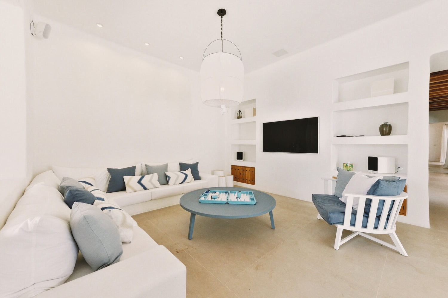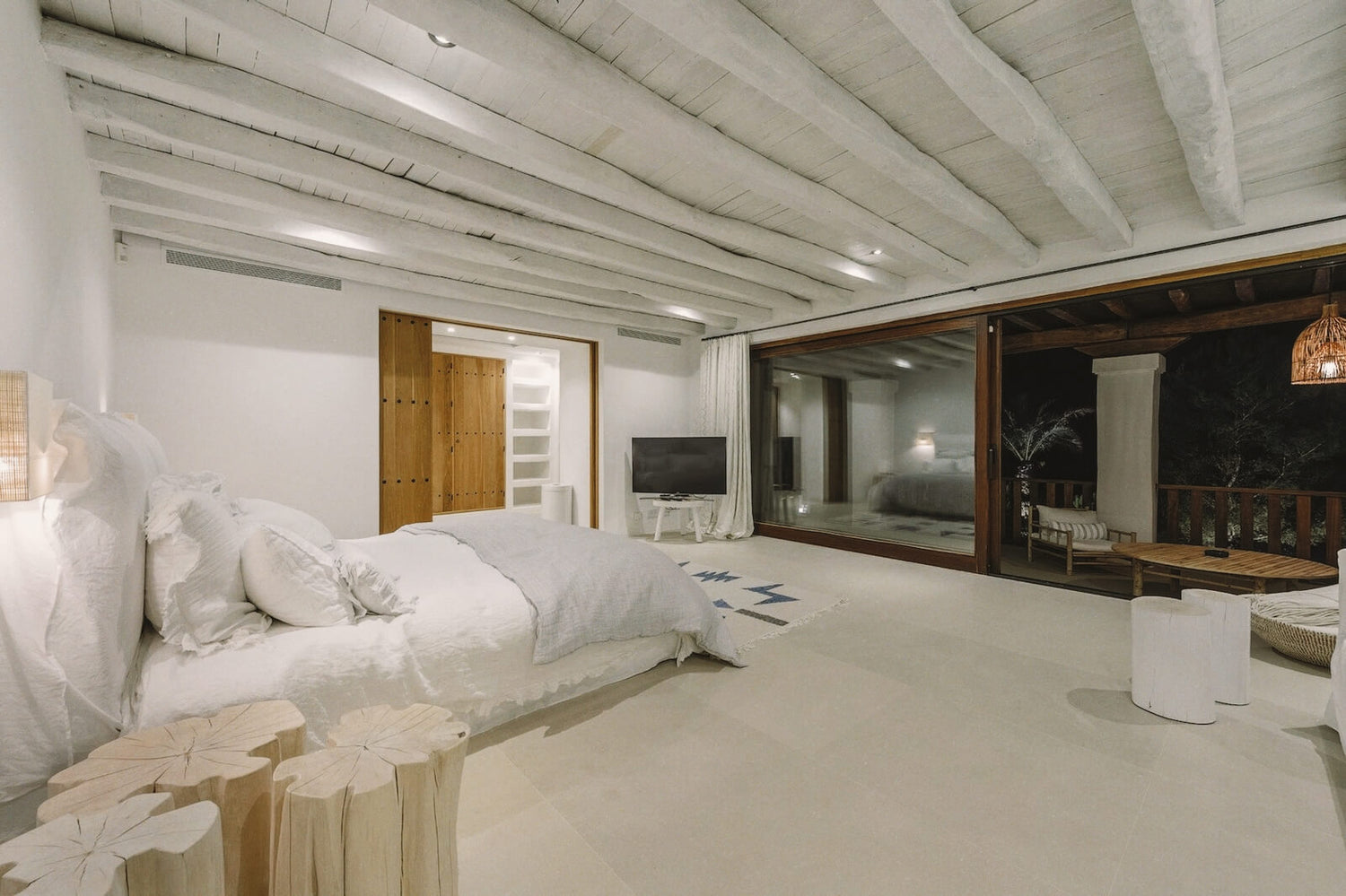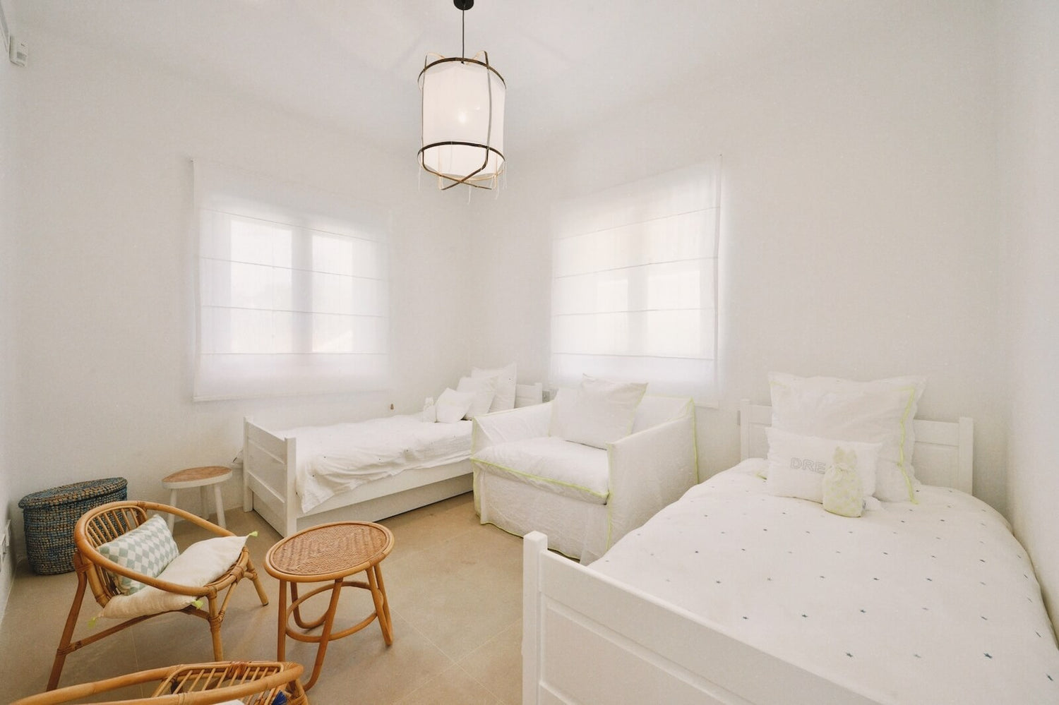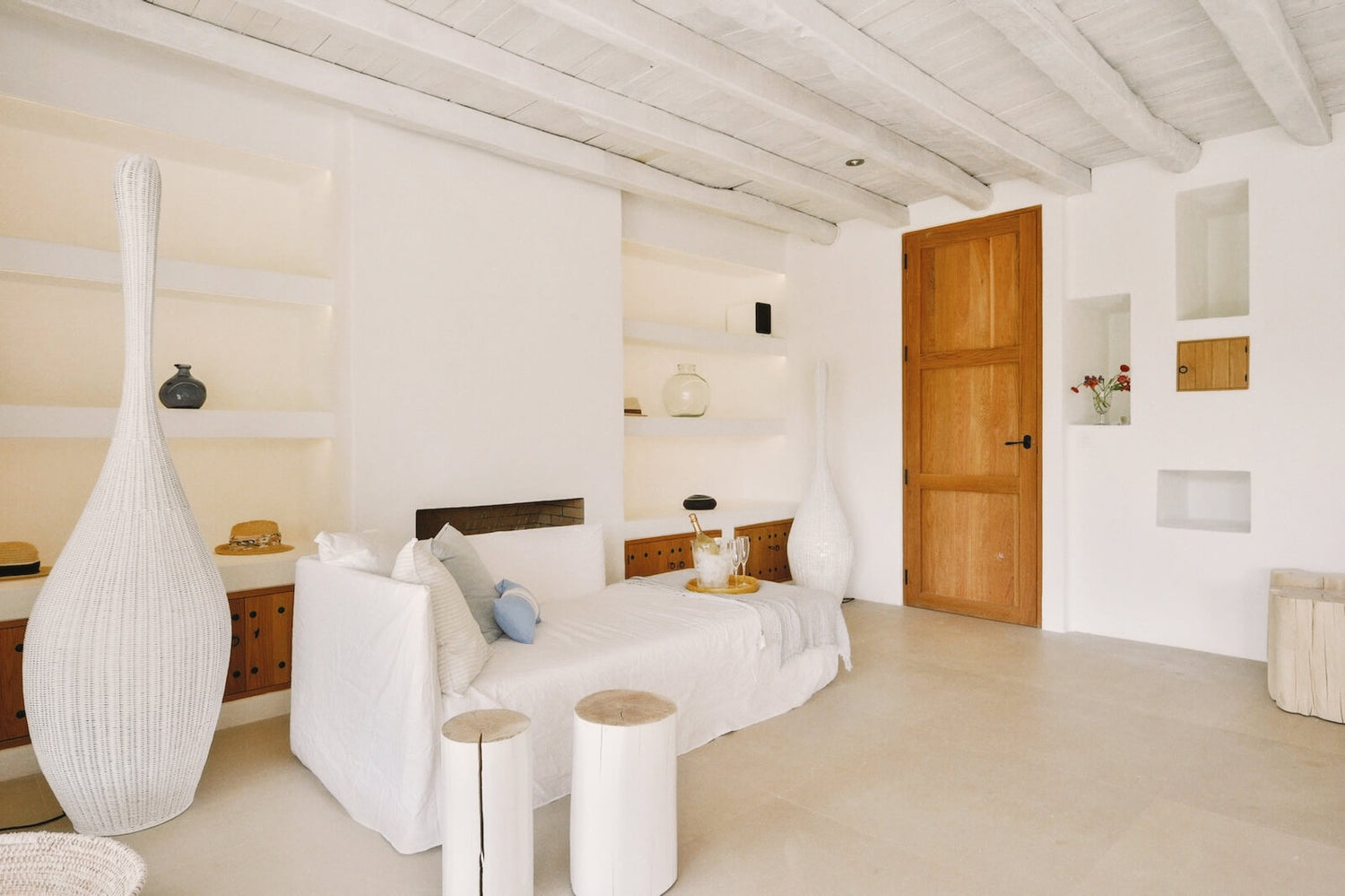 This light-filled villa is pure Blakstad, the remarkable Ibizan architecture and design company whose work pays homage to the white island. Reverence to traditional features and materials alongside subtle luxury resonates throughout this harmonious home. Bewitching design features – the magnificent wooden door, the intricate mosaic as you cross the entrance courtyard, and the sense of space, are all hallmark Blakstad. Cool interiors centre on the living area where lounging, dining, and chill out areas are respectfully spaced. Four pretty guest bedrooms, each with an ensuite, occupy wings to either side. The master suite presides over the upper floor, with views over pine-clad hills from its terrace and from the free-standing bath in its large bathroom. Beautifully planted landscaped gardens surround the large salt-water pool welcoming that alfresco life, part of Ibiza’s magic: dining under the stars, drifting with a book on a sumptuous sofa, the laughter of children at play.