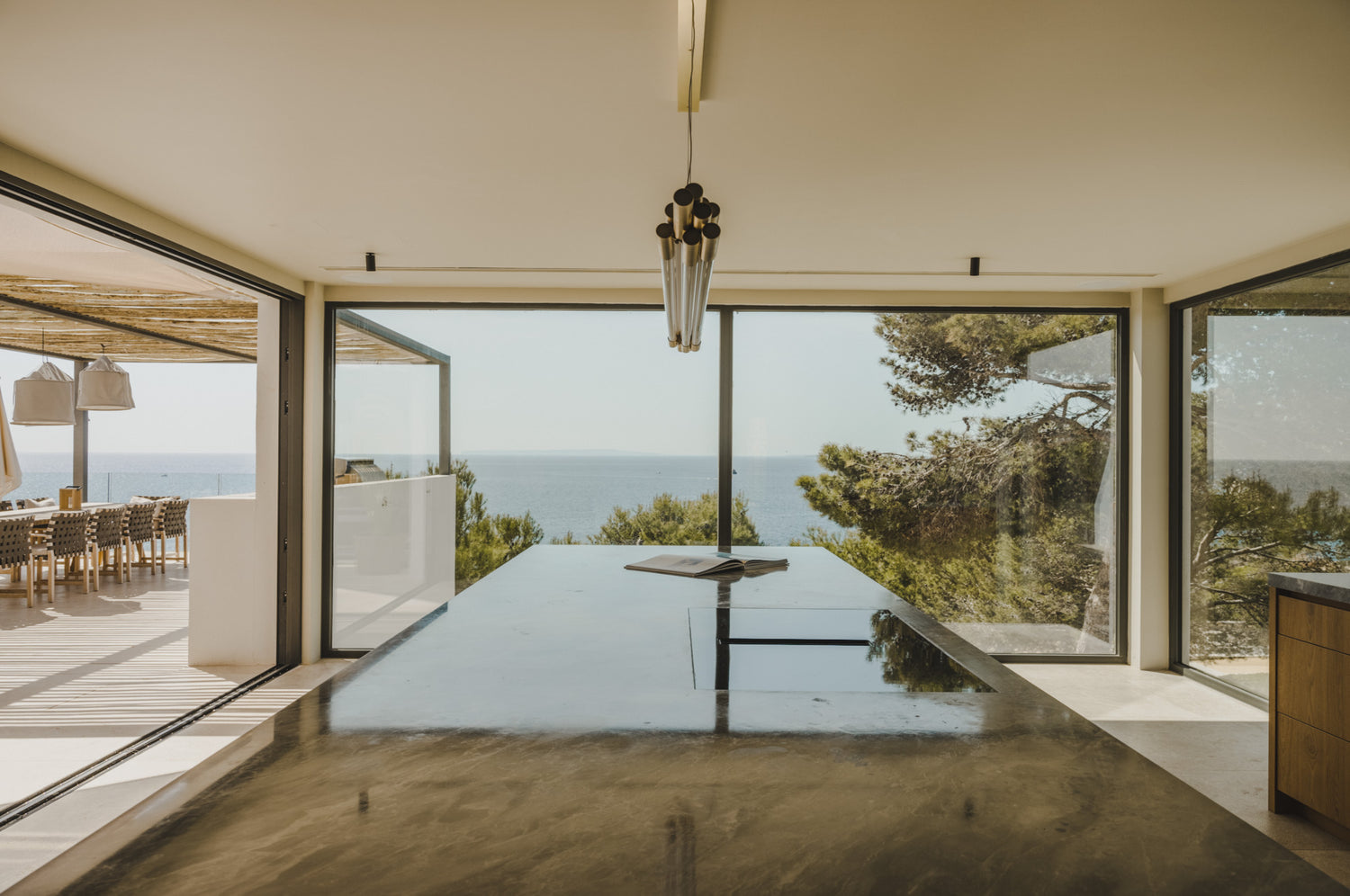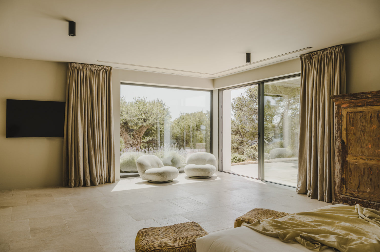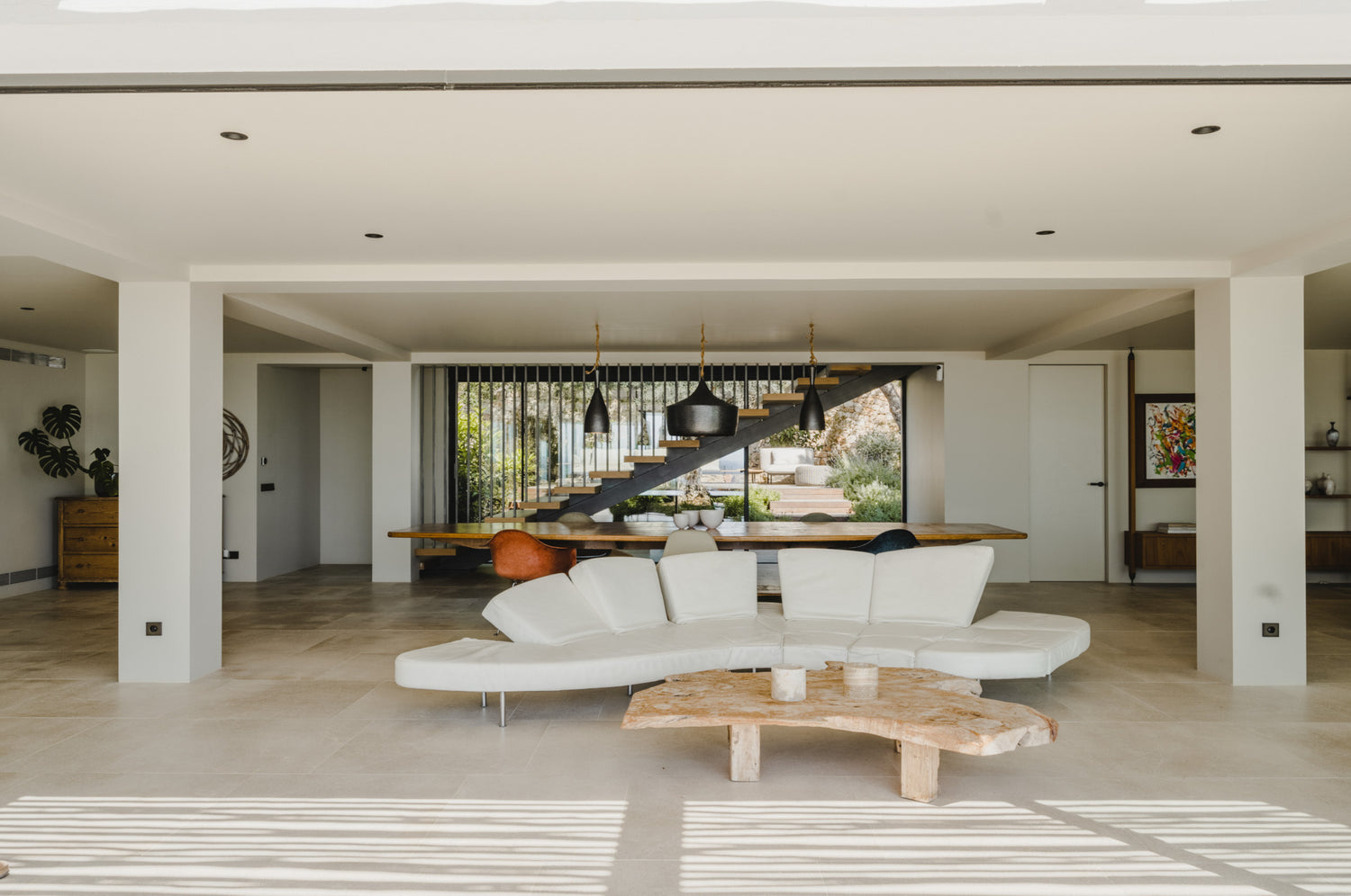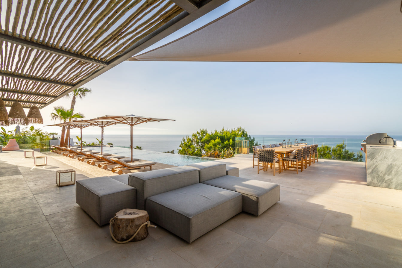 The view of the sea is a constant at this gleaming white villa, from every luminous living space and every lovely terrace. Vast panes of glass slide to create a flow between inside and out. The use of natural materials, the colours of driftwood and some vibrant artwork and boho fabrics create a relaxing island living vibe and yet this this is also a sophisticated kind of beach house. The six bedrooms are all ensuite, everywhere is cooled by Bluetooth controlled air-conditioning and there are Sonos systems inside and out. The sleek kitchen has state-of-the-art appliances and spills out onto the terrace through more sliding windows to a long table for alfresco dining under the stars. As well as the terraces and the deck with the 22m long pool, there are gardens fragrant with pine trees and herbs. It is set in the exclusive community of Roca Lisa where 24-hour security ensures peace and privacy.