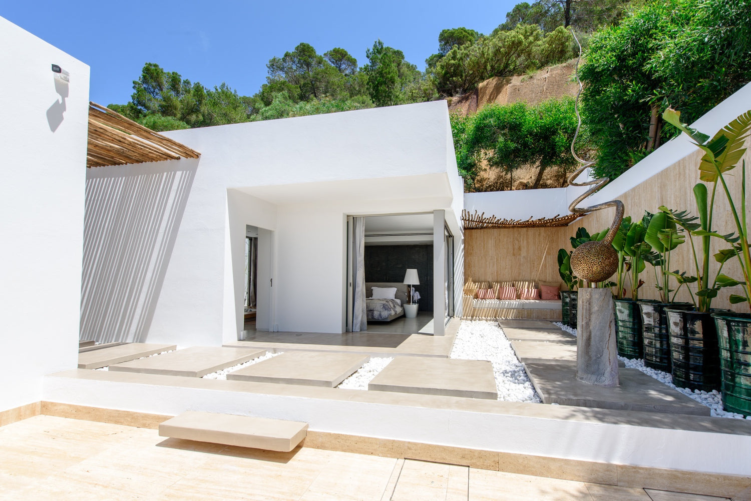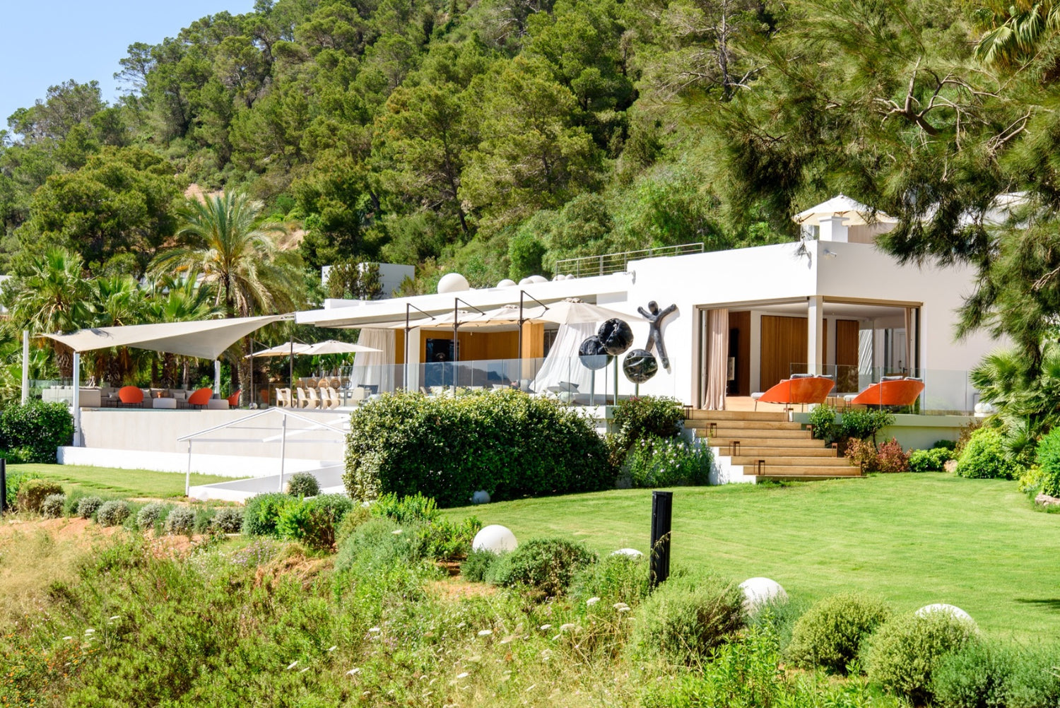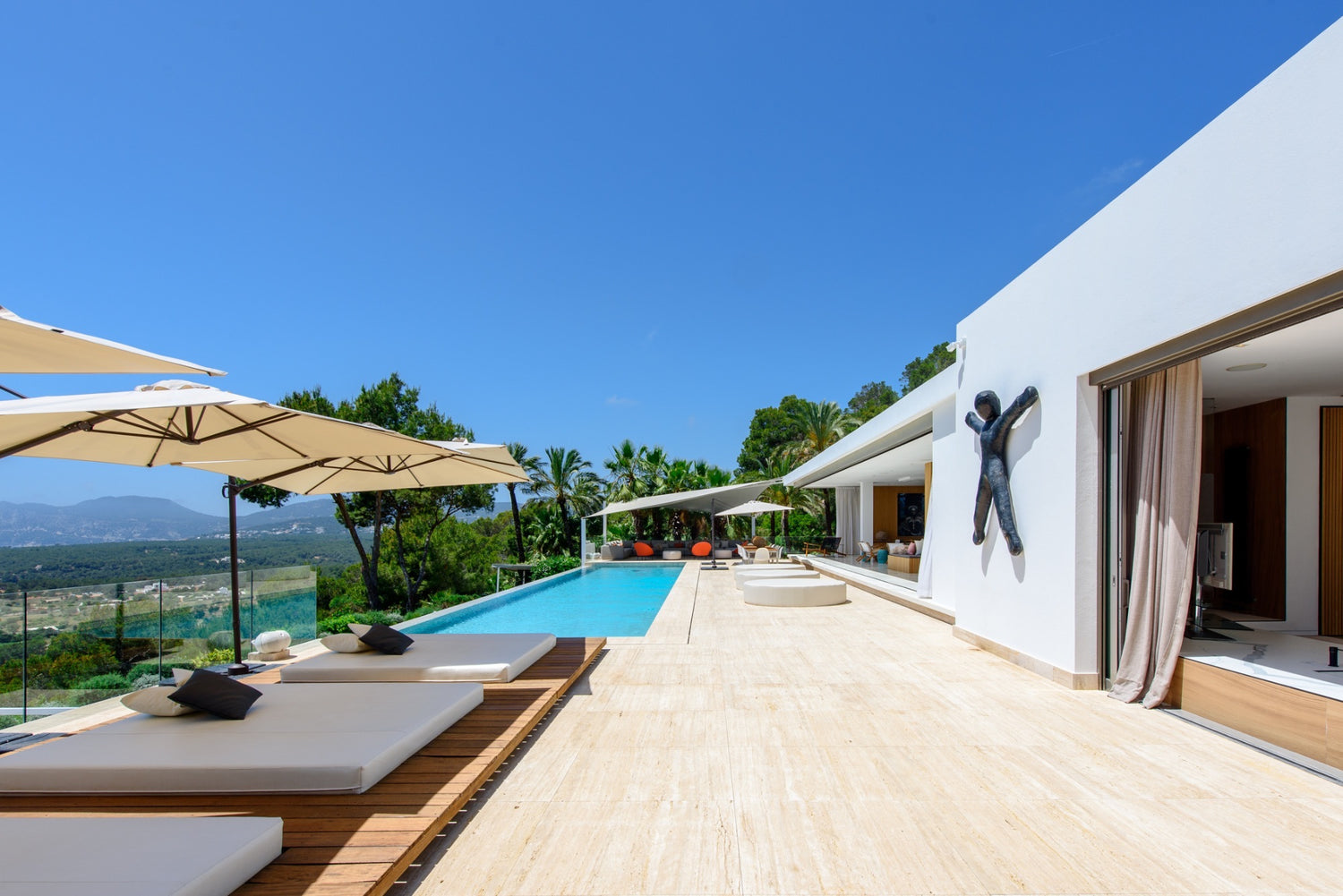 Can Condor nestles into the hillside, its discrete profile belying the fabulous experience within its secure domain. Exclusive and private, there are three ensuite bedrooms but they are all seriously opulent and open onto terraces. There is plenty of space and a professional standard kitchen from which to entertain lavishly, tunes to reflect the vibe of your party wafting through the house from the Sonos system. Interior and exterior blend, apparently seamlessly, across the open plan living area with its beautiful furniture curated to create an ambiance of sophisticated cool. The views from the terrace reach past the resplendently long swimming pool to the pretty bays of Ibiza’s southern coast. Gardens spill over lawns to hidden nooks with funky chill-out zones. Night-time lighting turns it into an enchanted paradise. A recreation room with cinema, unique billiard table and state-of-the-art gym equipment ensures that every moment of your Ibiza experience is sensational.