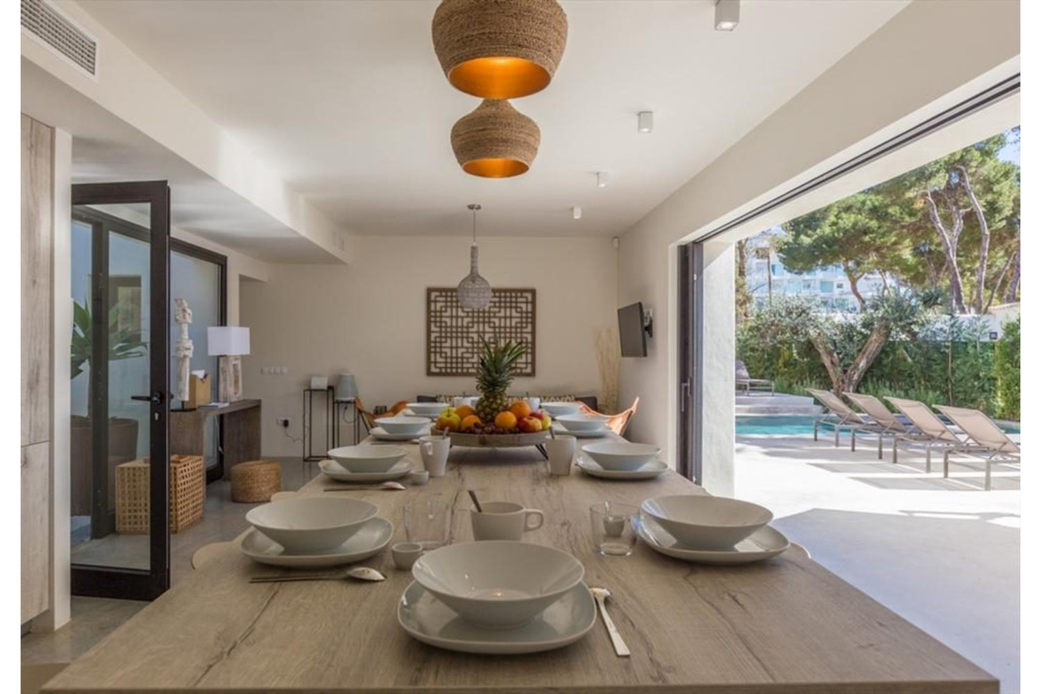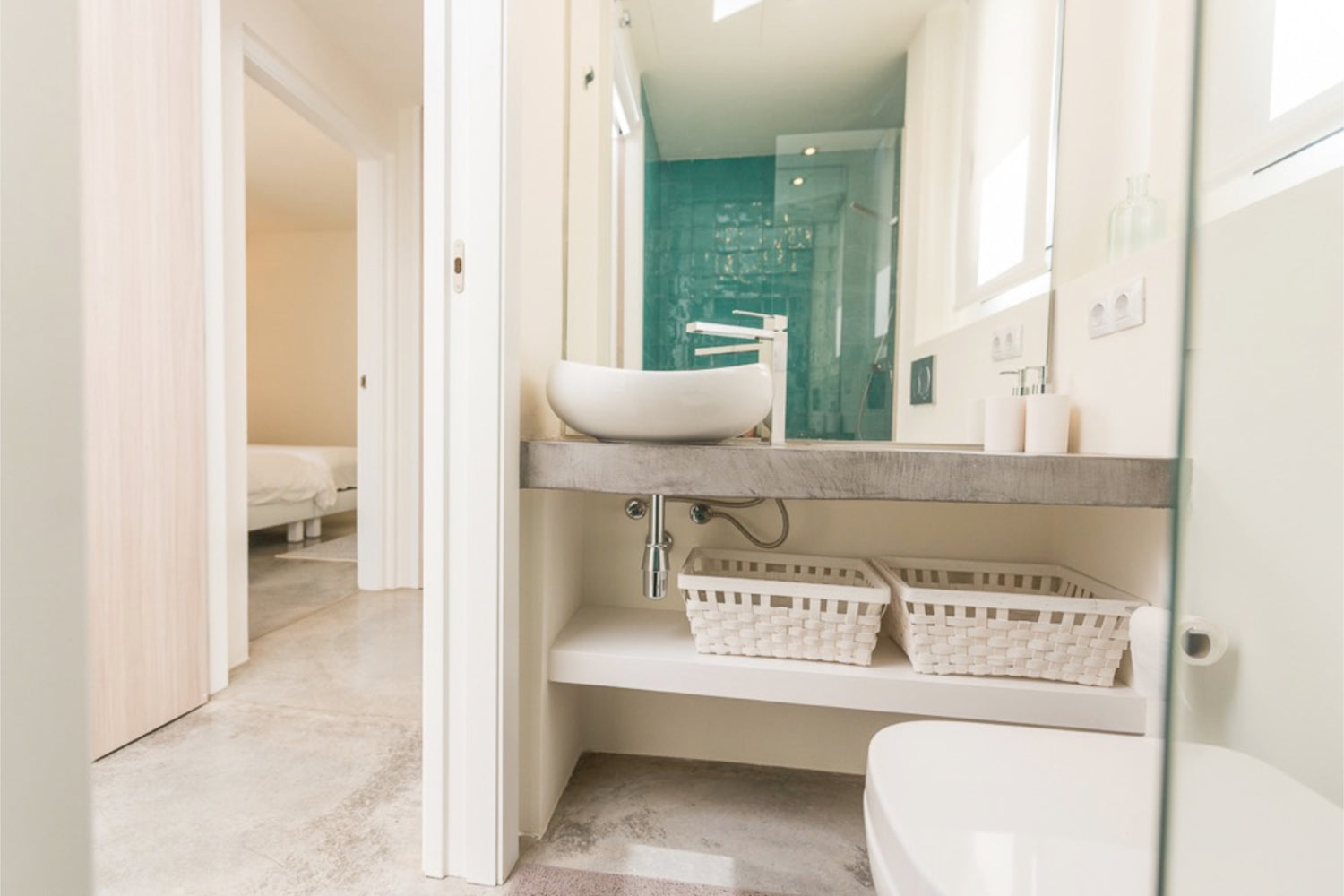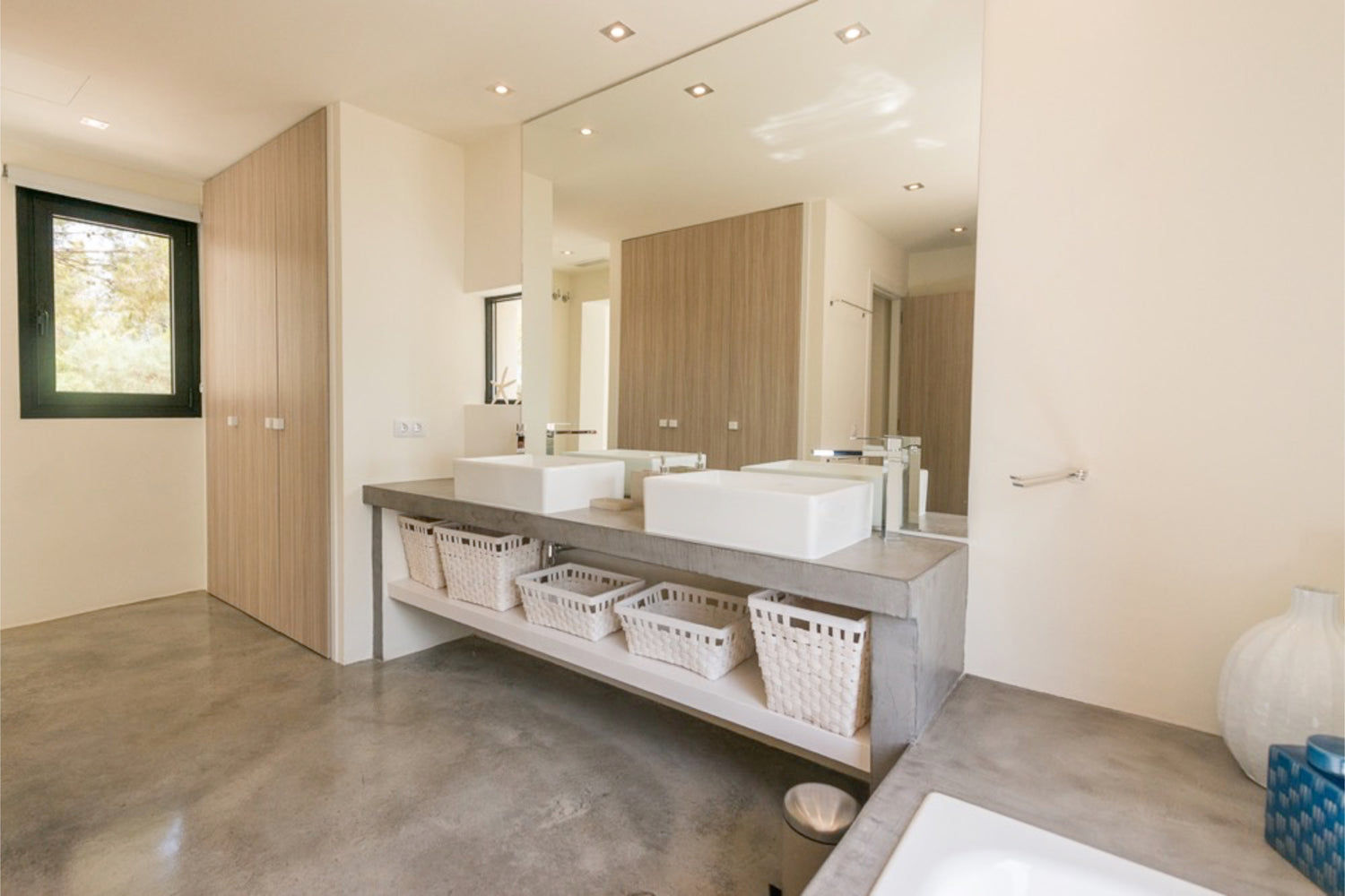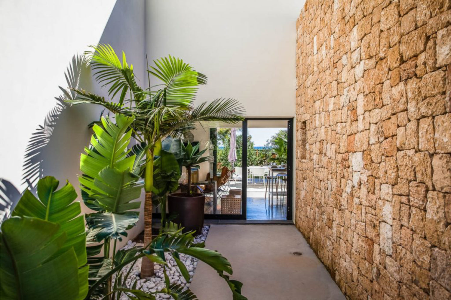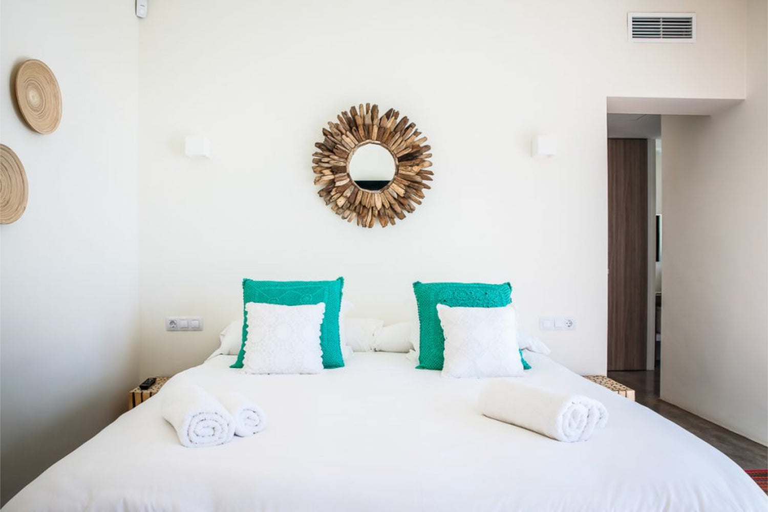 This charming villa does beach life in style. It is a few steps away from a scenic coastal path that leads to idyllic spots to swim, to play, and to wine and dine close to the water. Its own private pool is secluded behind greenery and surrounded by sunbeds. Modern but sympathetically constructed with sand-coloured stone, the house is a cool calm refuge with a contemporary twist, including a well-equipped kitchen. Its décor is serenely seaside, gentle hues of bleached wood and splashes of colour setting off carefully selected items of beautifully designed furniture. Four of the double bedrooms occupy the ground floor, all with ensuites with walk-in showers. Upstairs, the spacious master has a bathroom with a bathtub as well as a shower and access to a roof terrace. From here, the view over the water to the little islands that dot Ibiza’s coast is mesmerising, night and day.