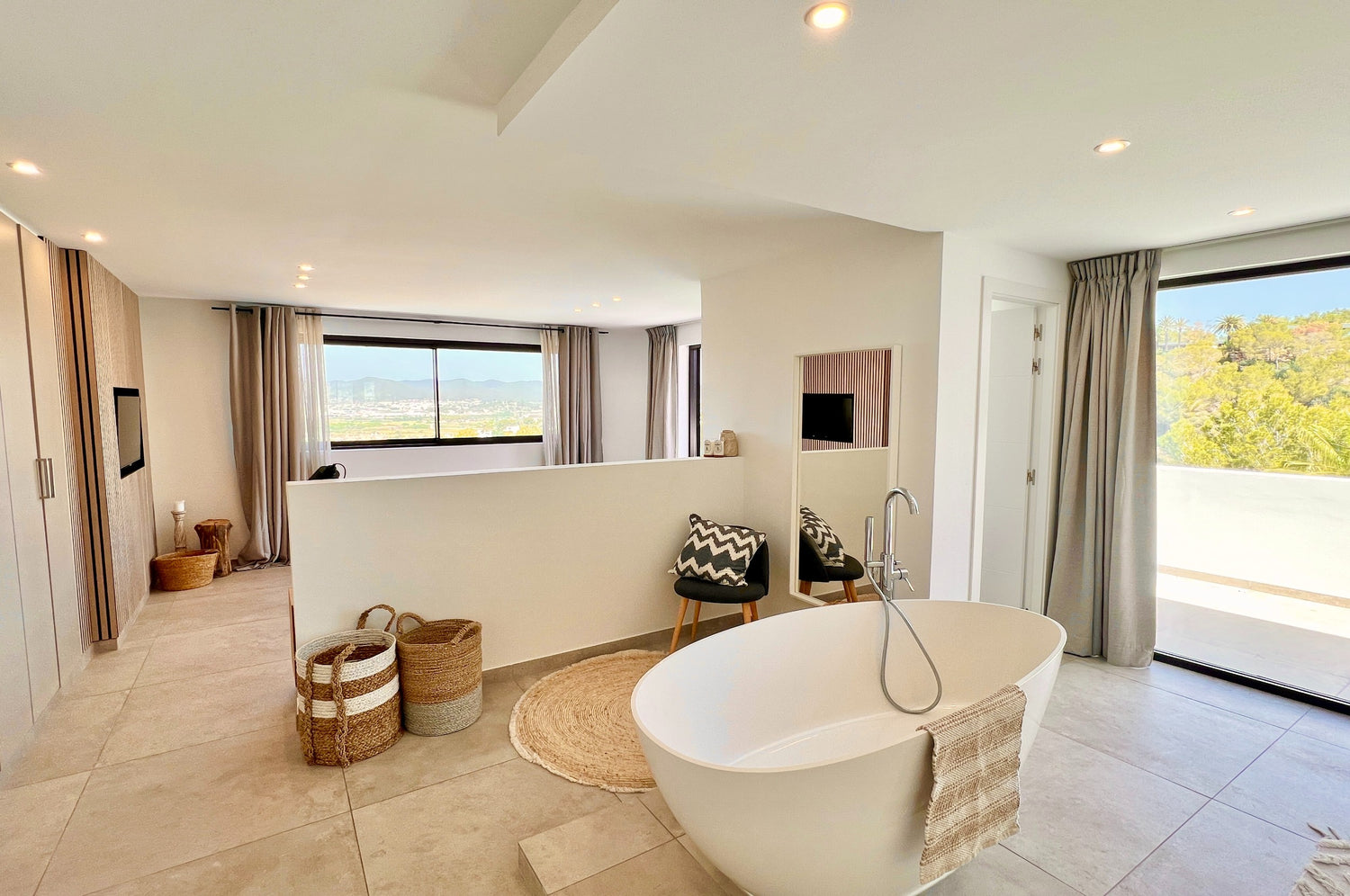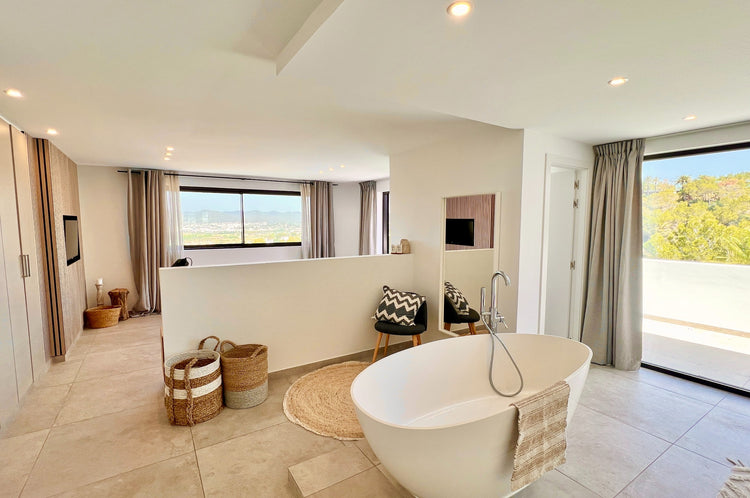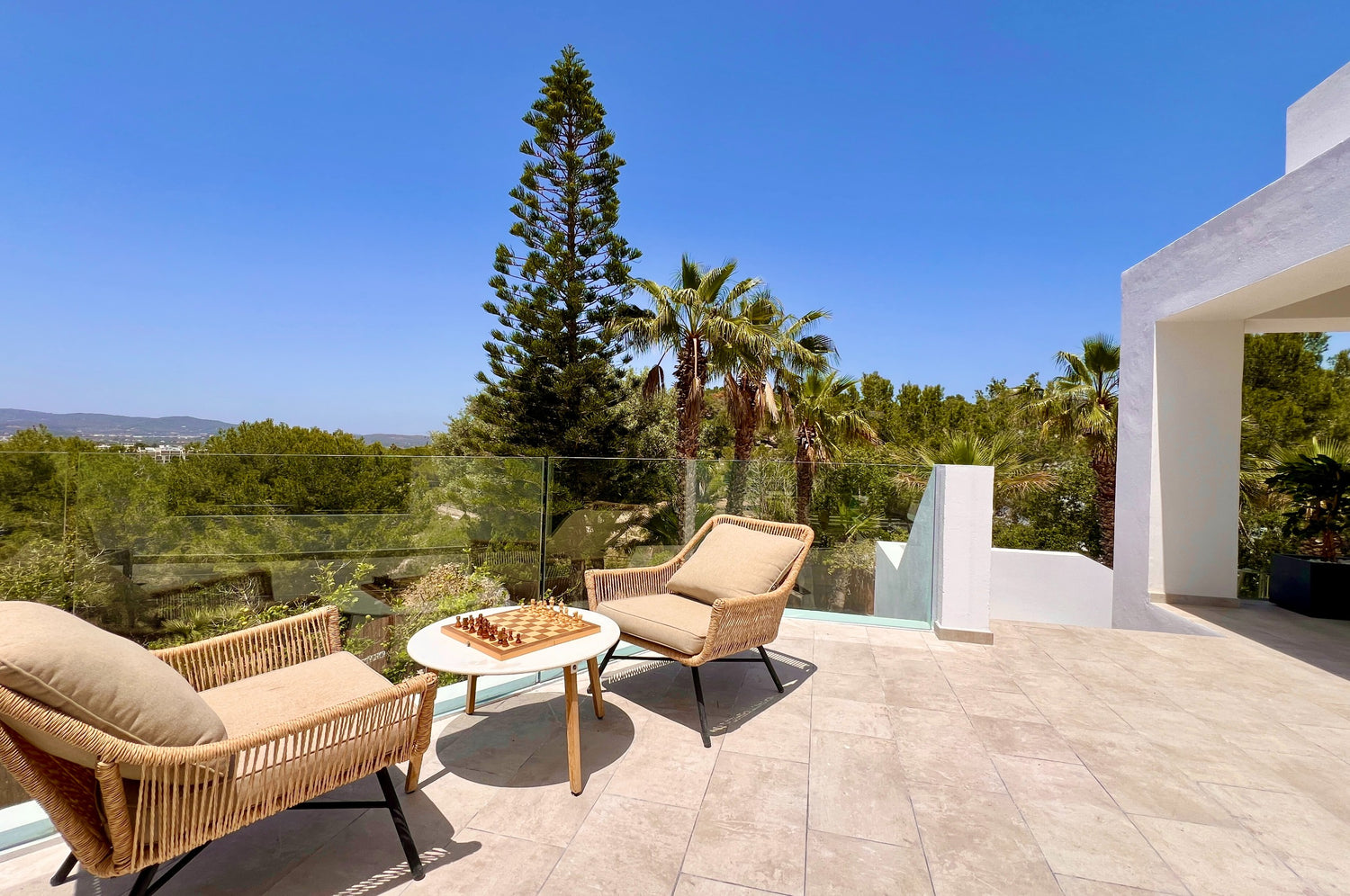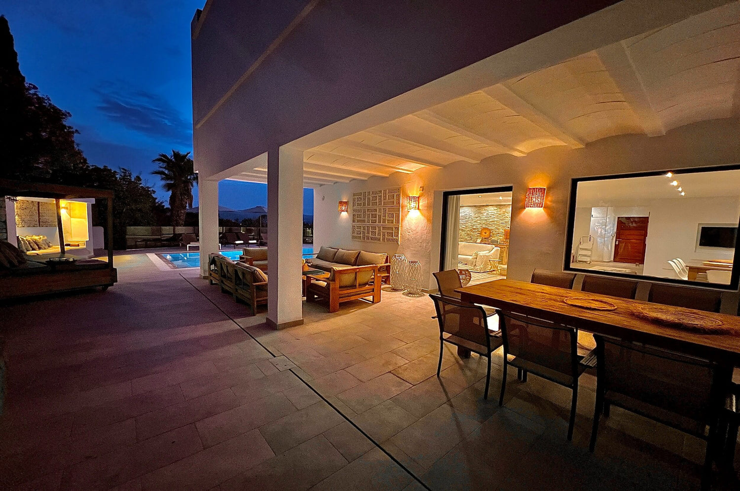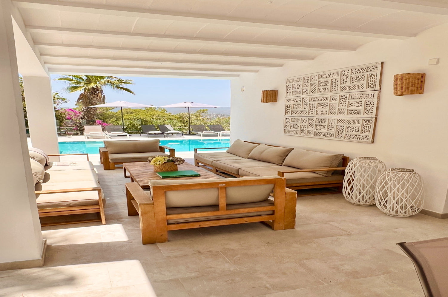 This elegantly appointed Ibiza villa features panoramic views, a spacious terrace for outdoor dining, luxurious amenities, and convenient proximity to both the beach and vibrant nightlife.