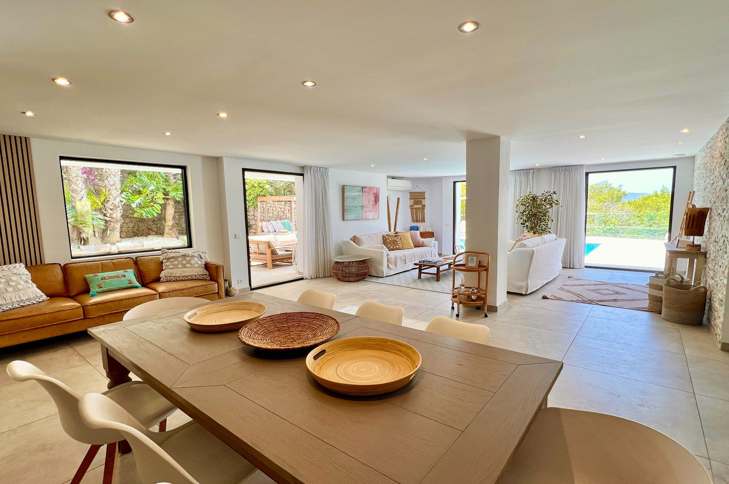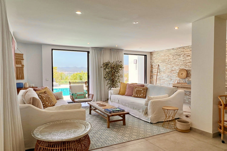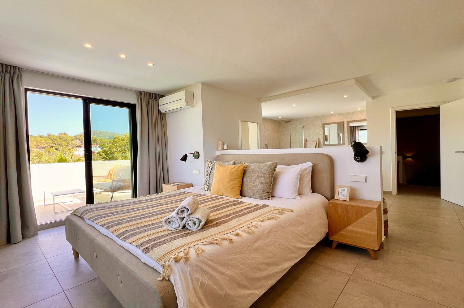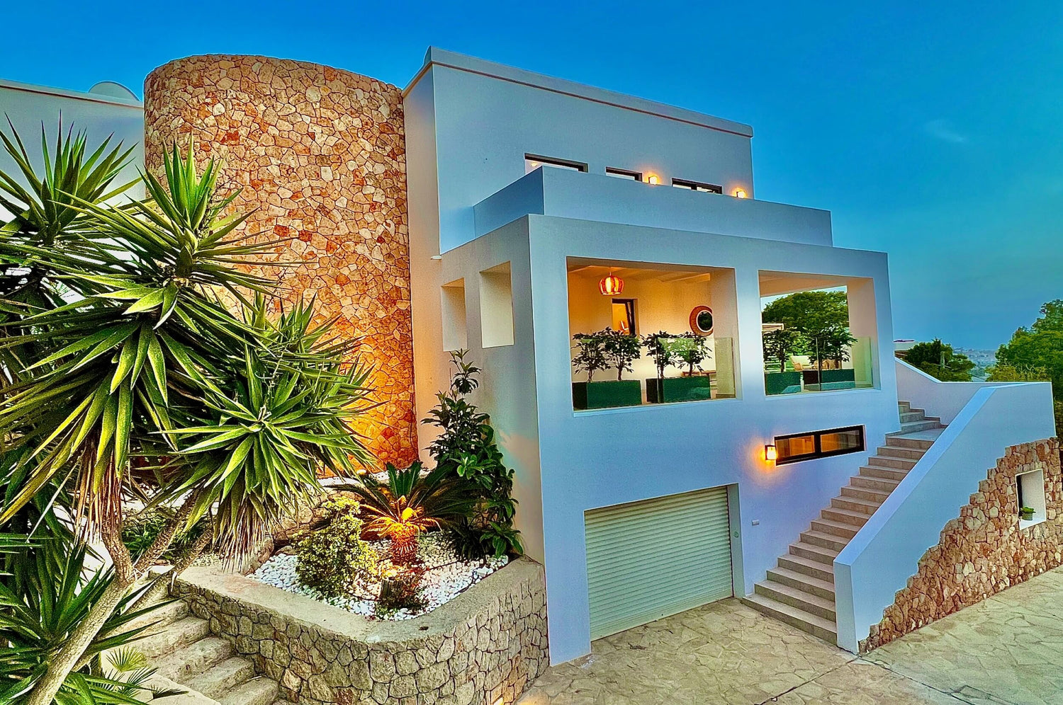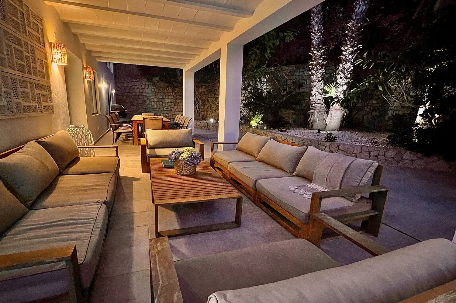 This elegantly appointed Ibiza villa features panoramic views, a spacious terrace for outdoor dining, luxurious amenities, and convenient proximity to both the beach and vibrant nightlife.