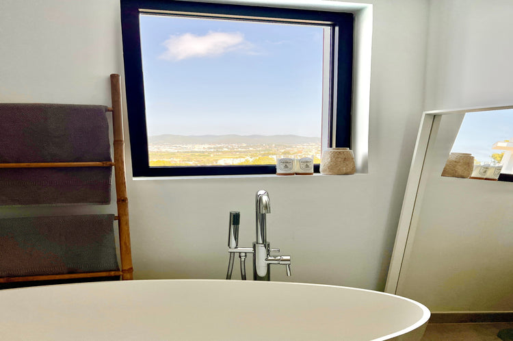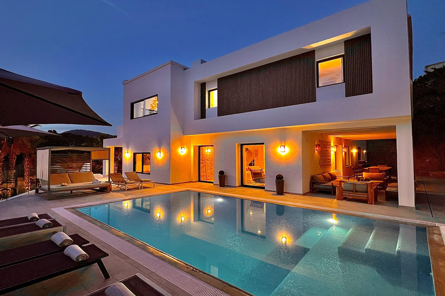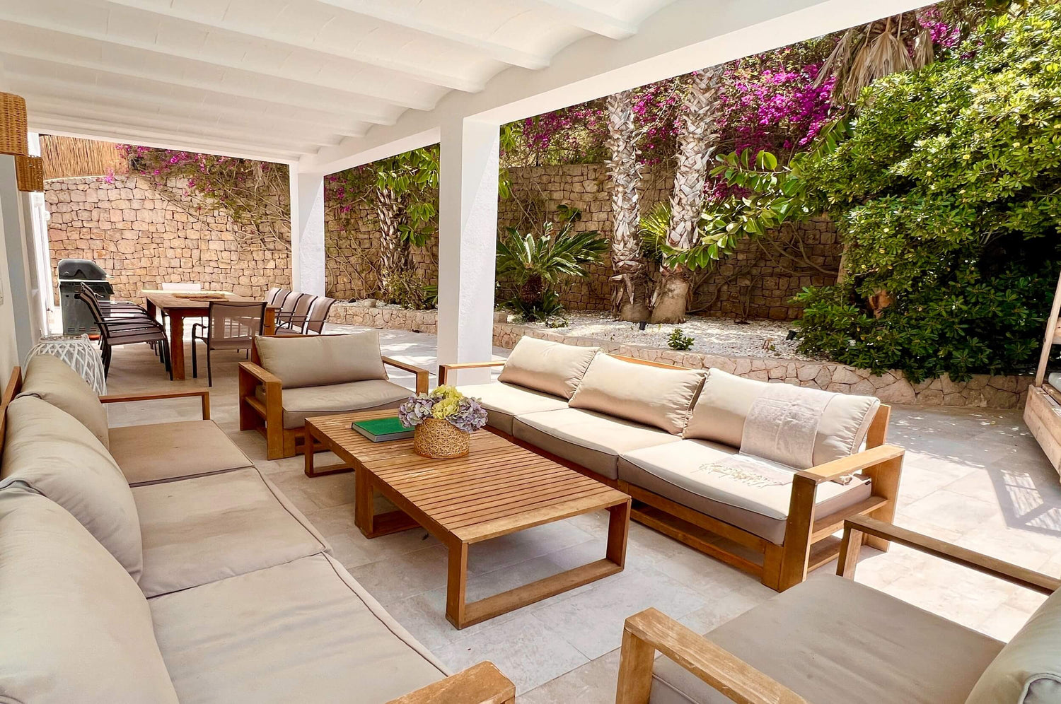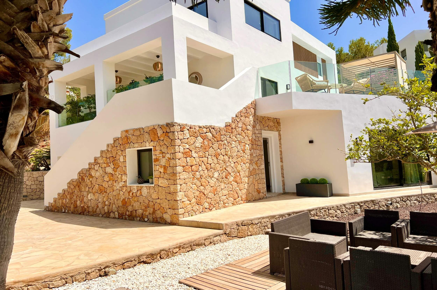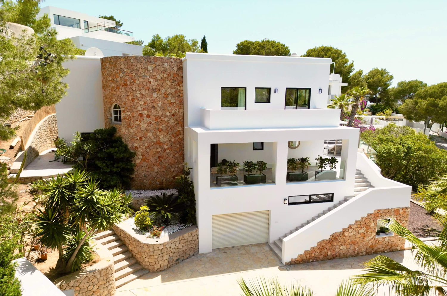 This elegantly appointed Ibiza villa features panoramic views, a spacious terrace for outdoor dining, luxurious amenities, and convenient proximity to both the beach and vibrant nightlife.