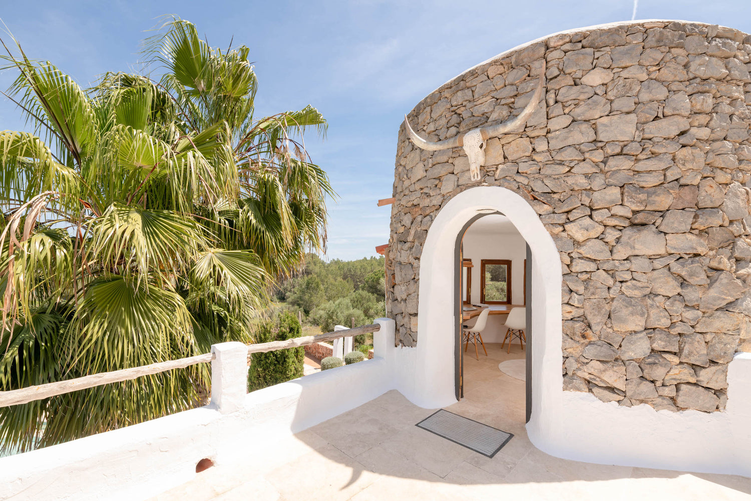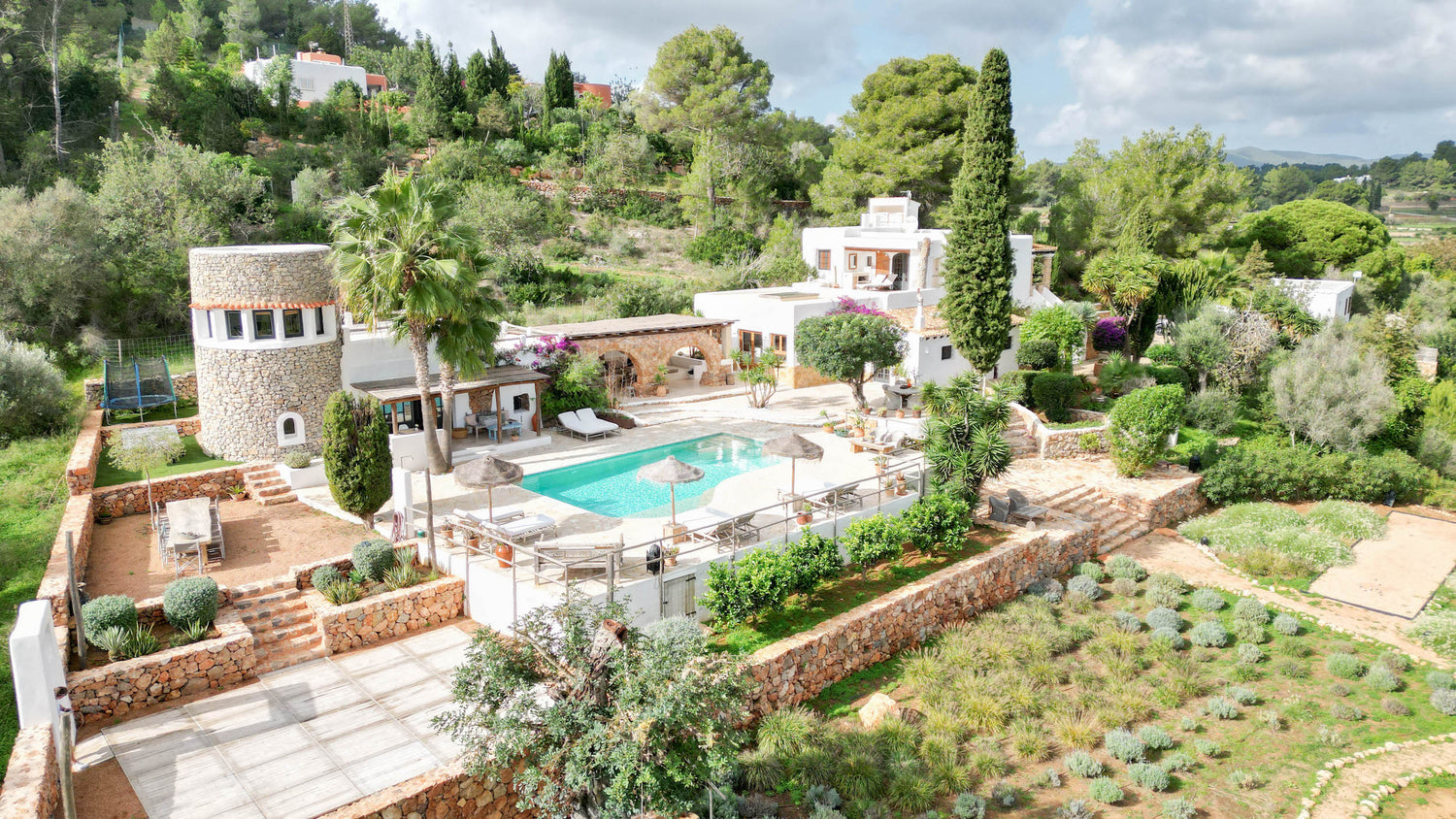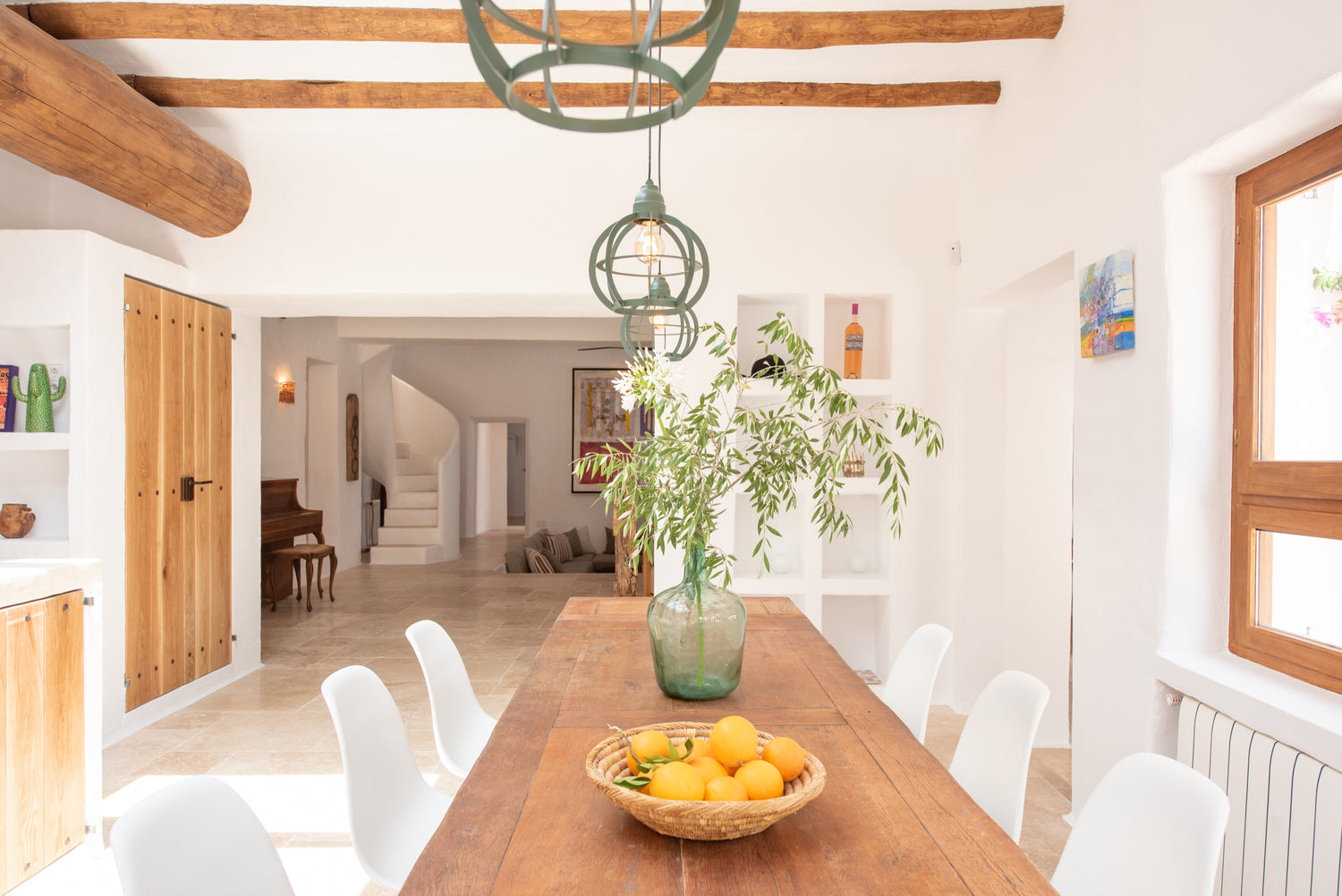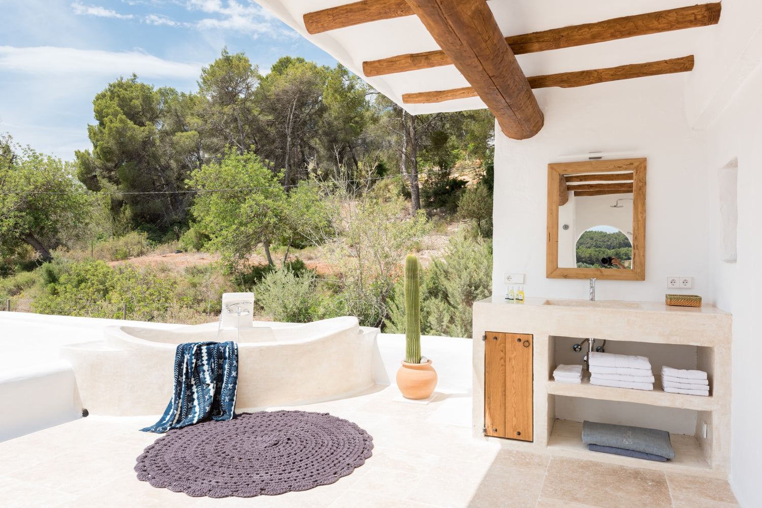 The drive from the airport is barely twenty minutes and yet you feel like you have arrived in another world. The countryside here breathes peace along with the Ibizan fragrances of rosemary and pine. The picturesque town of Santa Gertrudis, lively squares lined with charismatic restaurants and bars, is close by. The renovation of this old farmhouse fuses traditional materials and architecture with modern design, creating clean white spaces punctuated by features that echo bygone times in exposed stonework and weathered timber. There is also luxury with frivolity, as the stunning hand-made bathtub on the private terrace off the master bedroom. Accommodation is split between the main house and a characterful tower creating five bedrooms and bathrooms in all. Interiors connect with the sunny outside through a boho chill-out area with barbecue and onto the gleaming terrace where the salt-water pool sparkles. Can Mirlo is a piece of Ibizan paradise.