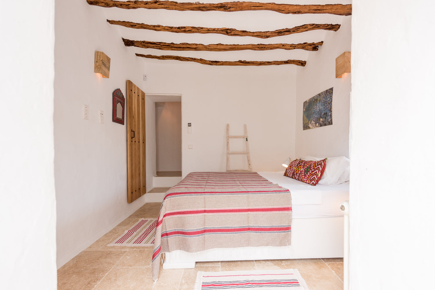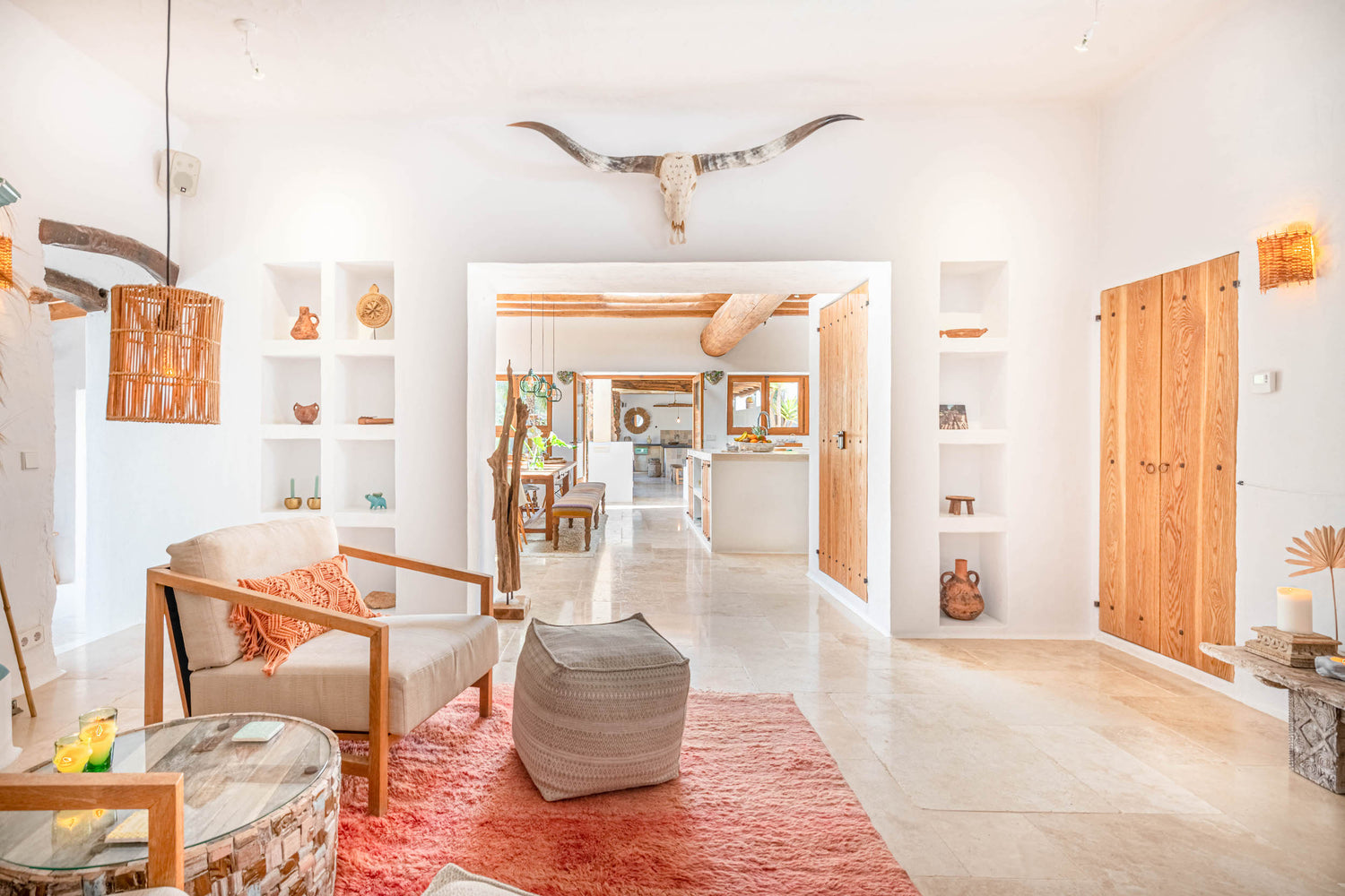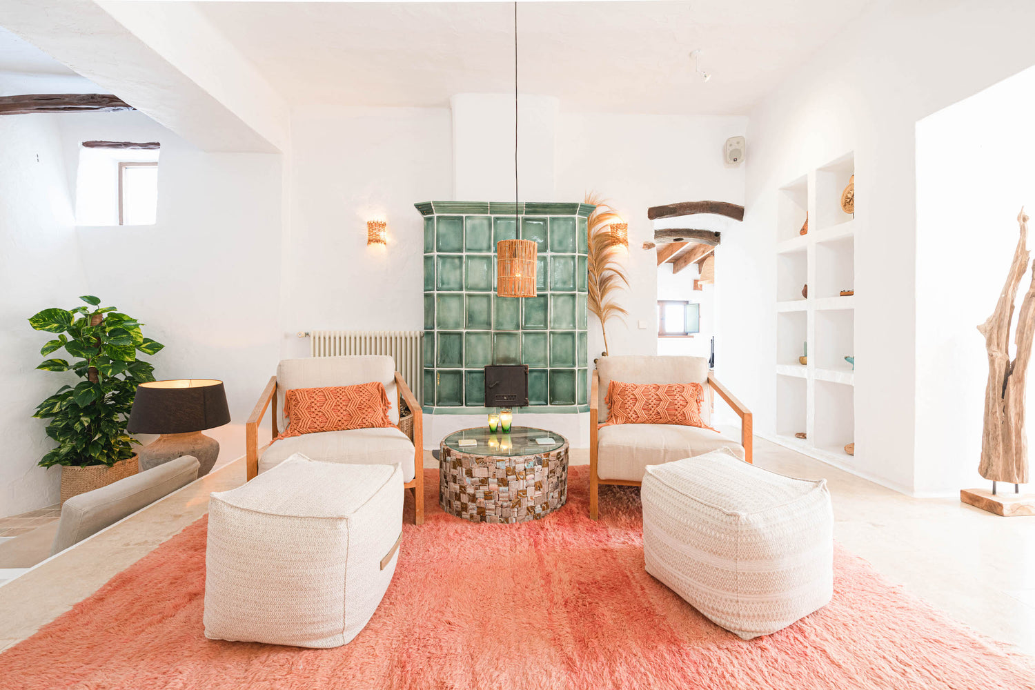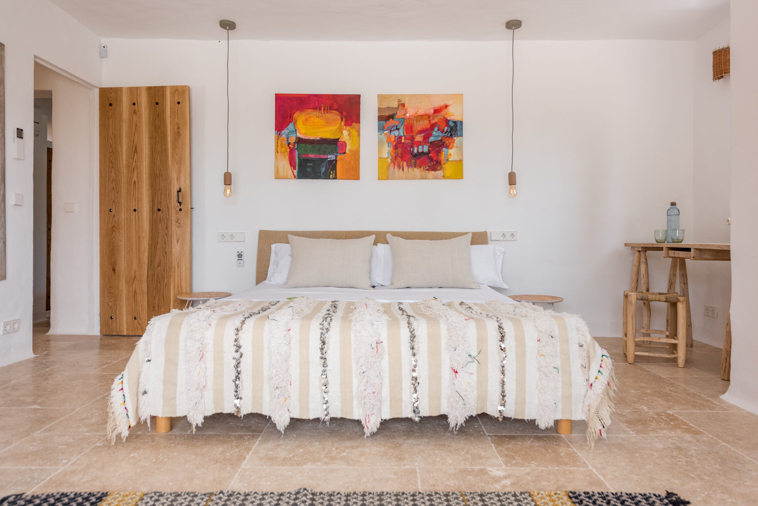 The drive from the airport is barely twenty minutes and yet you feel like you have arrived in another world. The countryside here breathes peace along with the Ibizan fragrances of rosemary and pine. The picturesque town of Santa Gertrudis, lively squares lined with charismatic restaurants and bars, is close by. The renovation of this old farmhouse fuses traditional materials and architecture with modern design, creating clean white spaces punctuated by features that echo bygone times in exposed stonework and weathered timber. There is also luxury with frivolity, as the stunning hand-made bathtub on the private terrace off the master bedroom. Accommodation is split between the main house and a characterful tower creating five bedrooms and bathrooms in all. Interiors connect with the sunny outside through a boho chill-out area with barbecue and onto the gleaming terrace where the salt-water pool sparkles. Can Mirlo is a piece of Ibizan paradise.