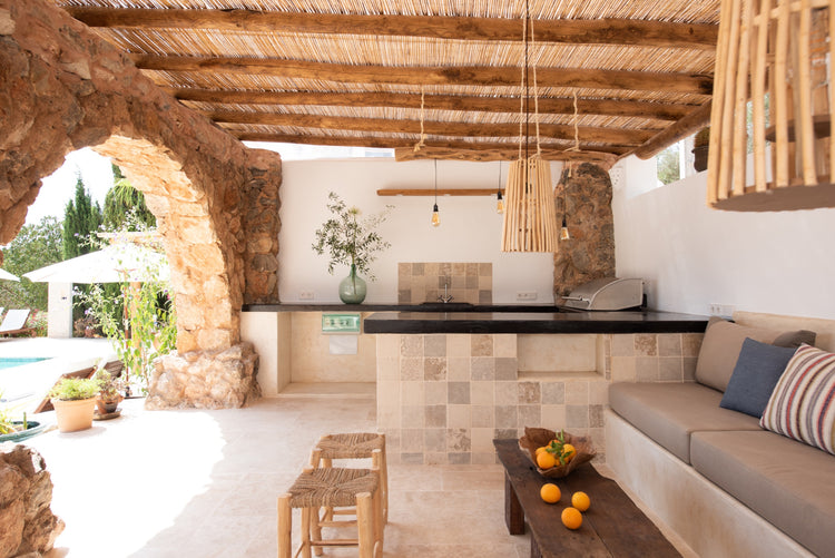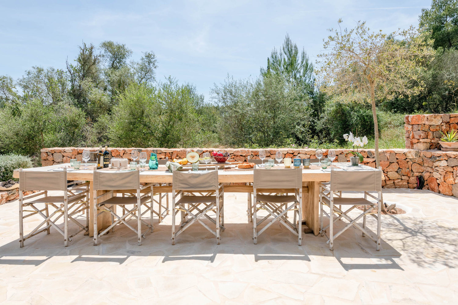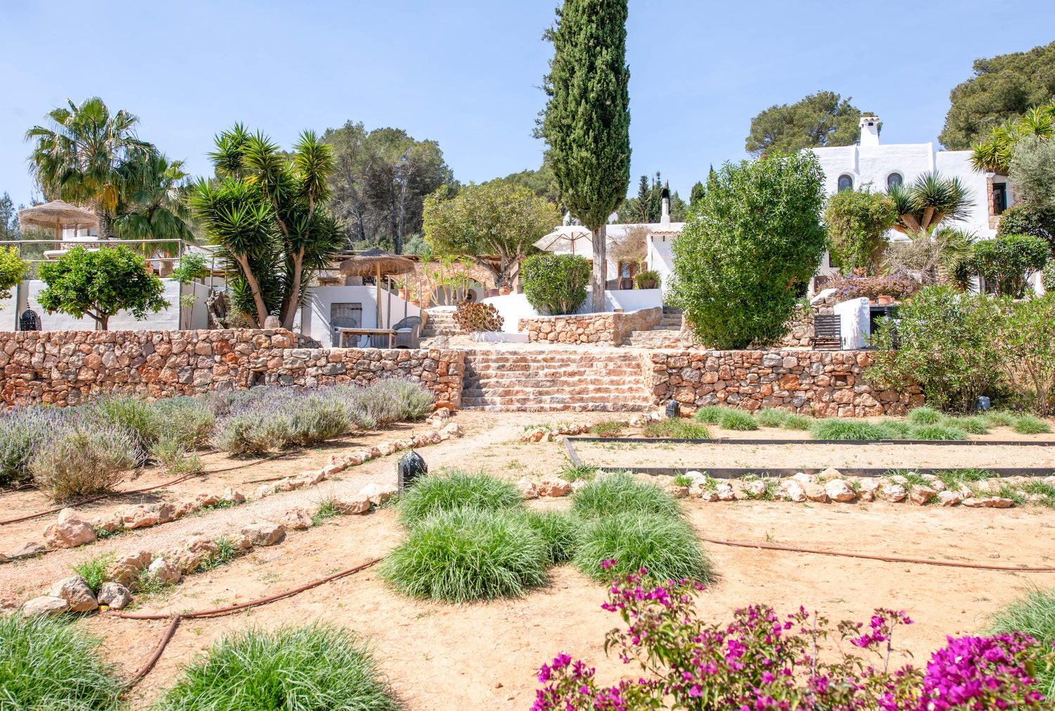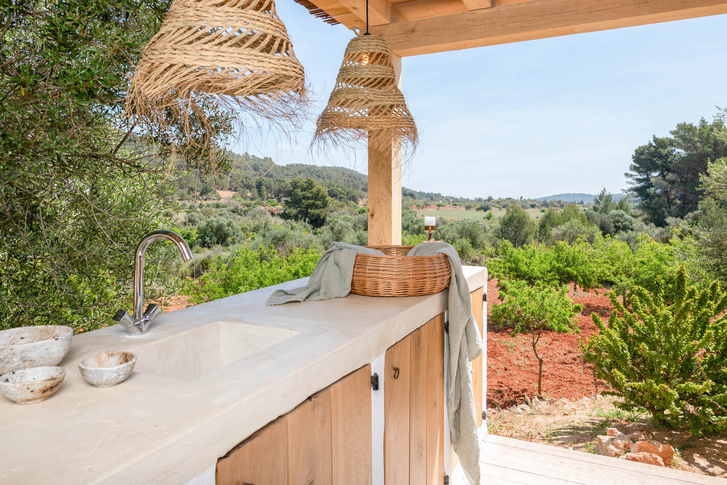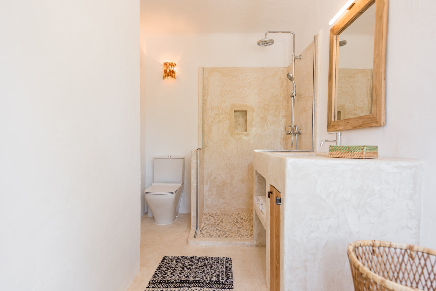 The drive from the airport is barely twenty minutes and yet you feel like you have arrived in another world. The countryside here breathes peace along with the Ibizan fragrances of rosemary and pine. The picturesque town of Santa Gertrudis, lively squares lined with charismatic restaurants and bars, is close by. The renovation of this old farmhouse fuses traditional materials and architecture with modern design, creating clean white spaces punctuated by features that echo bygone times in exposed stonework and weathered timber. There is also luxury with frivolity, as the stunning hand-made bathtub on the private terrace off the master bedroom. Accommodation is split between the main house and a characterful tower creating five bedrooms and bathrooms in all. Interiors connect with the sunny outside through a boho chill-out area with barbecue and onto the gleaming terrace where the salt-water pool sparkles. Can Mirlo is a piece of Ibizan paradise.