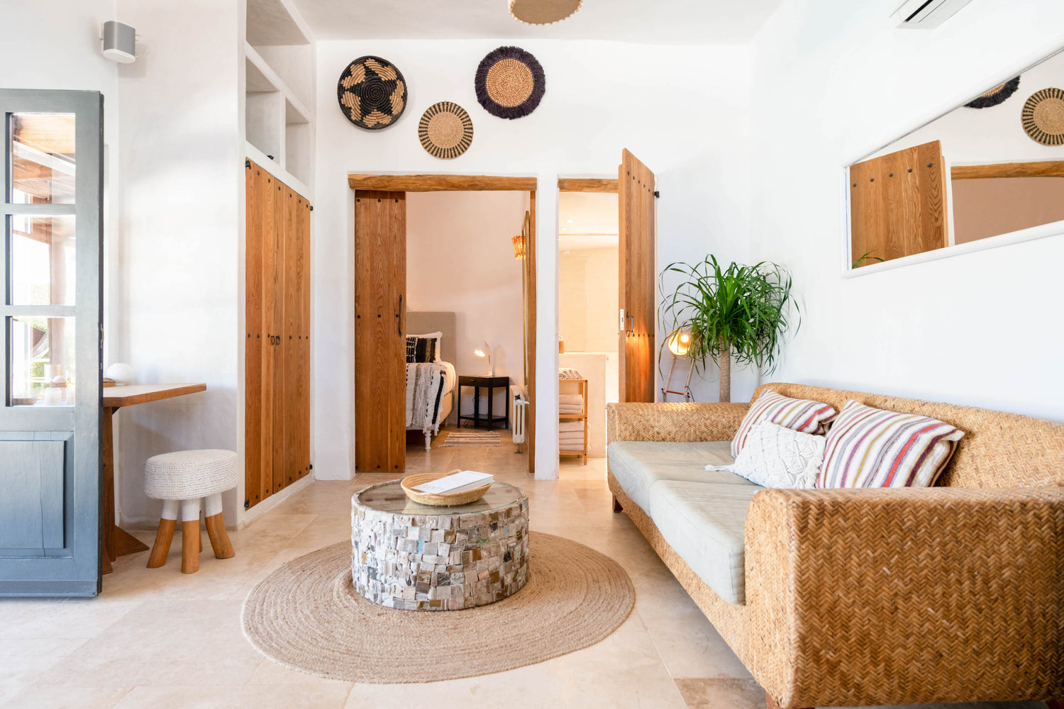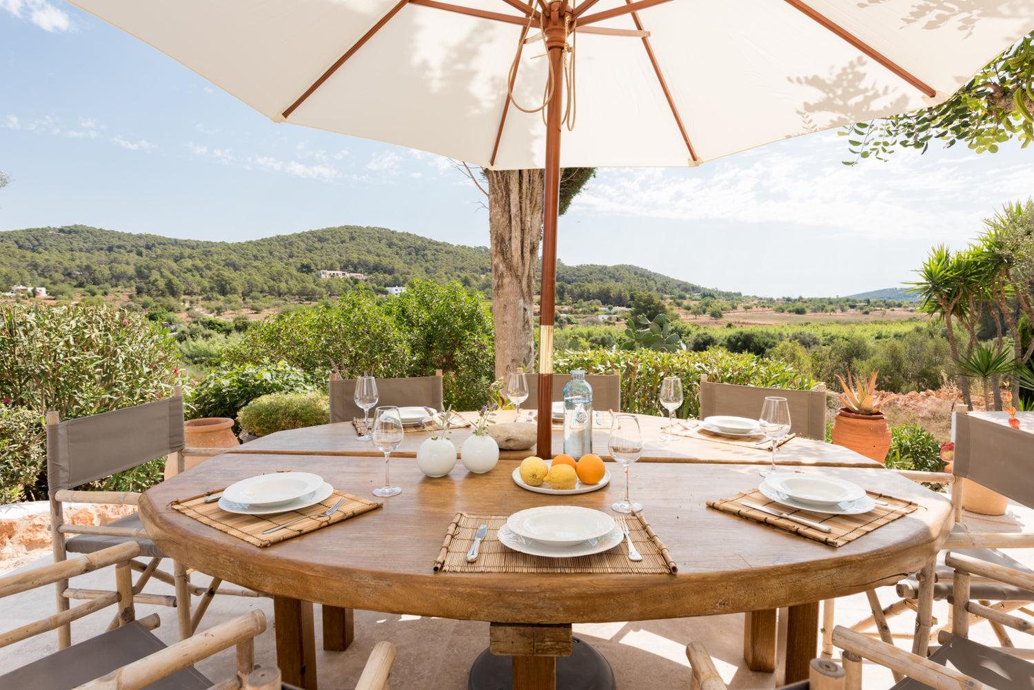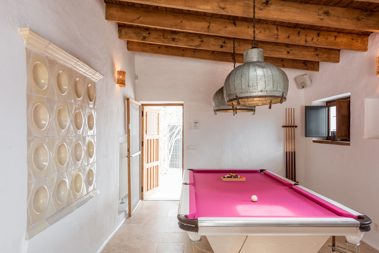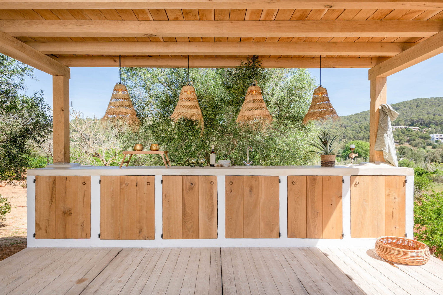 The drive from the airport is barely twenty minutes and yet you feel like you have arrived in another world. The countryside here breathes peace along with the Ibizan fragrances of rosemary and pine. The picturesque town of Santa Gertrudis, lively squares lined with charismatic restaurants and bars, is close by. The renovation of this old farmhouse fuses traditional materials and architecture with modern design, creating clean white spaces punctuated by features that echo bygone times in exposed stonework and weathered timber. There is also luxury with frivolity, as the stunning hand-made bathtub on the private terrace off the master bedroom. Accommodation is split between the main house and a characterful tower creating five bedrooms and bathrooms in all. Interiors connect with the sunny outside through a boho chill-out area with barbecue and onto the gleaming terrace where the salt-water pool sparkles. Can Mirlo is a piece of Ibizan paradise.