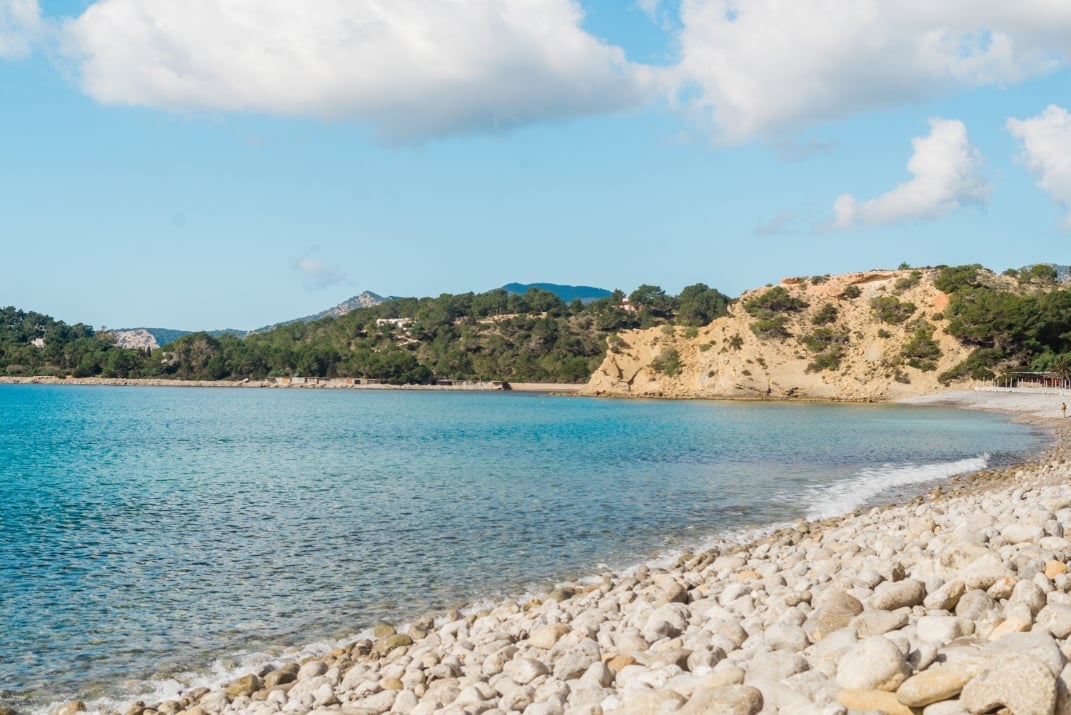 As you drive over the crest leading down towards the exclusive Cala Jondal area, striking turquoise water sparkles beneath the horizon, surrounded by gorgeous pine forests and rich, rocky red cliffs while huge grey pebbles form a long stretch of the beach, with a stretch of golden sand at the south end.