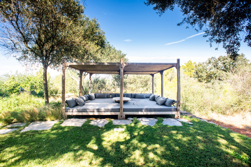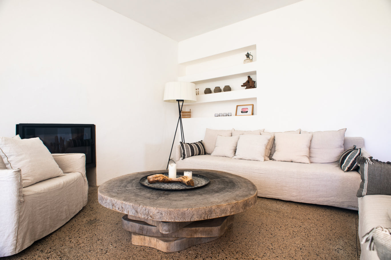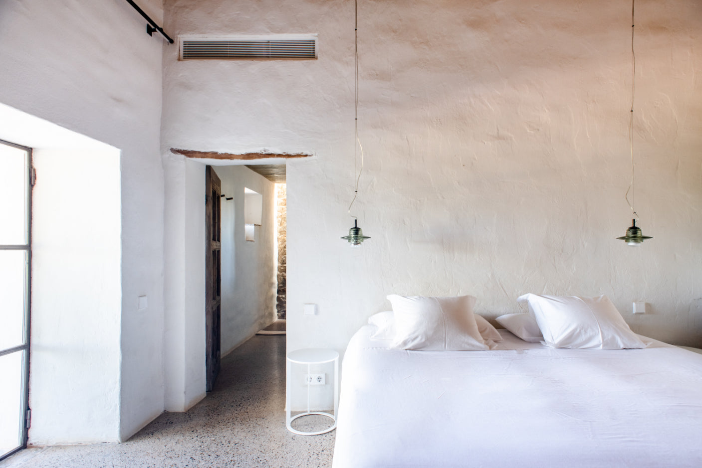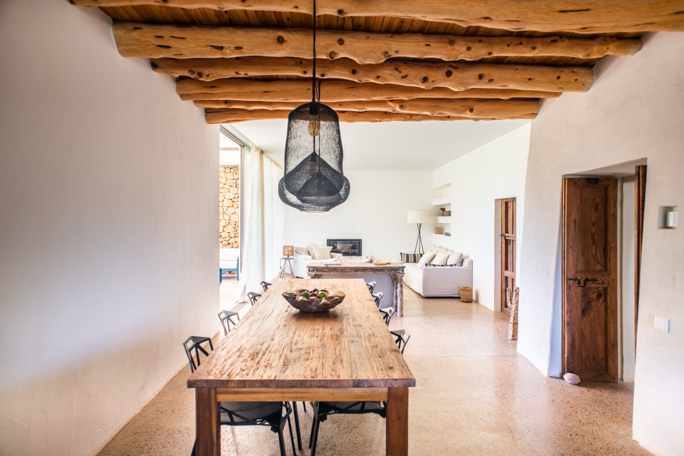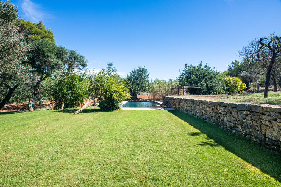In an idyllic, private countryside location just a few minutes from Santa Eulalia the house is perfect for those looking to enjoy some peace and serenity amongst the terraces and the original stone walls that Ibiza is famous for. Casa Campo is a beautiful blend of minimalist lifestyle and island charm. In the main part of the house is a spacious open living area with a modern kitchen and dining table for 8. There is another sitting area in the centre of the house, which leads off to the bedrooms and onto the old porch of the house. The living area opens onto the garden, overlooking the pool and surrounding countryside. There’s an open fireplace and underfloor heating for cosy winter stays too. There are 4 double bedrooms, each with private bathroom and a guest toilet. The house is equipped with satellite TV, DVD and WiFi. The bedrooms are all air conditioned and the property is alarmed. On a large plot of 25,000m2, you are right in the campo here with far reaching countryside views. Outside is a shaded dining and lounge area, several quiet spots under the trees to relax in and out on the sunny terrace is the 17m x 6m salt filtered pool and sun loungers.