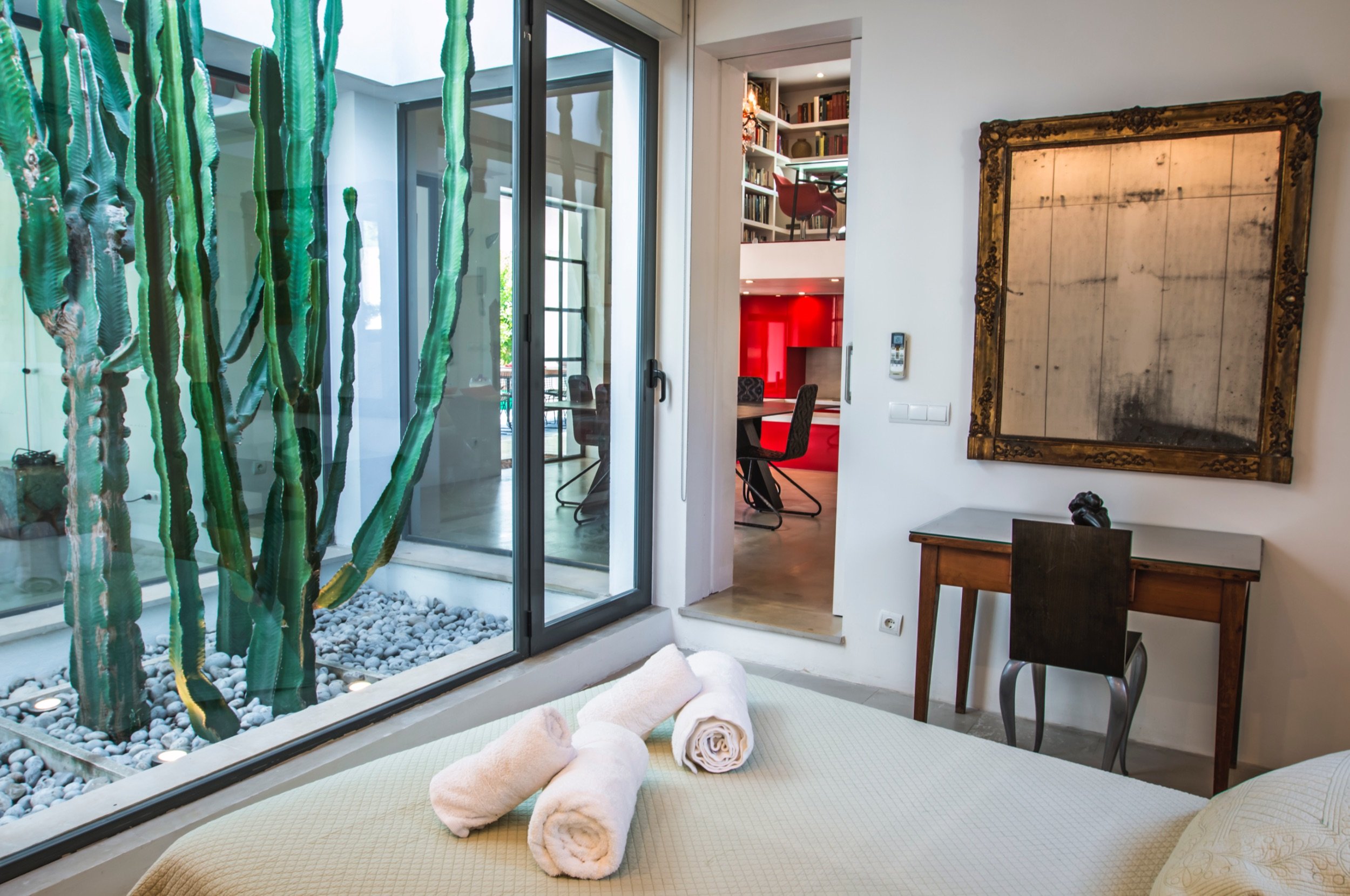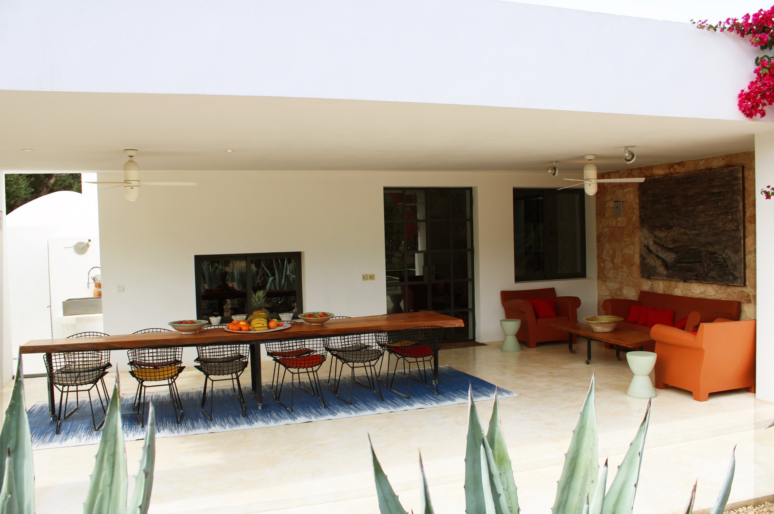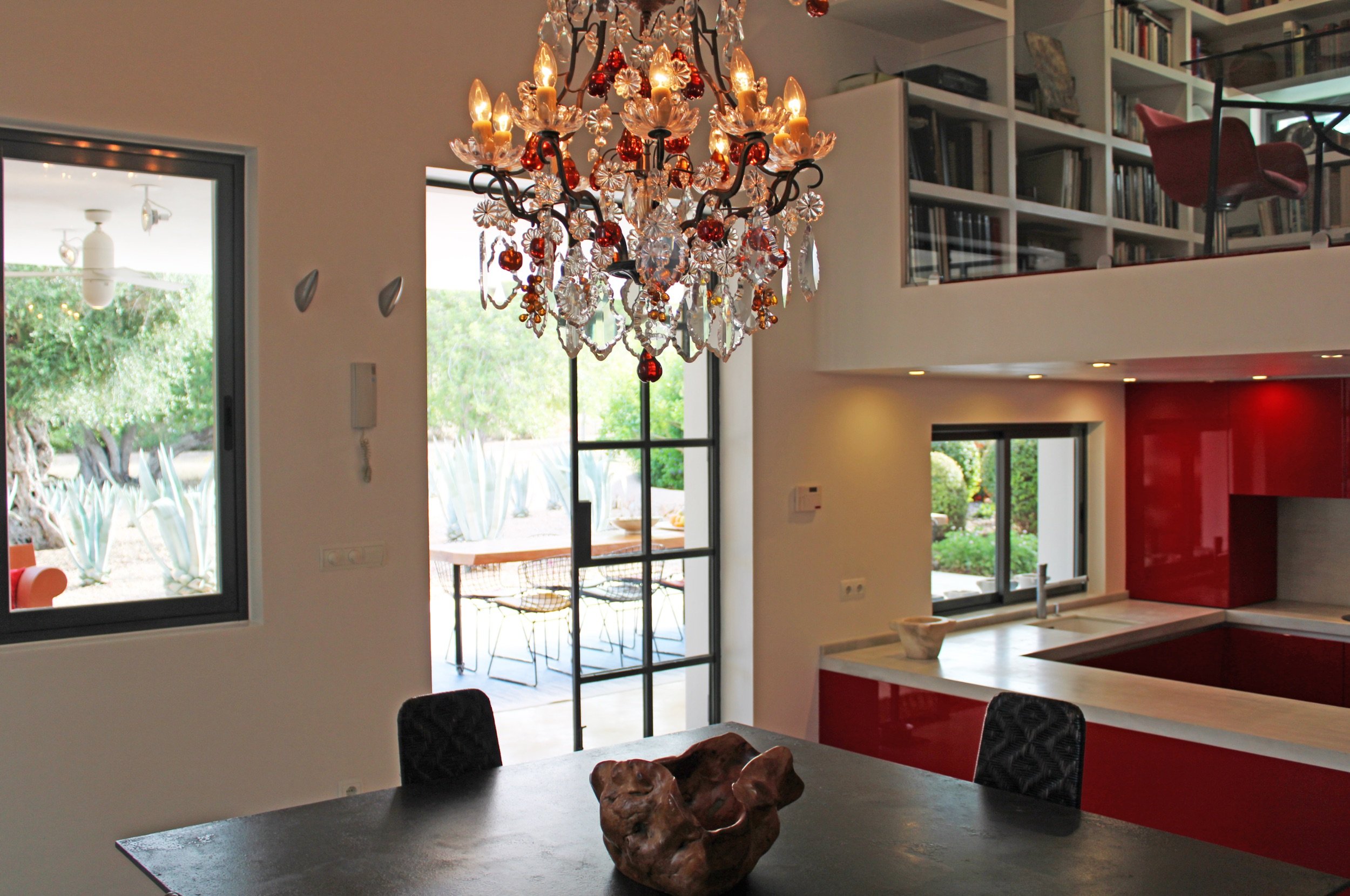 Set in countryside near the village of San Rafael, this villa is a private oasis from which to enjoy Ibiza. It combines cosmopolitan with traditional while remaining both elegant and cosy. There are 360m2 of light, bright living space, flowing from a large living room, inside and outside dining areas, kitchen and mezzanine office/library space. Functionality is provided by a utility room, air conditioning for summer months and fireplaces for winter. Three double bedrooms and bathrooms in the main house and another bedroom, bathroom, living room and small kitchen in an annexe, offer ample space to host guests. The house is on a fenced 15,000m2 plot, with pool, manicured gardens, orchard, extensive vegetable garden, greenhouse and covered parking. A roof terrace offers a chillout with views to the sea. This stunning and fantastically placed property holds a tourist license making an investment with great potential as well as a stylish home.