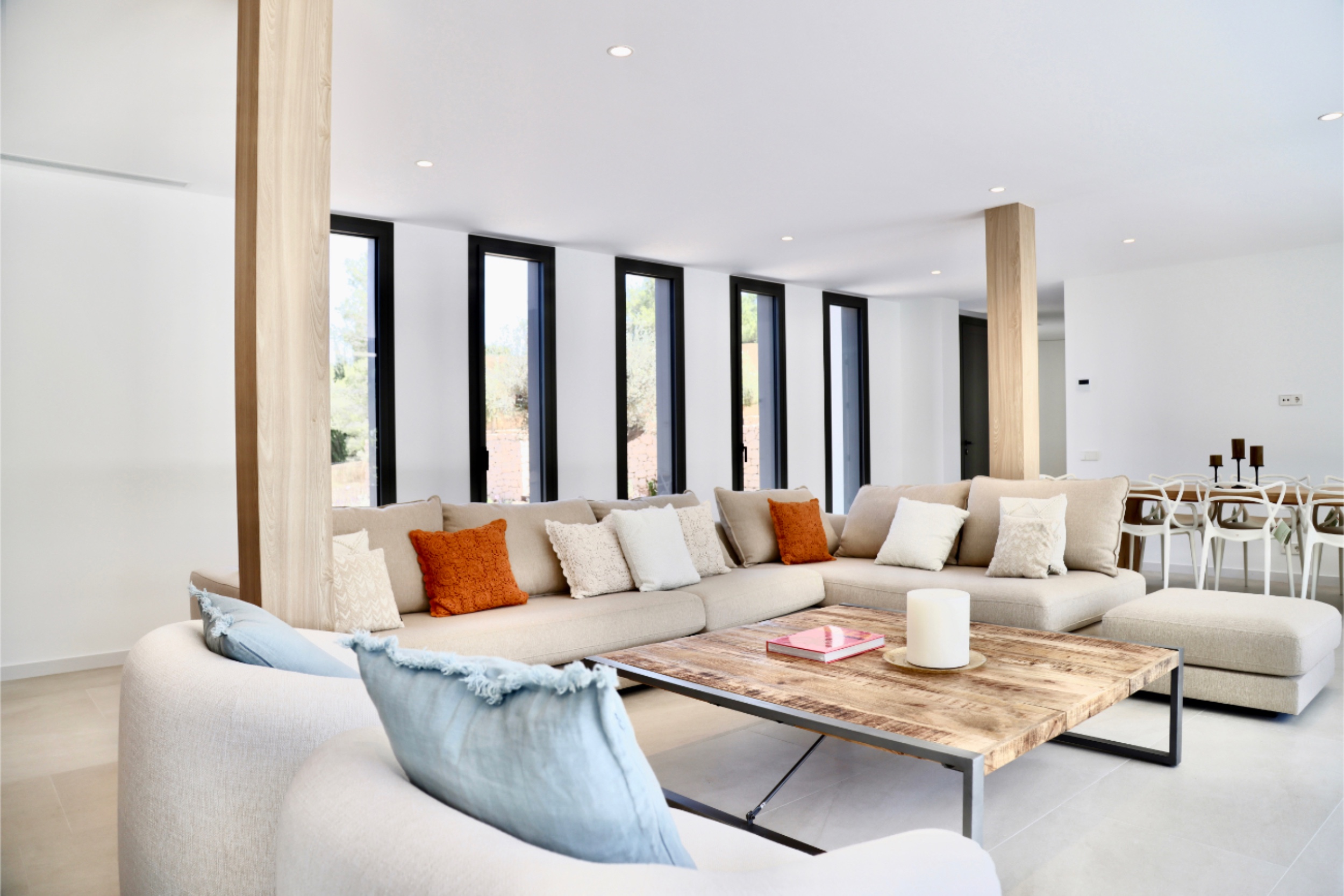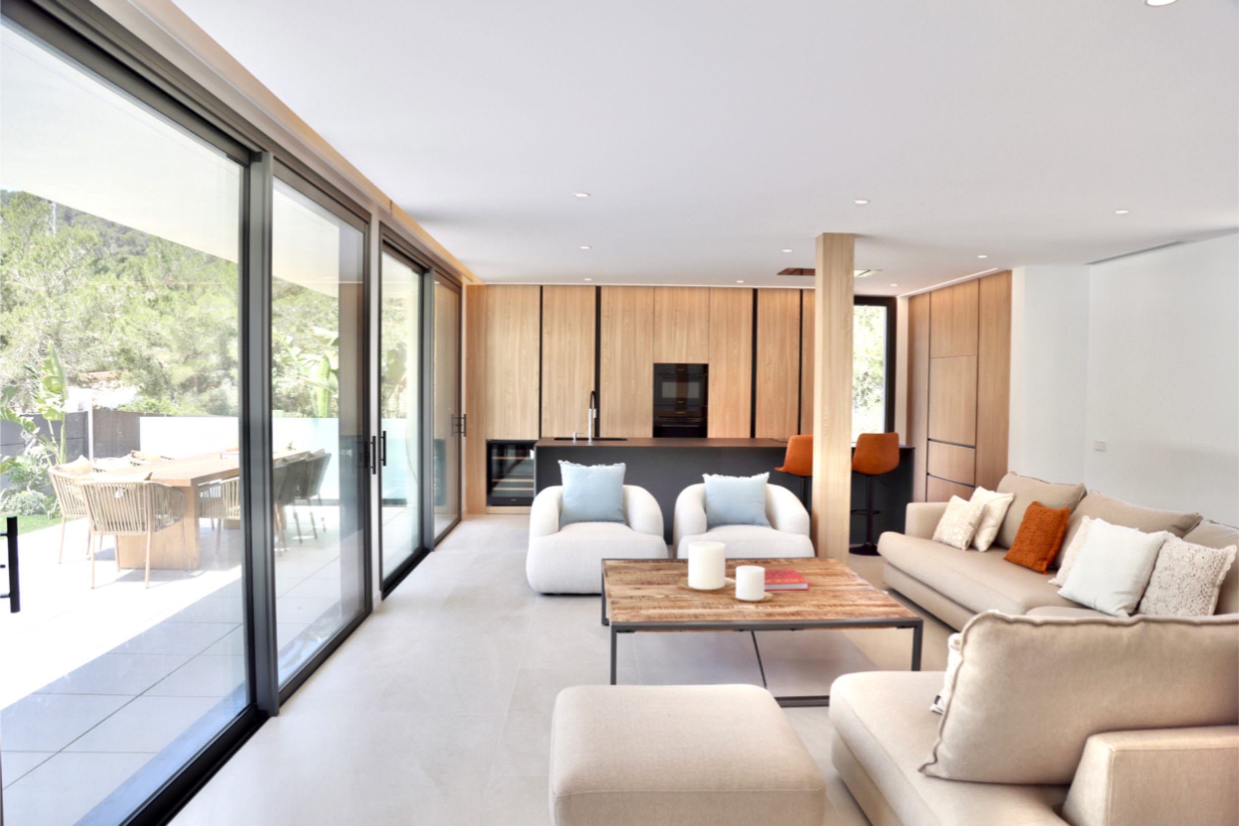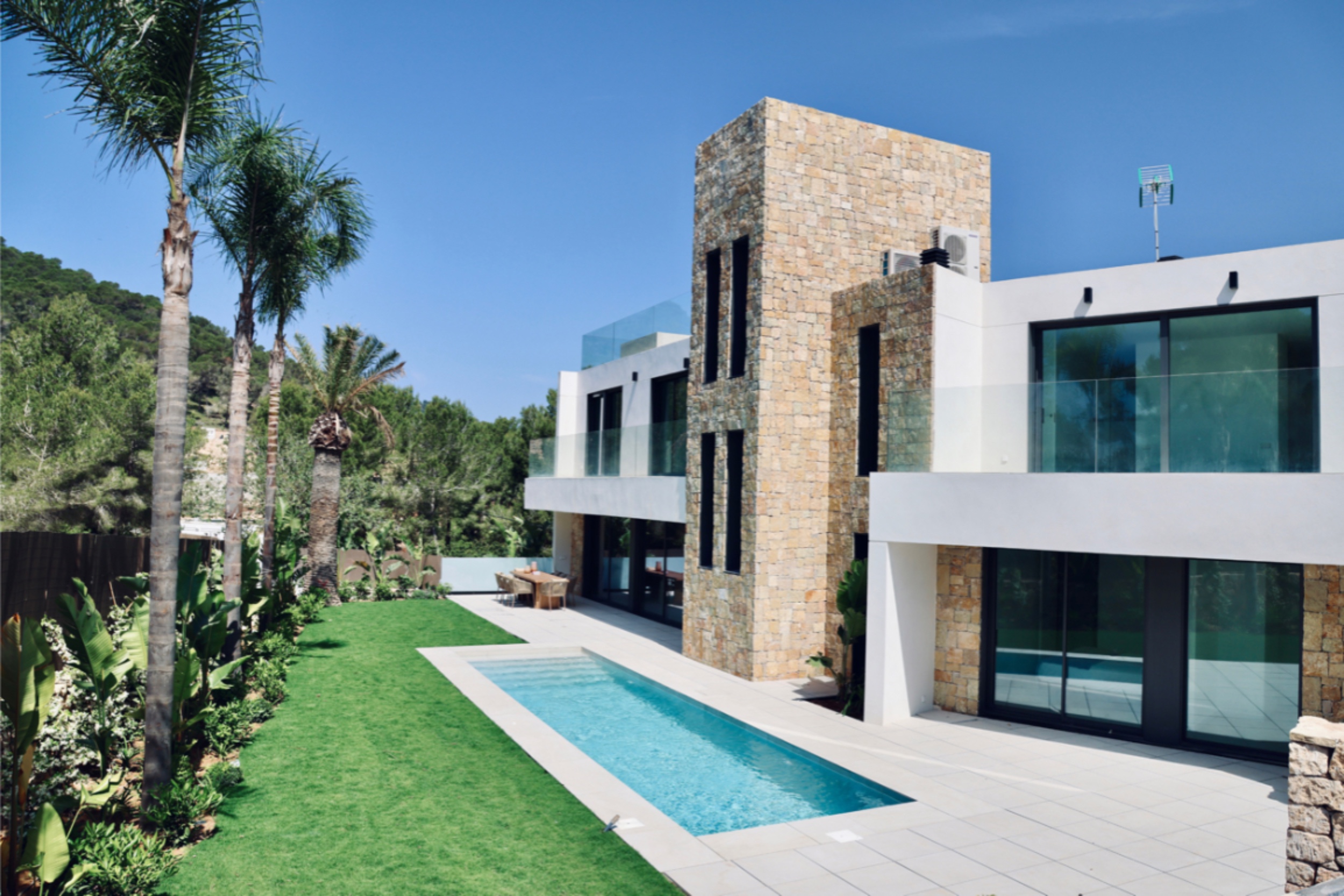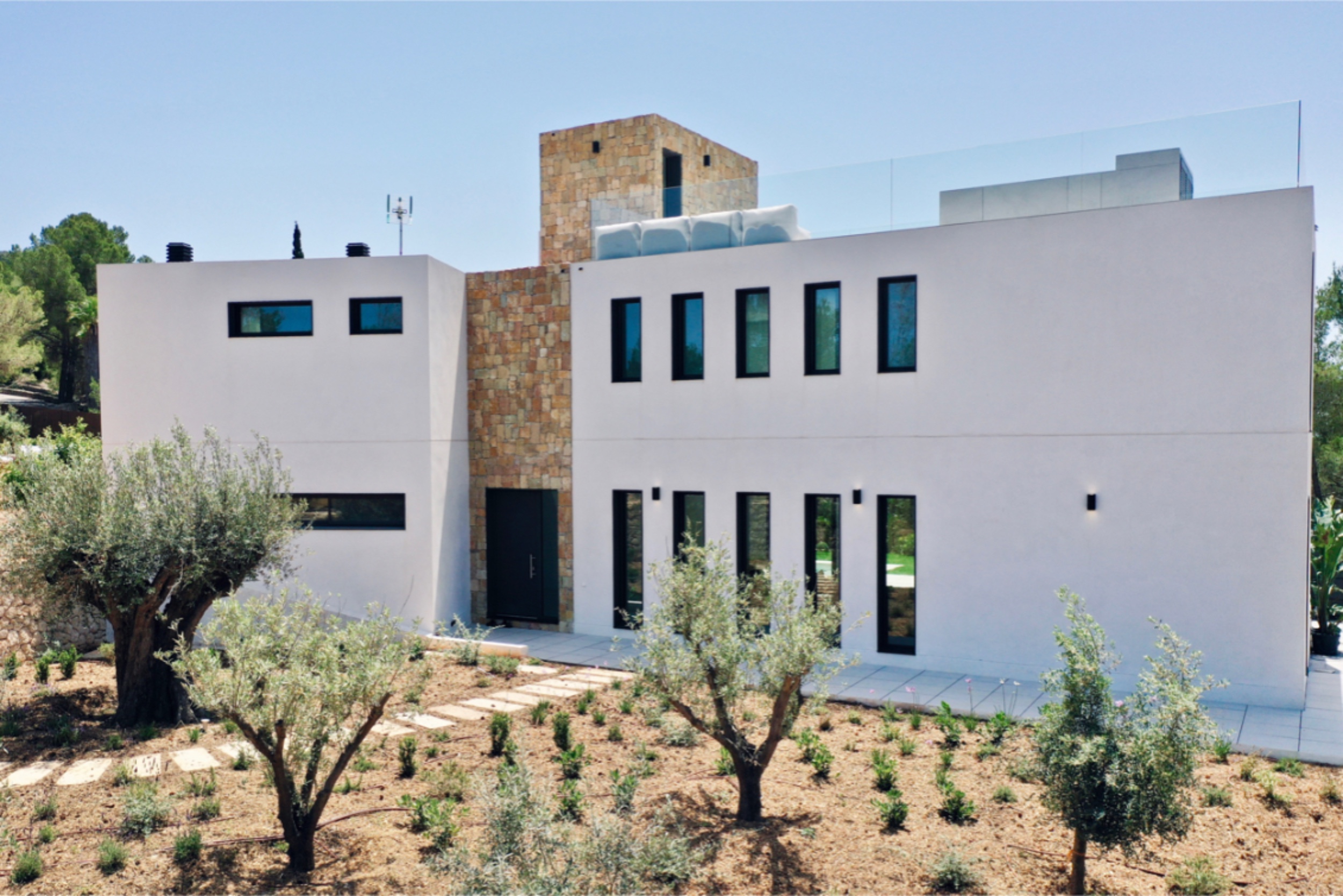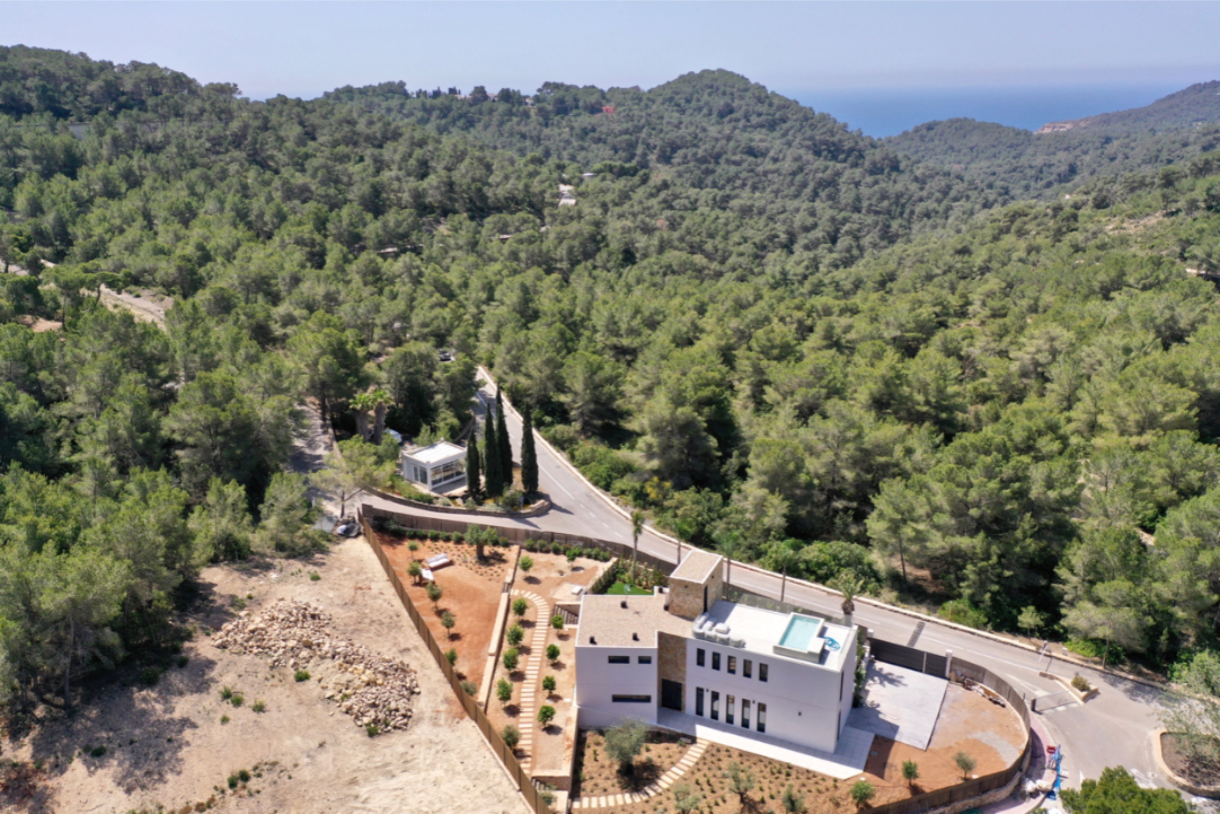 The setting, surrounded by pine trees, is peaceful and yet there is excellent access to Ibiza town and Santa Eulalia from this light filled property. It enjoys Roca Lisa’s 24-hour security and a 1500m2 corner plot with a large swimming pool, as well as the smaller pool that graces the roof. Interiors are sleek and modern, in-house technology is state-of-the-art and appliances, like the Miele kitchen encased in beautiful carpentry, are top end. A freestanding bathtub is a glamorous feature of the impressive master suite. Three more bedrooms on the first floor share a terrace and there are two bathrooms. On the ground floor, another double ensuite bedroom opens to the pool and a further room could be a sixth bedroom or an office. The grounds are accessed by electric gates with space to park several vehicles. Shaded by olive trees and scented by lavender, they have been sensitively planted to create a lovely Ibiza retreat.