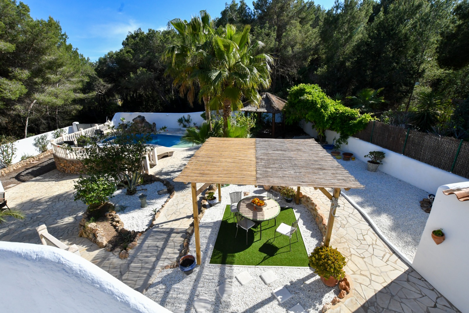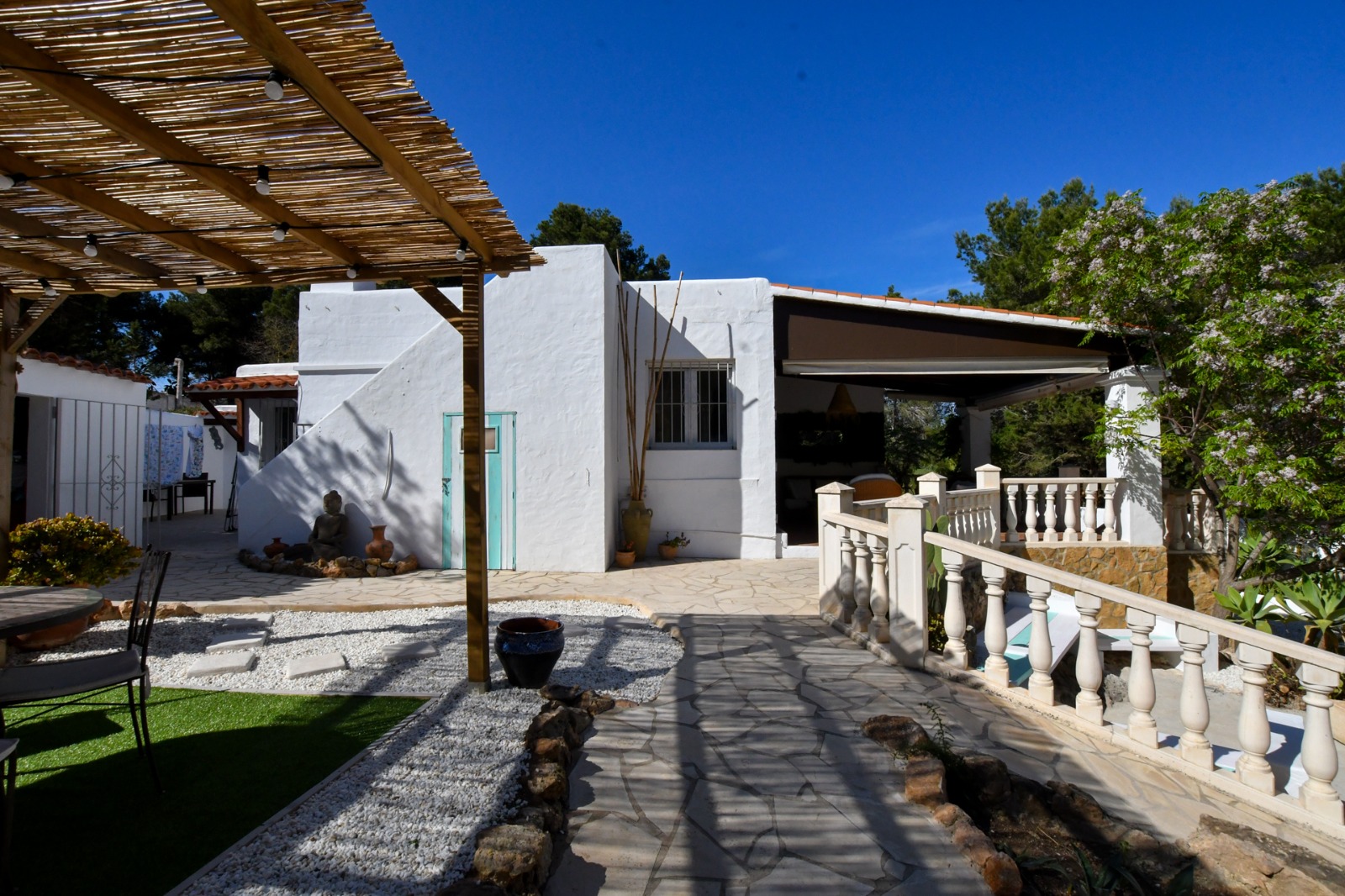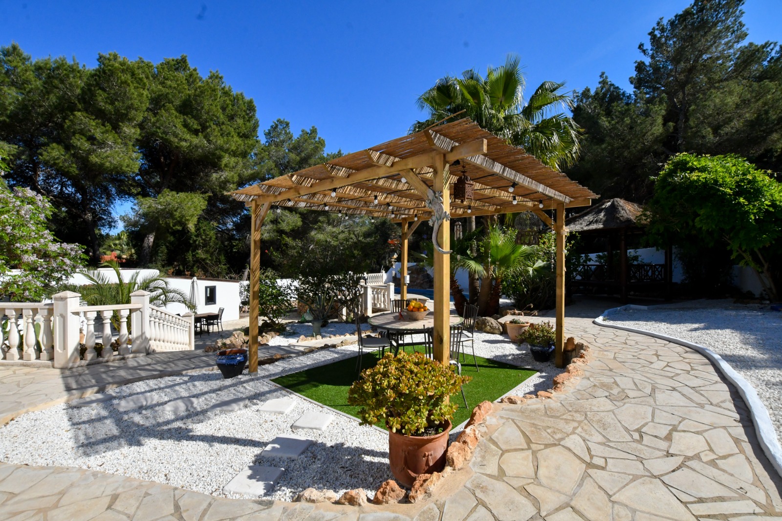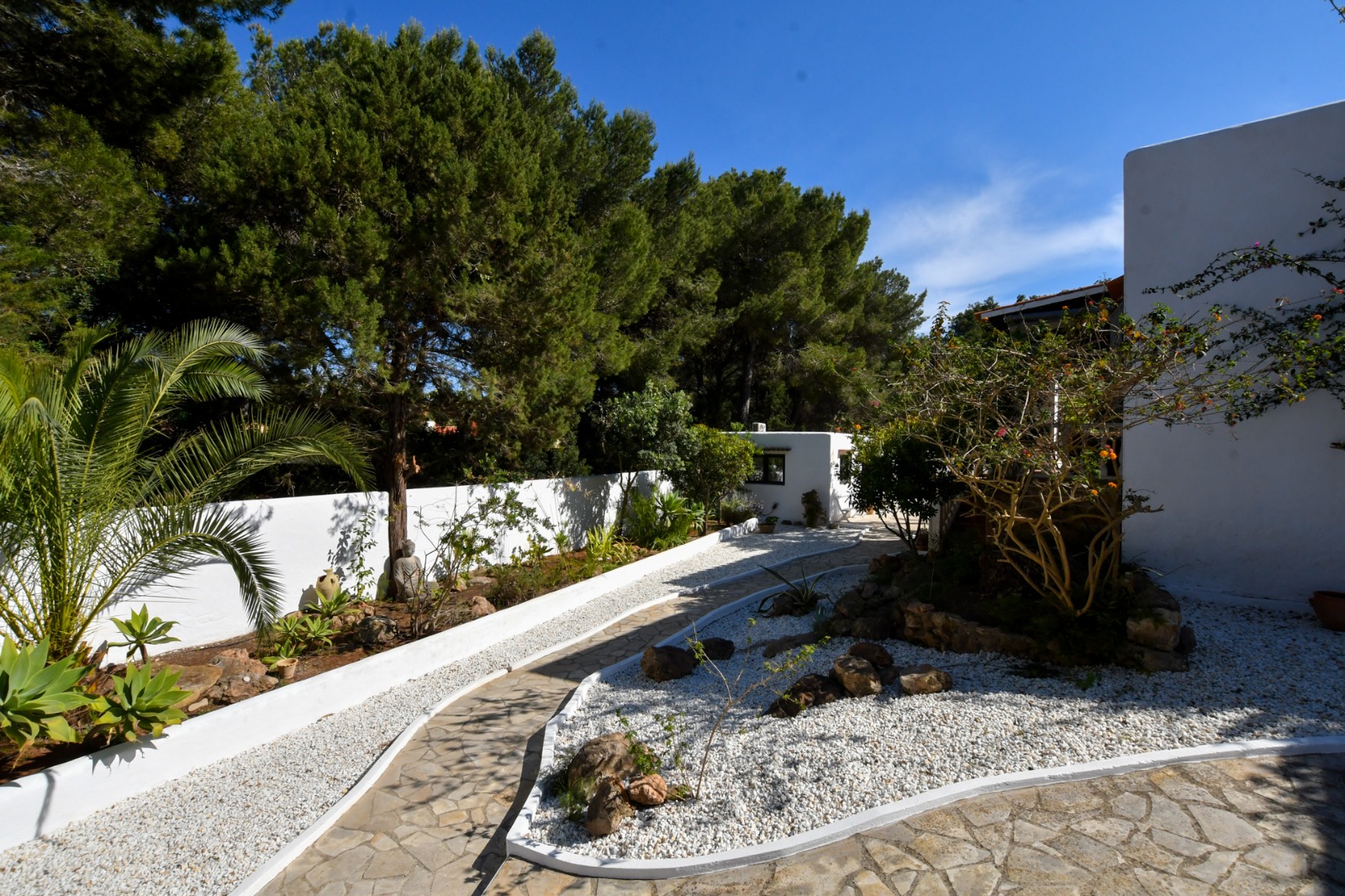 This villa is full of character and charm in true north Ibiza style. Set in pine forests, close to beaches with sand and turquoise waters, it is surrounded by gardens with Mediterranean planting and palm trees. As that style suggests, those gardens are rich with boho chill-out areas, whispers of Bali, fairy-tale lighting for magical nights and a graceful little swimming pool. The white-washed house itself is low and unassuming; inside it has been updated for living that is authentically unpretentious while comfortably modern (including the internet connection). The rooms are spacious: large open plan lounge and dining with an open fireplace, a big well-equipped kitchen that opens to the garden, four bedrooms and bathrooms. A separate casita provides guest accommodation with its own kitchen and additional ensuite bedroom. A wonderful position for authentic Ibiza: Bar Anita in San Carlos is 3km away, the lovely cove at Cala Mastella a little walk.