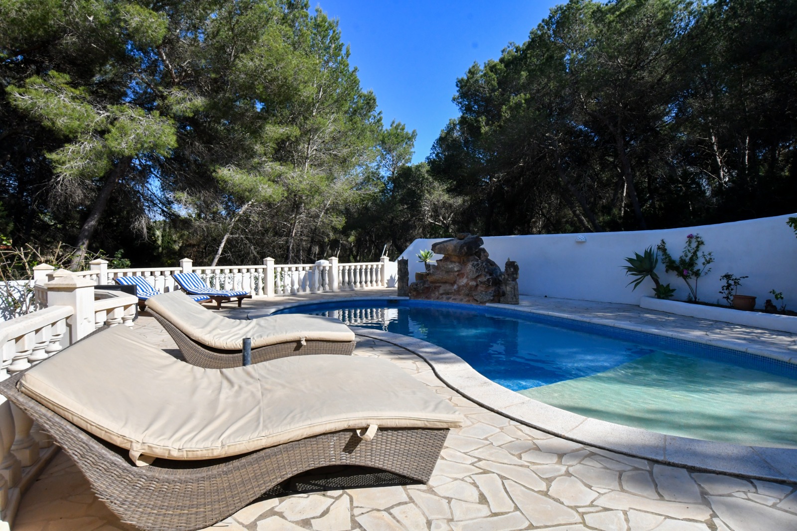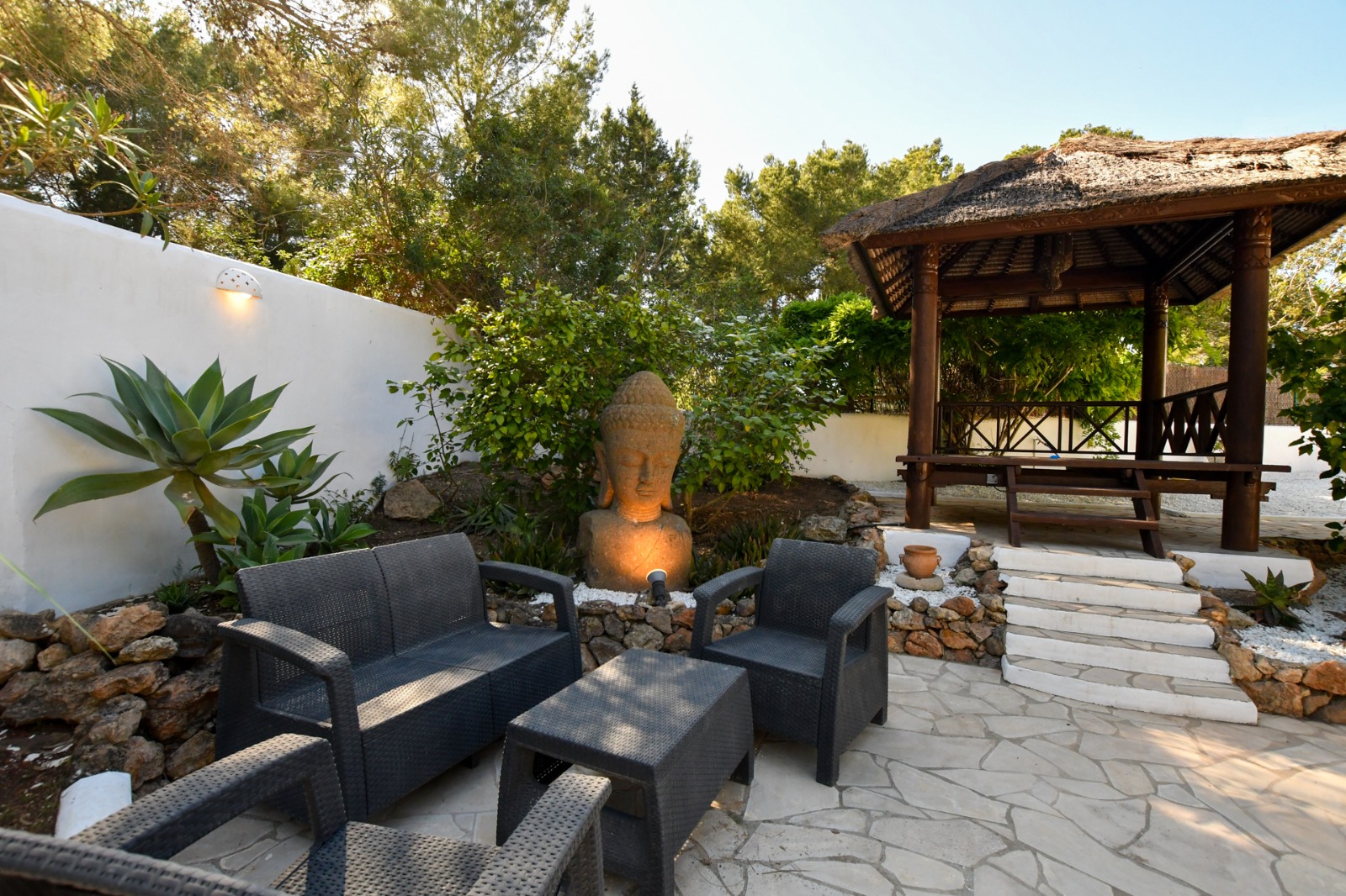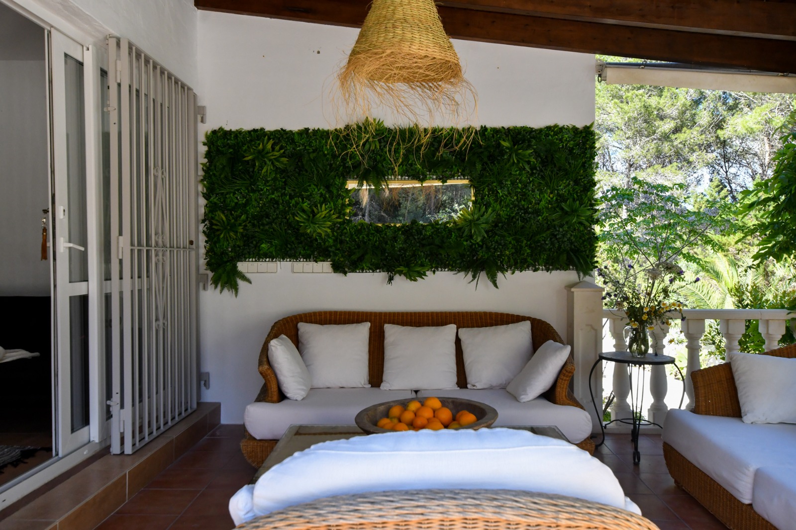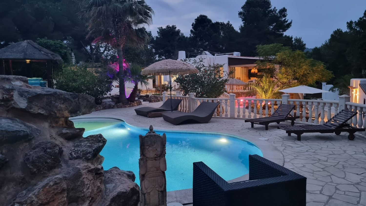 This villa is full of character and charm in true north Ibiza style. Set in pine forests, close to beaches with sand and turquoise waters, it is surrounded by gardens with Mediterranean planting and palm trees. As that style suggests, those gardens are rich with boho chill-out areas, whispers of Bali, fairy-tale lighting for magical nights and a graceful little swimming pool. The white-washed house itself is low and unassuming; inside it has been updated for living that is authentically unpretentious while comfortably modern (including the internet connection). The rooms are spacious: large open plan lounge and dining with an open fireplace, a big well-equipped kitchen that opens to the garden, four bedrooms and bathrooms. A separate casita provides guest accommodation with its own kitchen and additional ensuite bedroom. A wonderful position for authentic Ibiza: Bar Anita in San Carlos is 3km away, the lovely cove at Cala Mastella a little walk.
