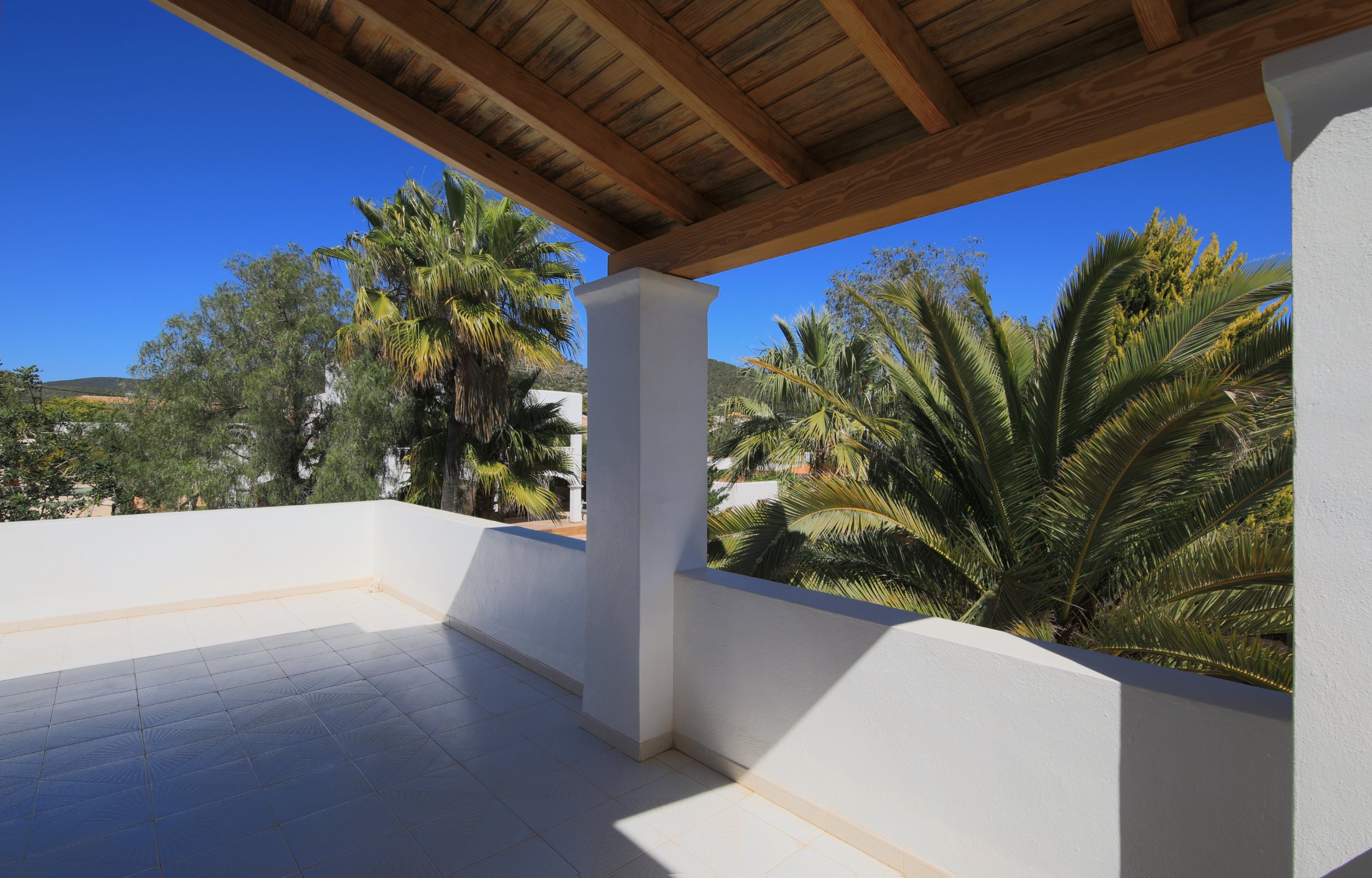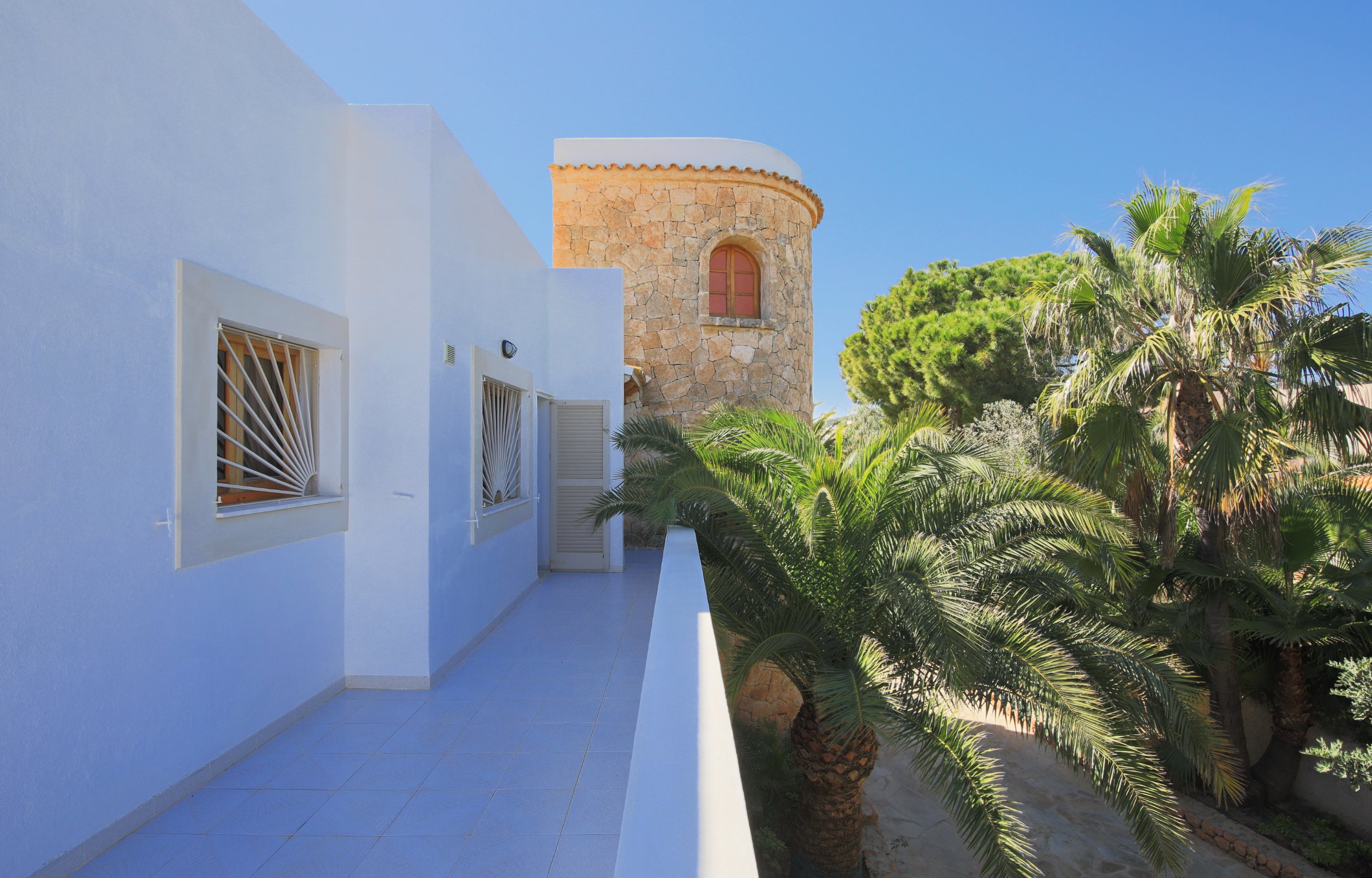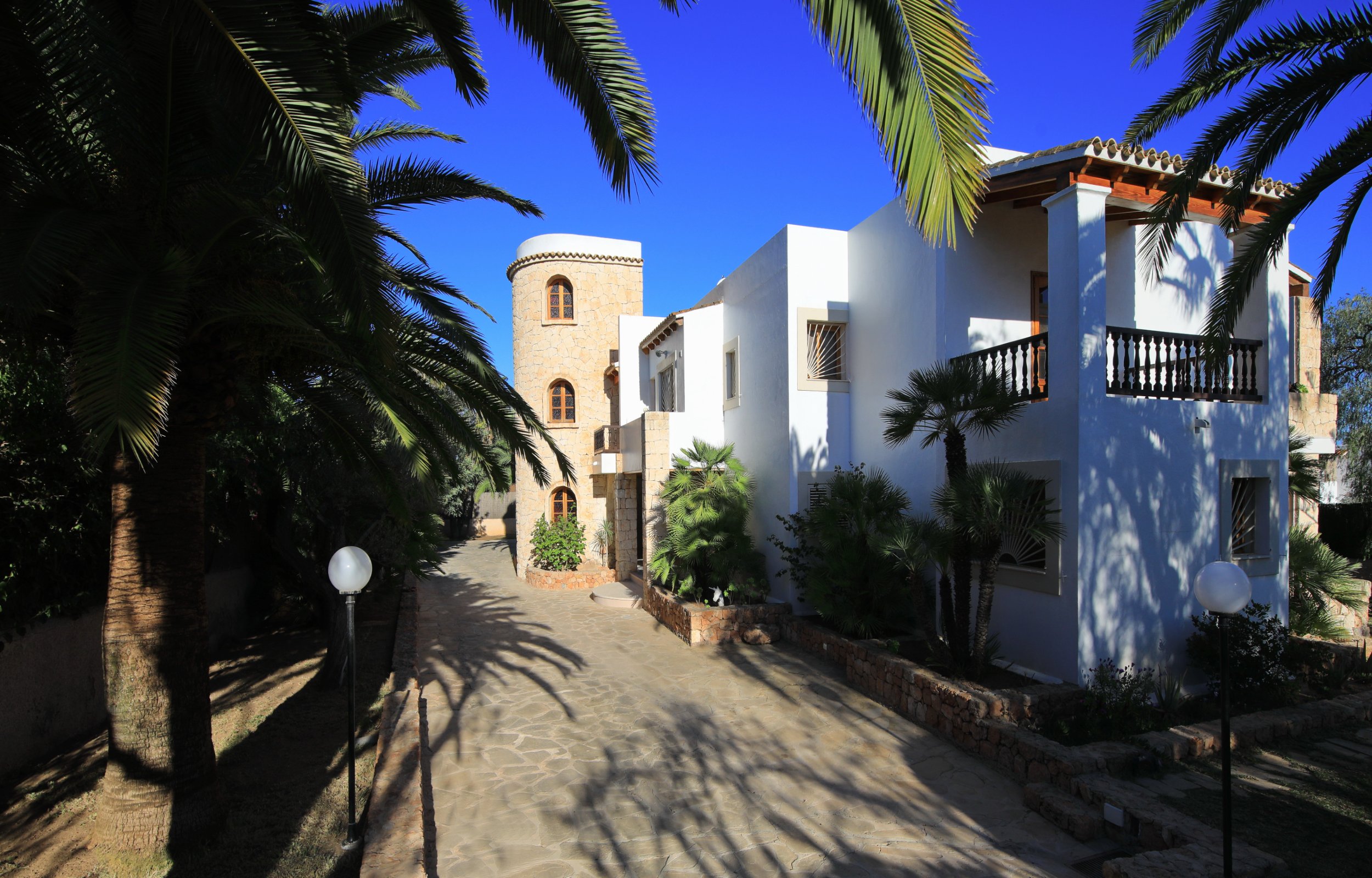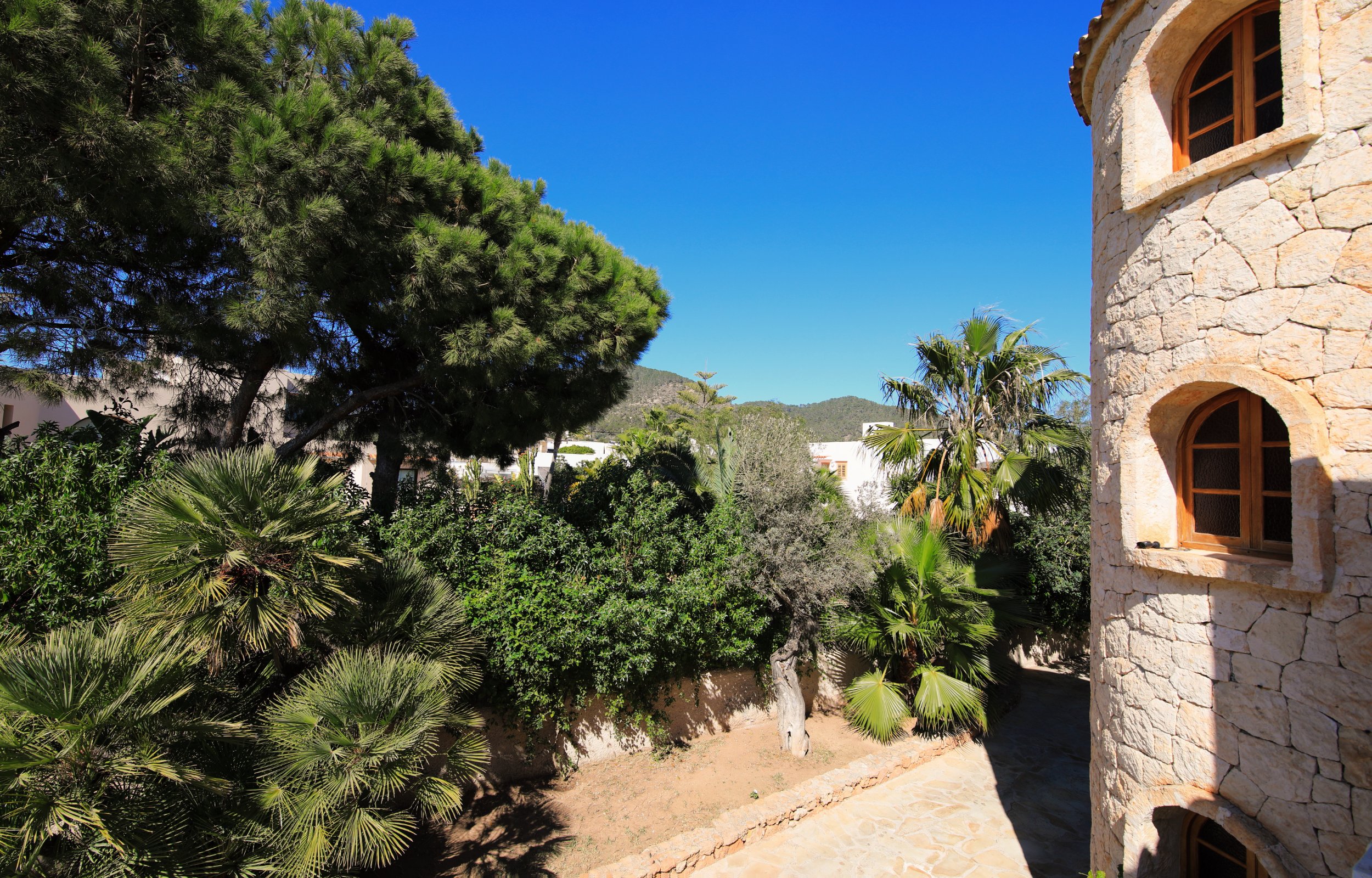 The main house on the ground floor of this Mediterranean style villa is spacious, elegant and brim-full of characterful features. Inside a stone tower, typical of the island, a staircase to the first floor accesses two apartments, each with its own entrance. Interiors are all high-ceilinged and light-filled, opening onto shady porches and terraces. Ground floor accommodation is graciously appointed, with two bedrooms and bathrooms (one ensuite), a kitchen, utility room and a generous living room with a fireplace. Upstairs, each apartment makes a welcoming home in itself, with two bedrooms, a family bathroom, living space with a substantial kitchen and a terrace with lovely views. The total built area of 690m2 occupies a plot of 1.600m2. Colourful gardens are shaded by mature trees and equipped with a large swimming pool and outside kitchen. This property, with its excellent connections to Ibiza town, is an opportunity full of potential for year-round island life.
