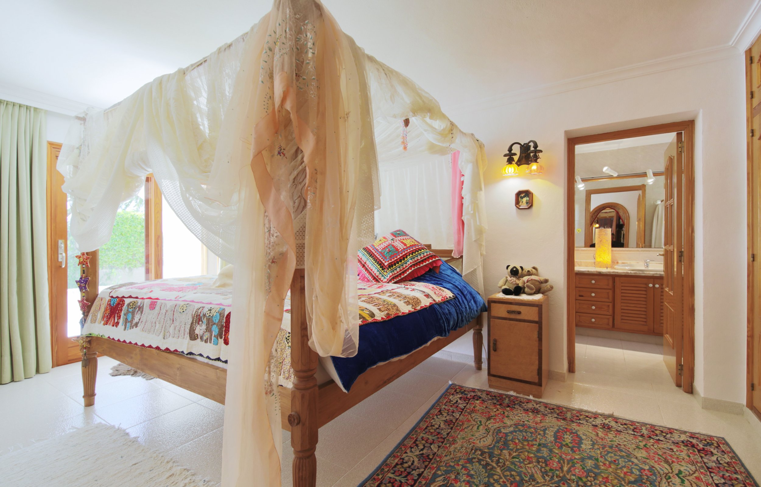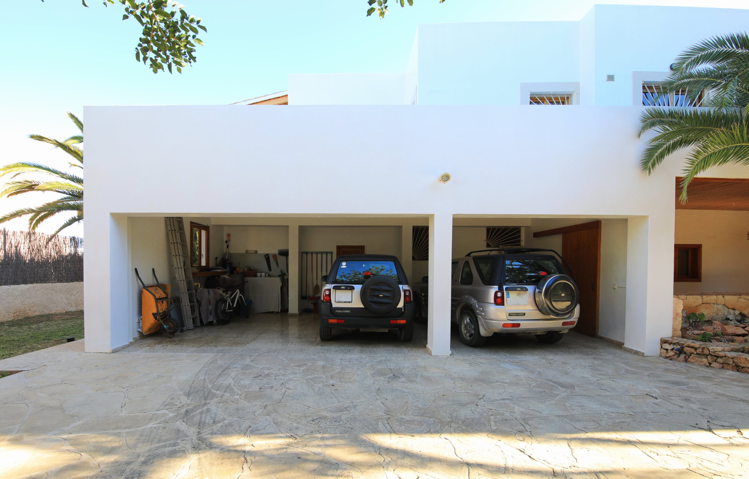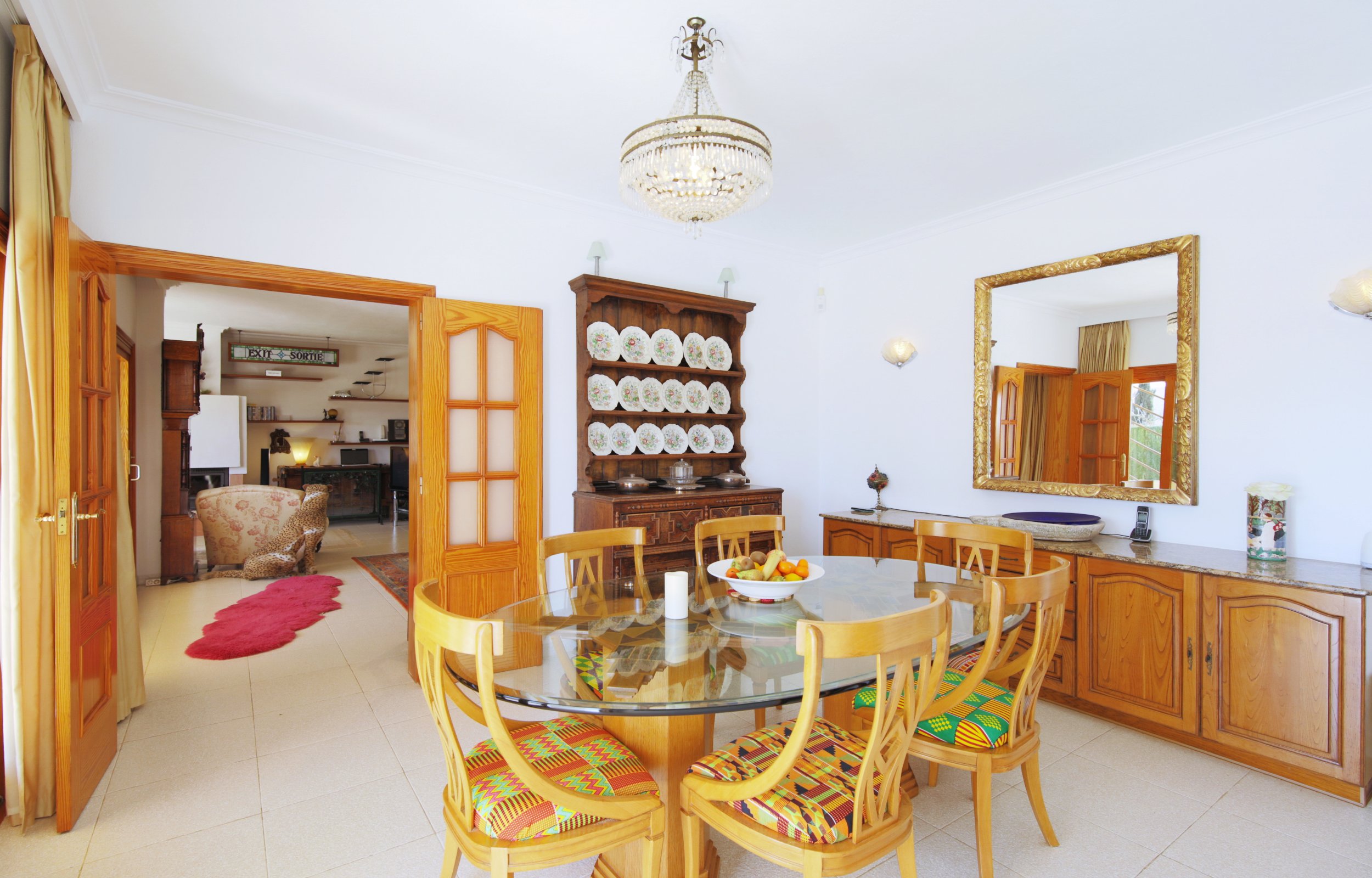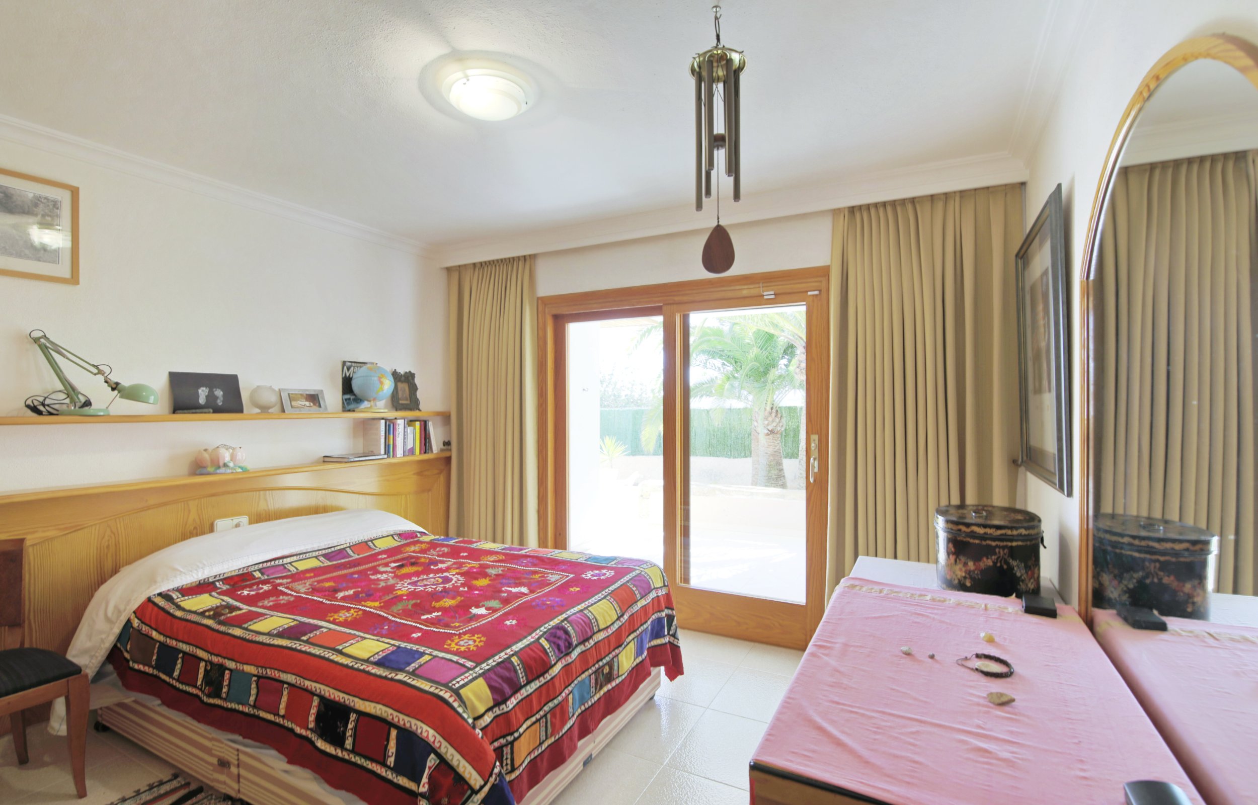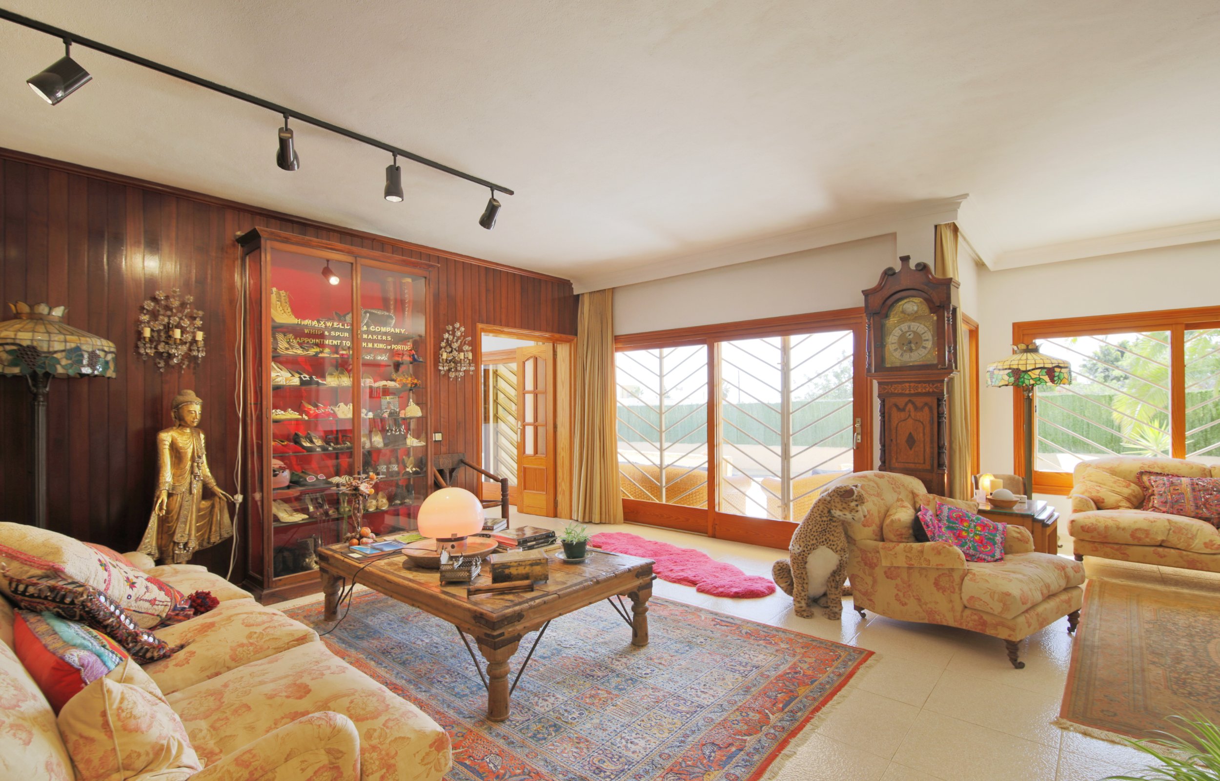 The main house on the ground floor of this Mediterranean style villa is spacious, elegant and brim-full of characterful features. Inside a stone tower, typical of the island, a staircase to the first floor accesses two apartments, each with its own entrance. Interiors are all high-ceilinged and light-filled, opening onto shady porches and terraces. Ground floor accommodation is graciously appointed, with two bedrooms and bathrooms (one ensuite), a kitchen, utility room and a generous living room with a fireplace. Upstairs, each apartment makes a welcoming home in itself, with two bedrooms, a family bathroom, living space with a substantial kitchen and a terrace with lovely views. The total built area of 690m2 occupies a plot of 1.600m2. Colourful gardens are shaded by mature trees and equipped with a large swimming pool and outside kitchen. This property, with its excellent connections to Ibiza town, is an opportunity full of potential for year-round island life.