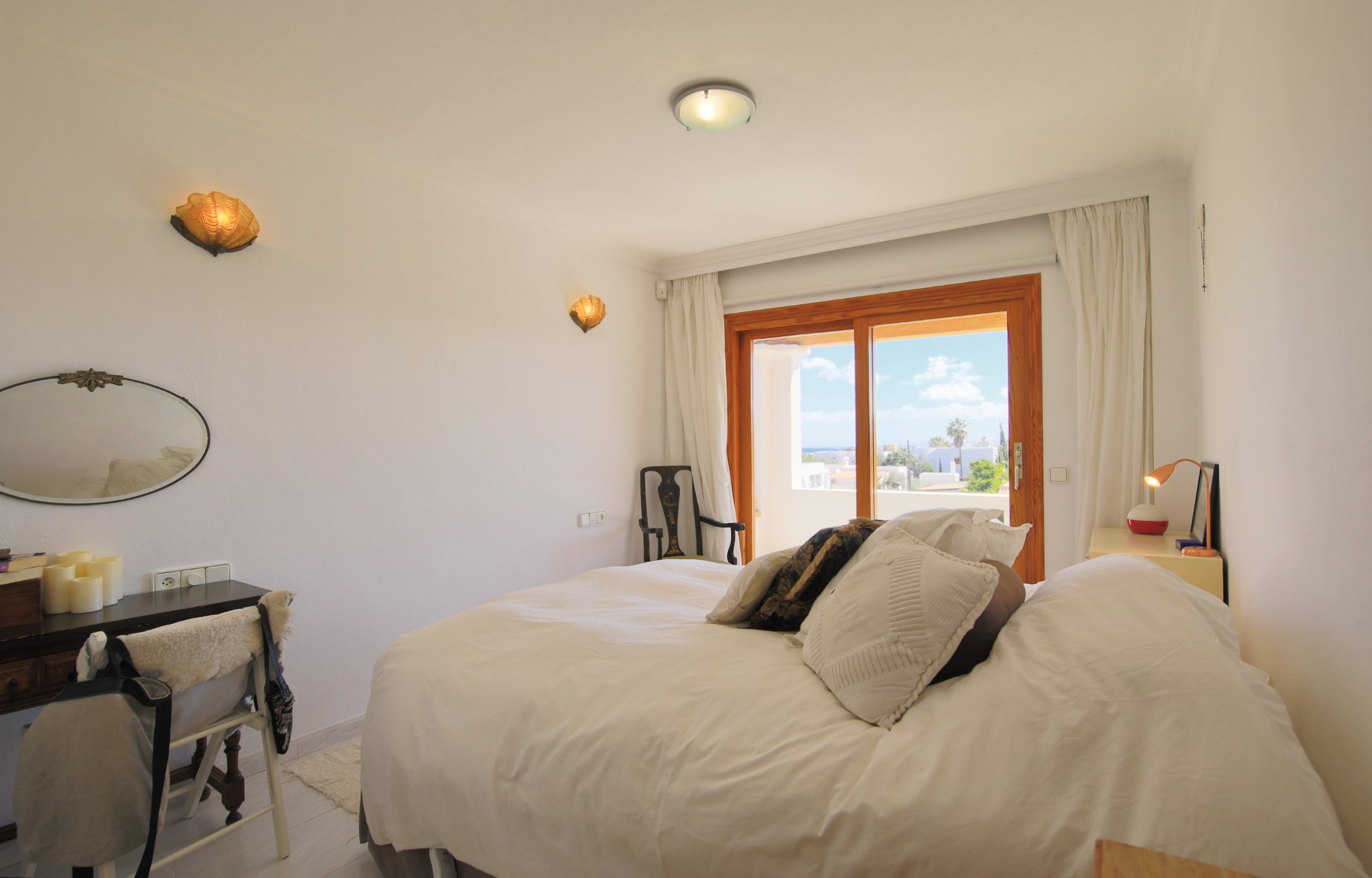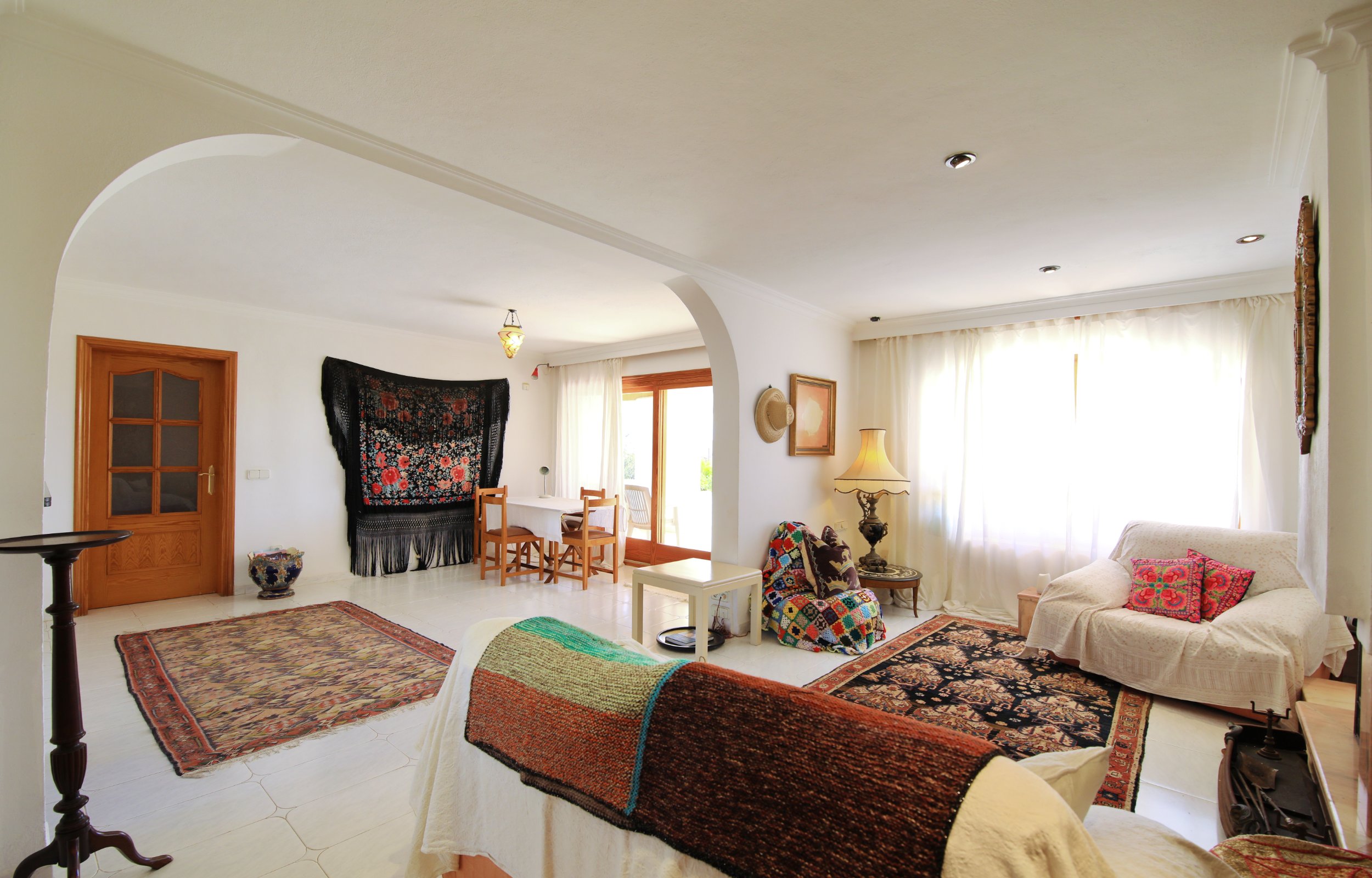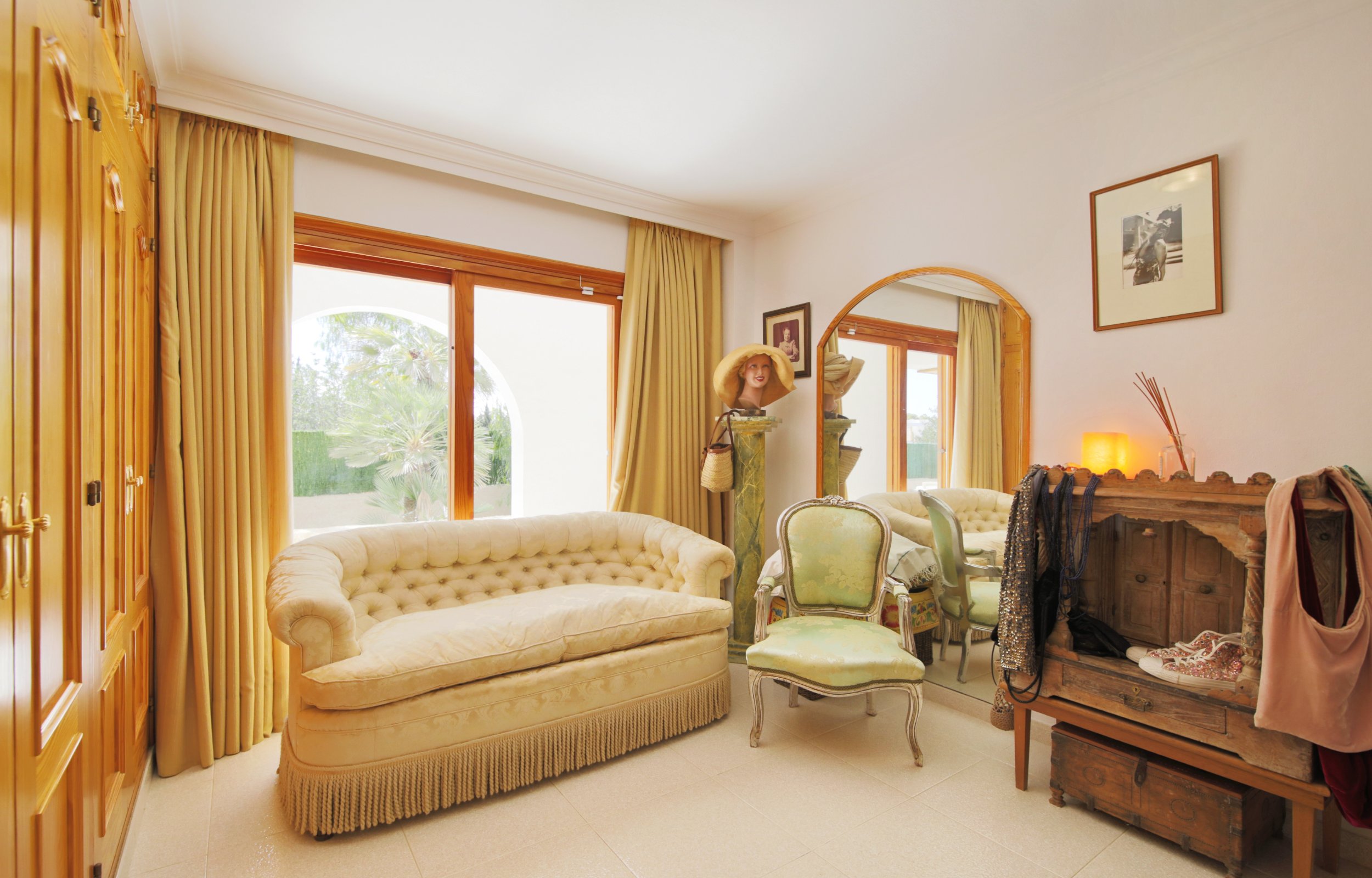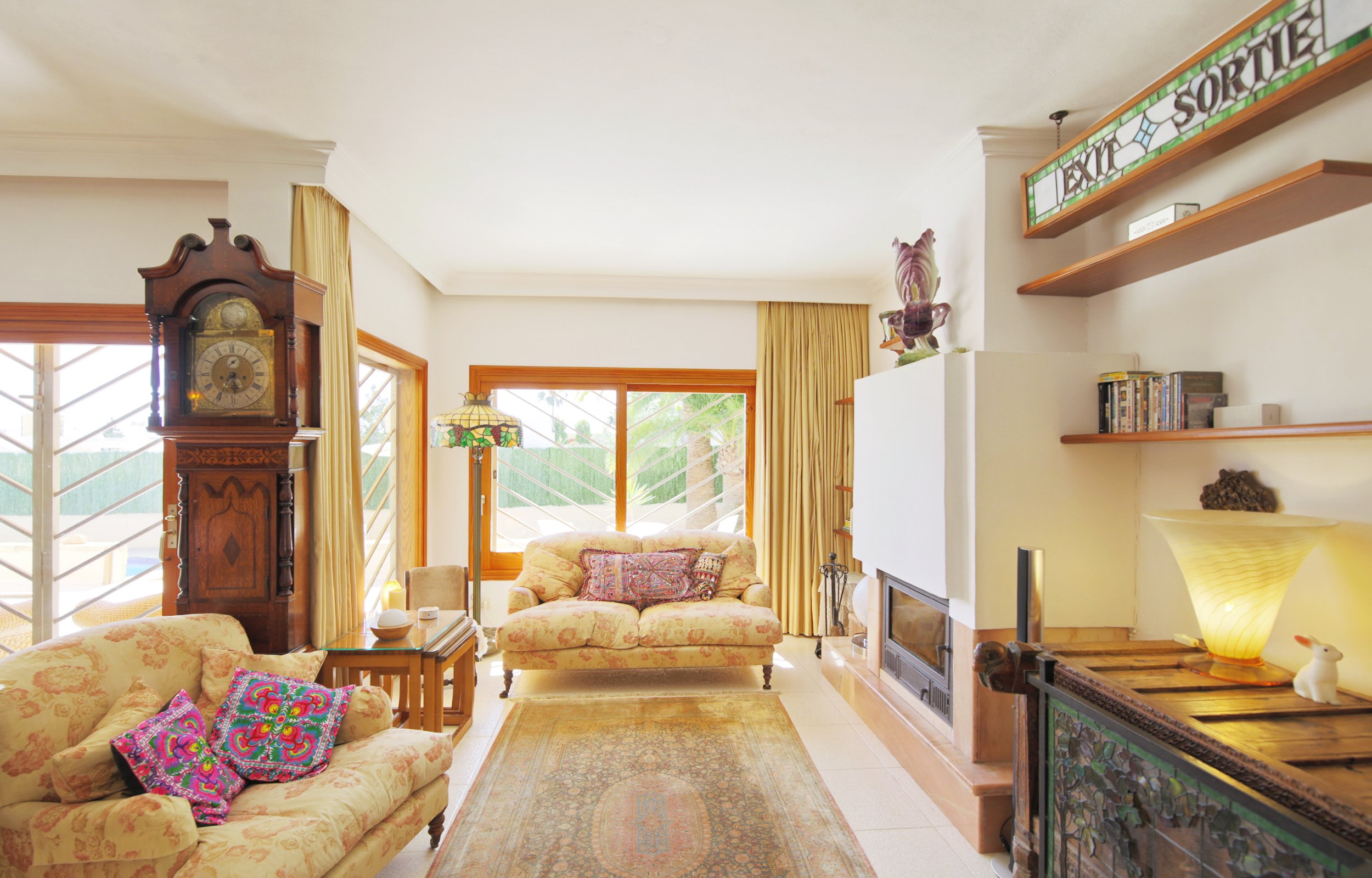 The main house on the ground floor of this Mediterranean style villa is spacious, elegant and brim-full of characterful features. Inside a stone tower, typical of the island, a staircase to the first floor accesses two apartments, each with its own entrance. Interiors are all high-ceilinged and light-filled, opening onto shady porches and terraces. Ground floor accommodation is graciously appointed, with two bedrooms and bathrooms (one ensuite), a kitchen, utility room and a generous living room with a fireplace. Upstairs, each apartment makes a welcoming home in itself, with two bedrooms, a family bathroom, living space with a substantial kitchen and a terrace with lovely views. The total built area of 690m2 occupies a plot of 1.600m2. Colourful gardens are shaded by mature trees and equipped with a large swimming pool and outside kitchen. This property, with its excellent connections to Ibiza town, is an opportunity full of potential for year-round island life.