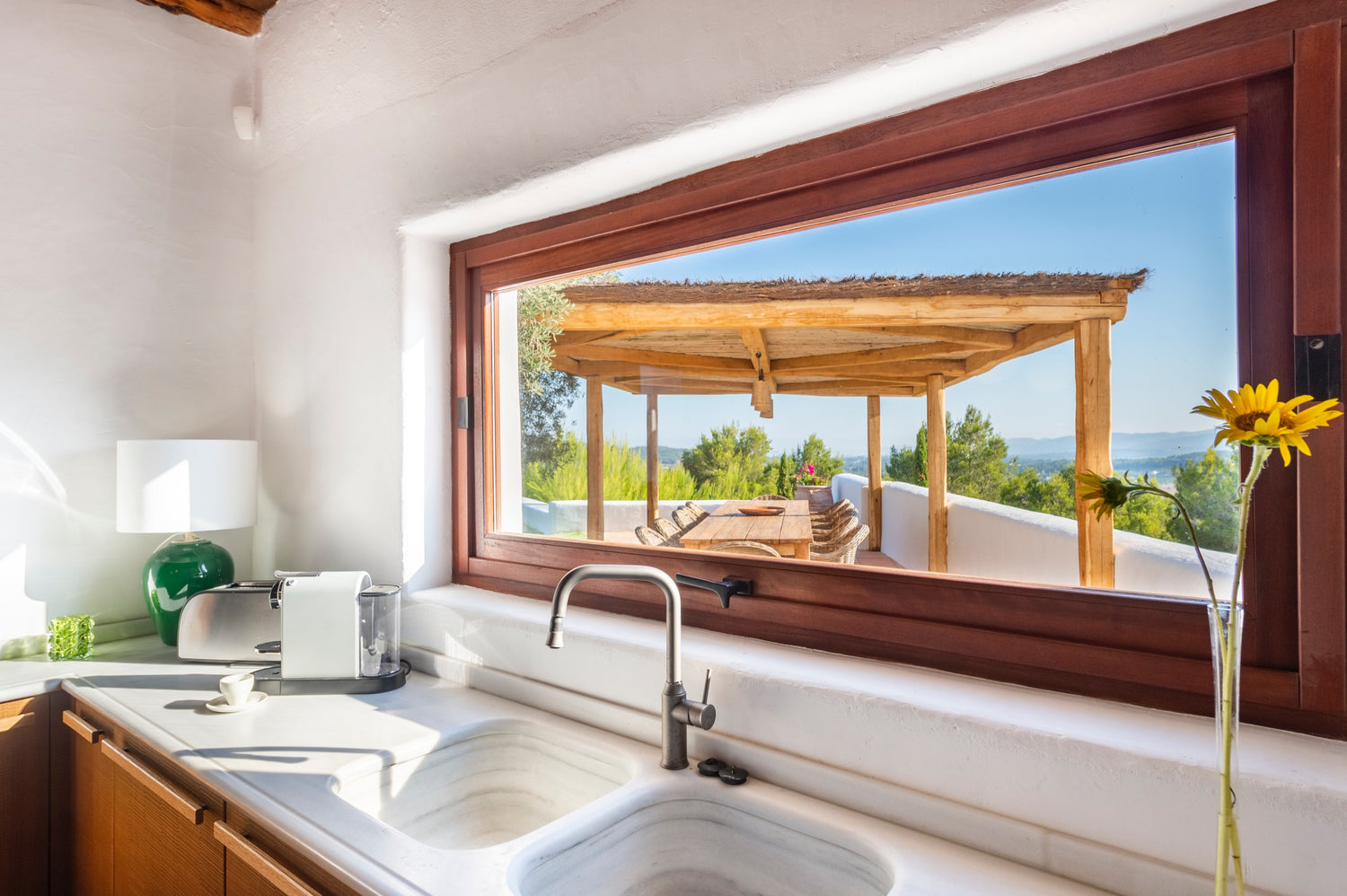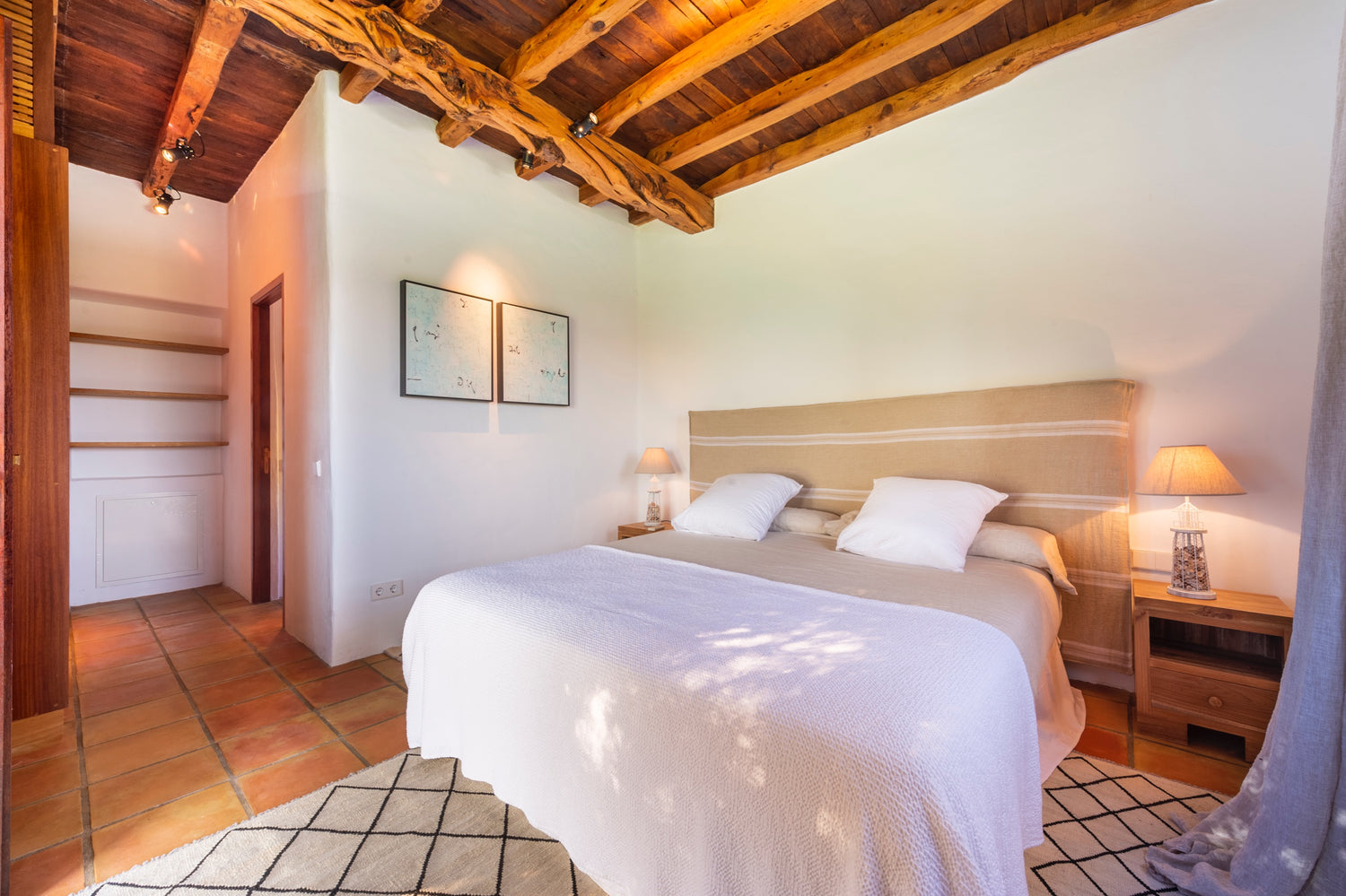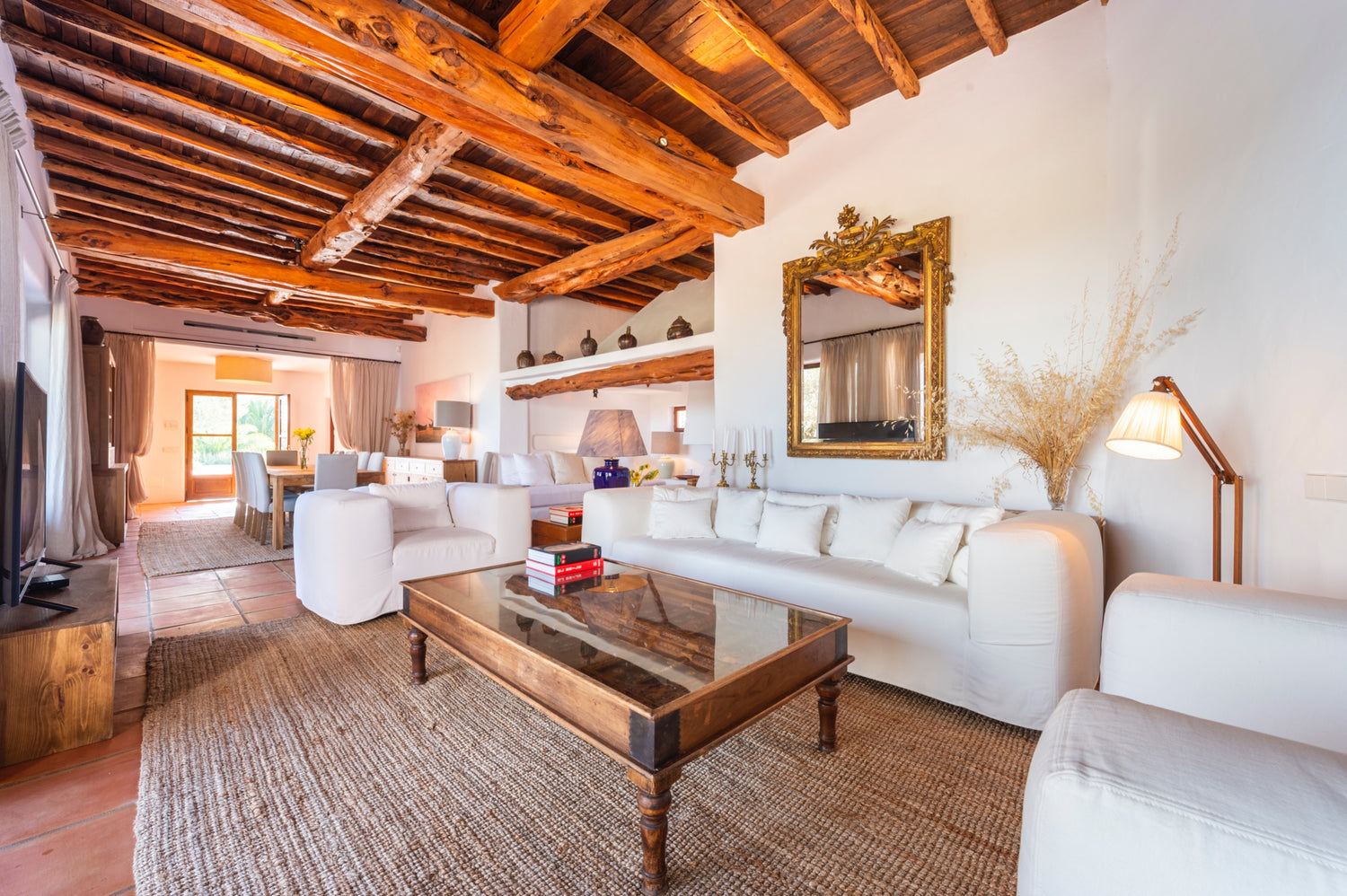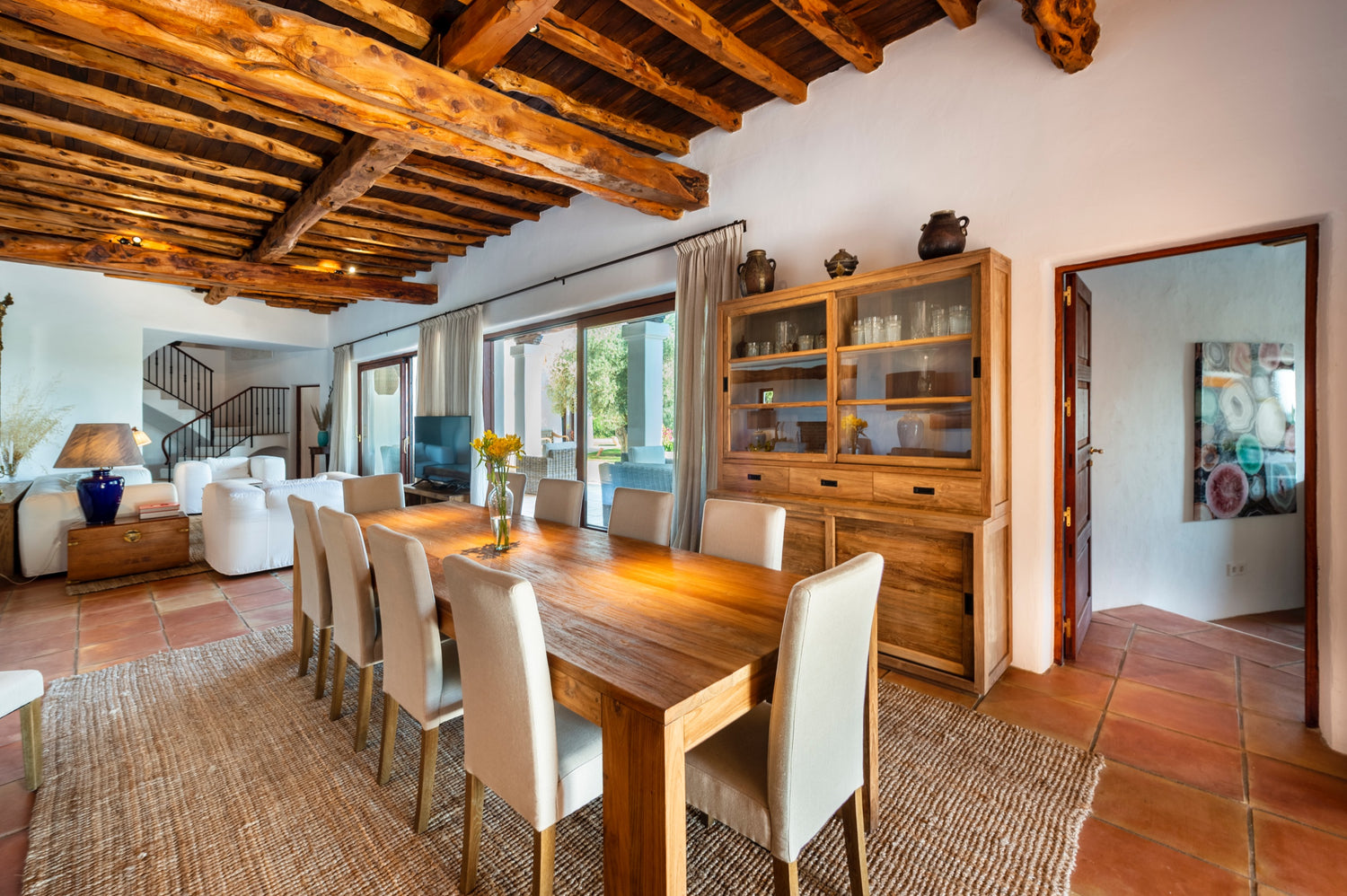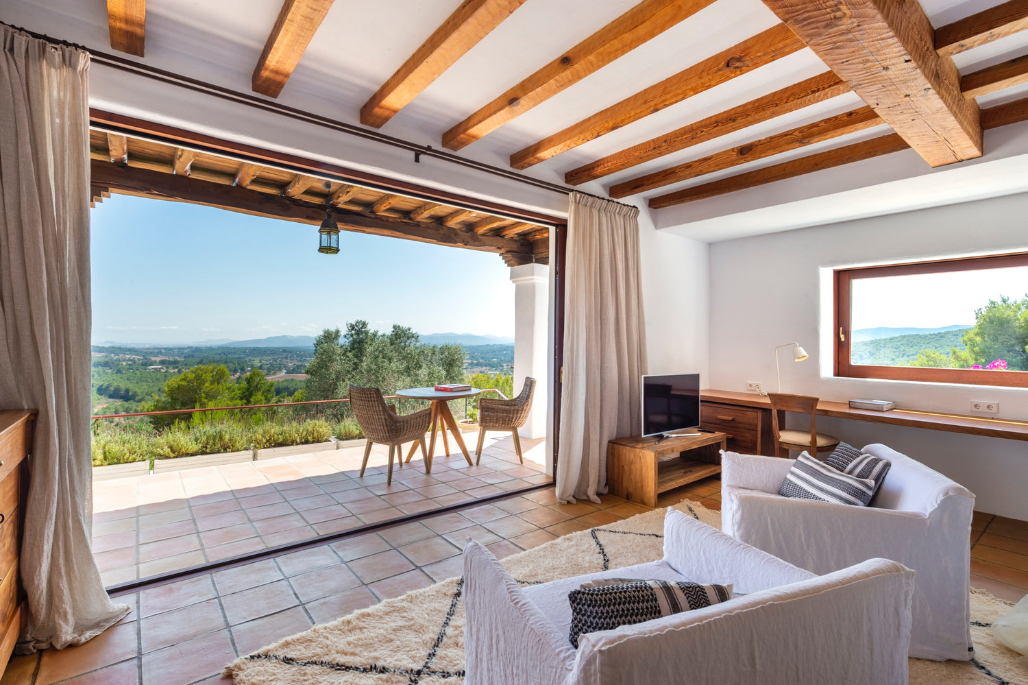 Finca Los Alamos benefits from traditional finishes that blend with timeless designer furniture, giving the house a very high end finish. It has 2 master suites on the first floor with access to private terraces with sea and valley view and 4 double bedroom suites on the ground floor, 2 with separate access from the garden. It’s fully equipped with flat screen TVs in the bedrooms with Netflix, Amazon and Apple TV, designer kitchen with brand new appliances and spacious lounge and dining room, plus a shaded outdoor dining area outside the kitchen. Finca Los Alamos features long, free-flowing terraces that wrap around the villa and it enjoys countryside views set off with ancient olive trees, tropical palms and large grass lawn ideal for all the family. The south facing salt-filtered pool has panoramic views over the valley to Dalt Vila.