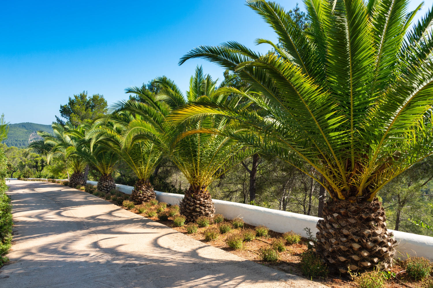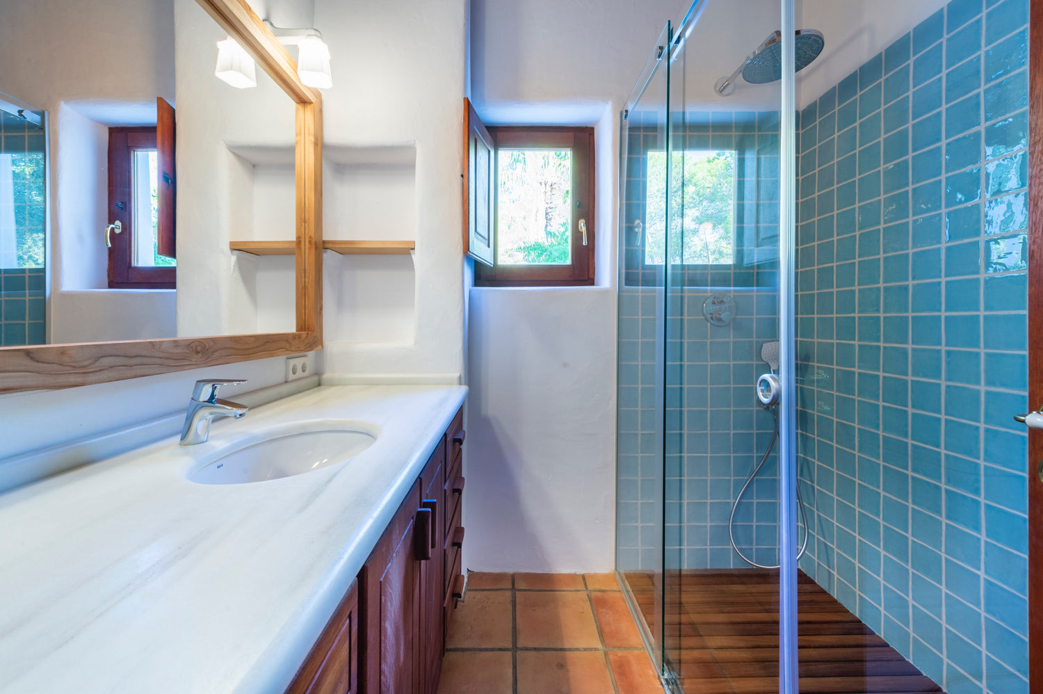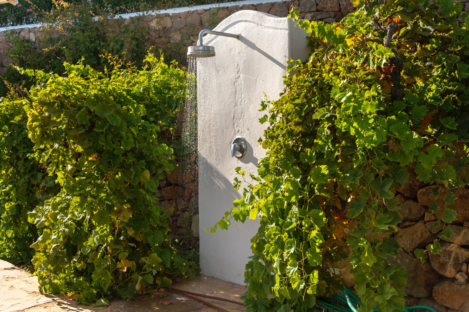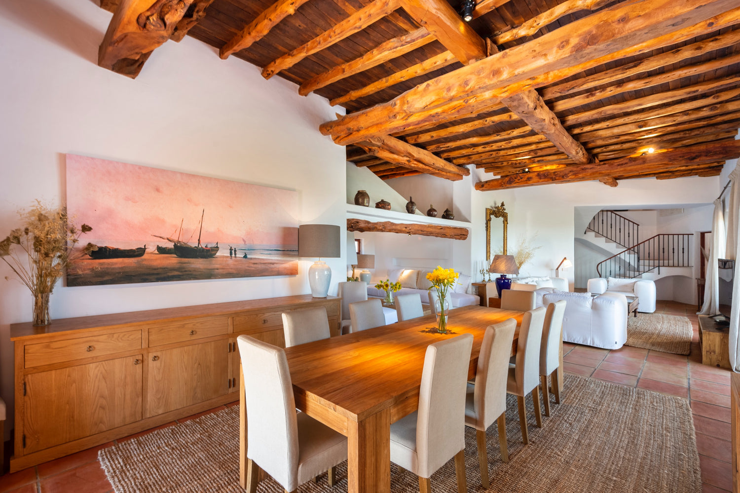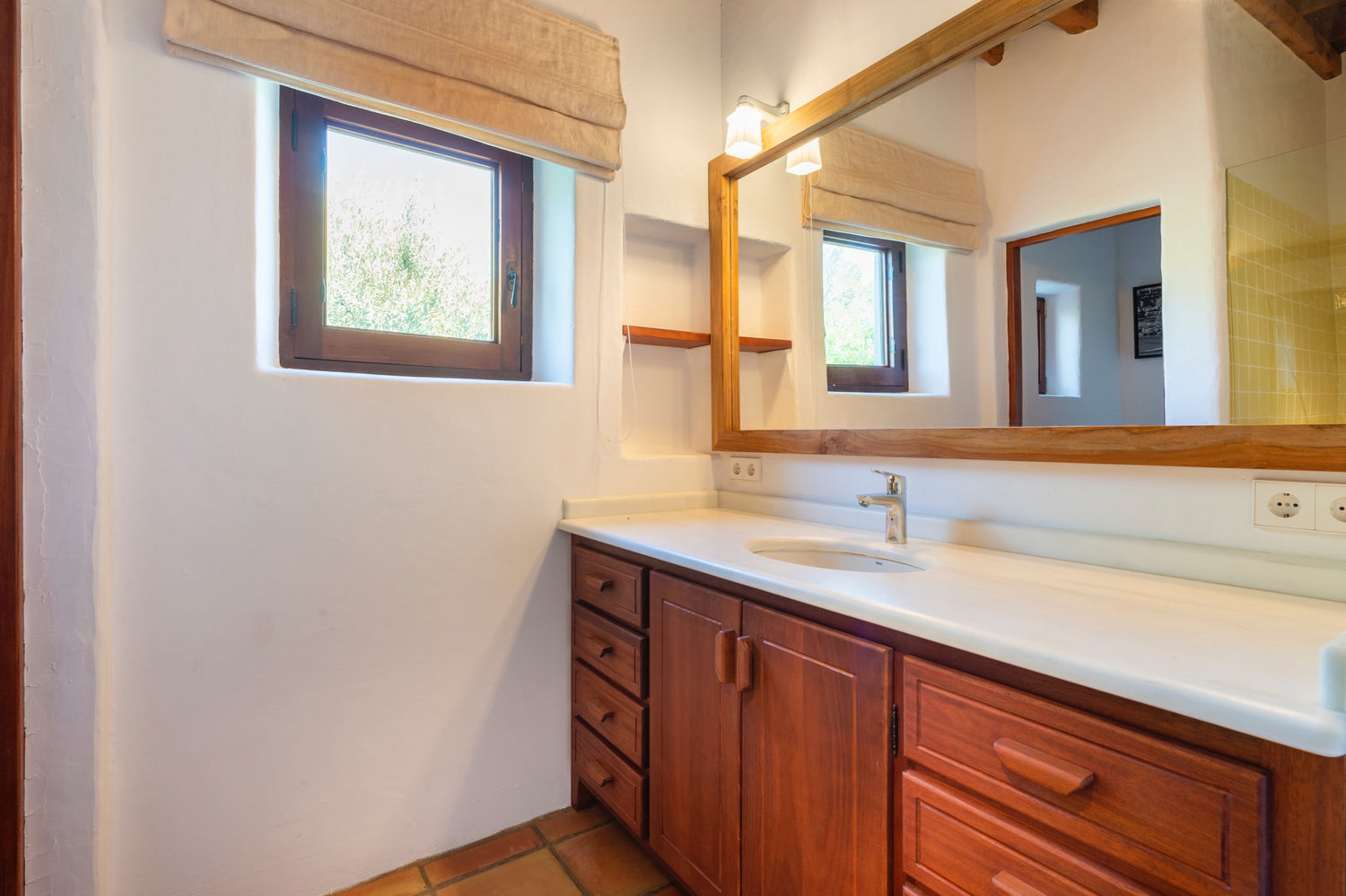 Finca Los Alamos benefits from traditional finishes that blend with timeless designer furniture, giving the house a very high end finish. It has 2 master suites on the first floor with access to private terraces with sea and valley view and 4 double bedroom suites on the ground floor, 2 with separate access from the garden. It’s fully equipped with flat screen TVs in the bedrooms with Netflix, Amazon and Apple TV, designer kitchen with brand new appliances and spacious lounge and dining room, plus a shaded outdoor dining area outside the kitchen. Finca Los Alamos features long, free-flowing terraces that wrap around the villa and it enjoys countryside views set off with ancient olive trees, tropical palms and large grass lawn ideal for all the family. The south facing salt-filtered pool has panoramic views over the valley to Dalt Vila.