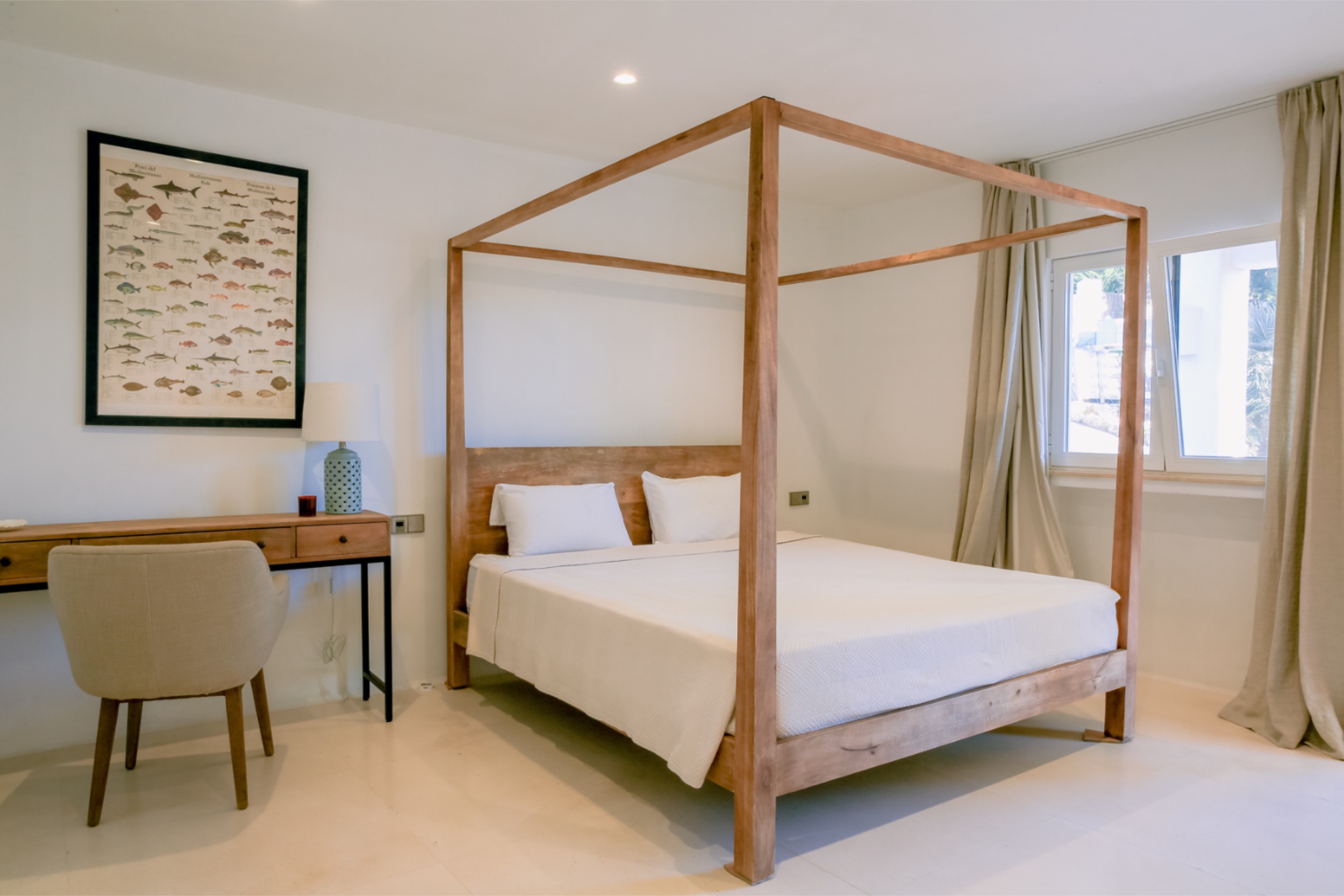 Surrounded by woodland, this privileged 15,000sqm plot is tranquil and yet only 3 minutes’ drive (15-minute walk) to the lovely beach at Cala Tarida. Stunning views take in a swathe of coast that includes Es Vedra. The renovation is absolutely in keeping with the location, its clean white lines, luminous spaces and natural materials harmonising with the heart and soul of Ibiza. The main part of the house is on the upper floor, looking out to sea. A bright open-plan living space opens to the terrace and swimming pool. A master suite is supplemented by two smaller bedrooms sharing a large bathroom. On a lower level, two independent apartments one of which has a small living room and kitchen, have a total of three bedrooms and two bathrooms. The beauty of its position and the quality of its renovation has created a very desirable property in a sought-after area.