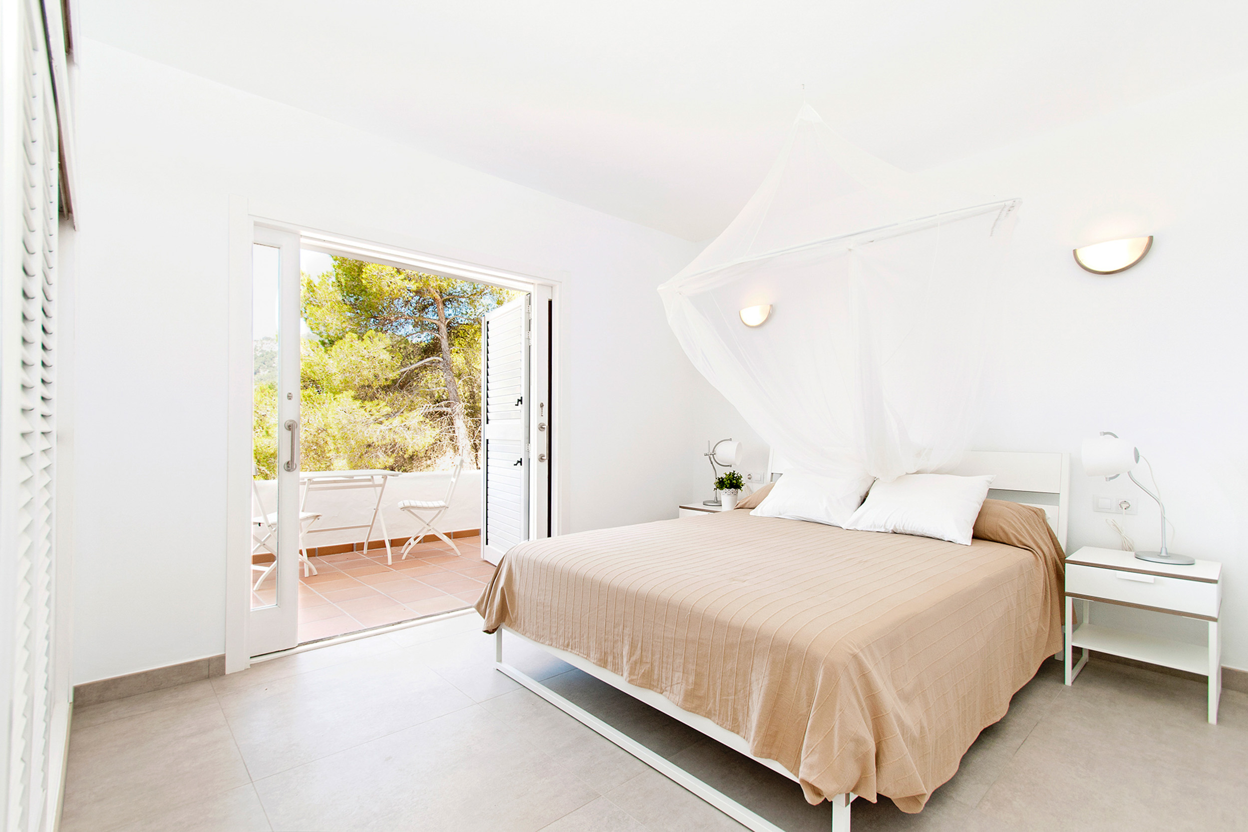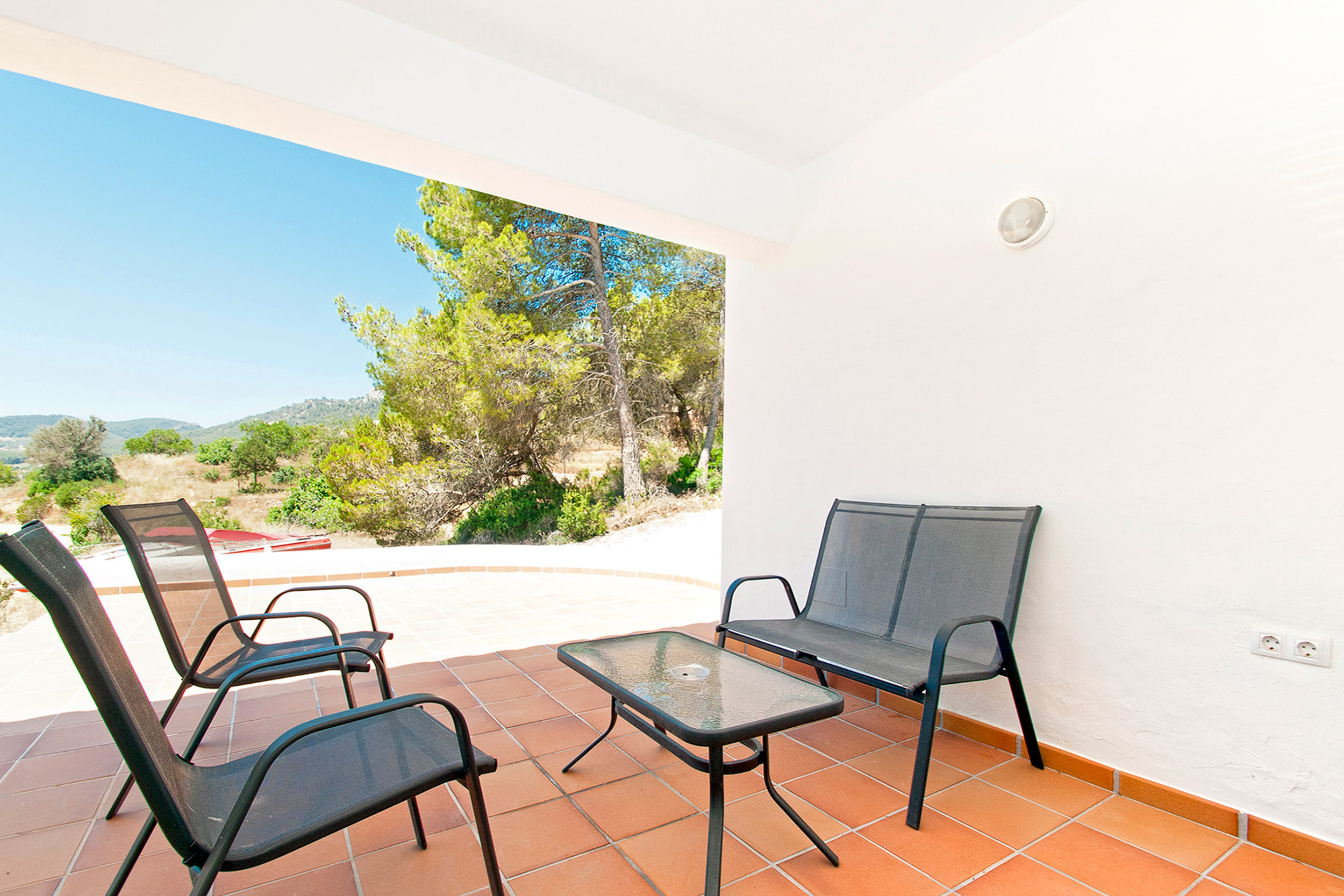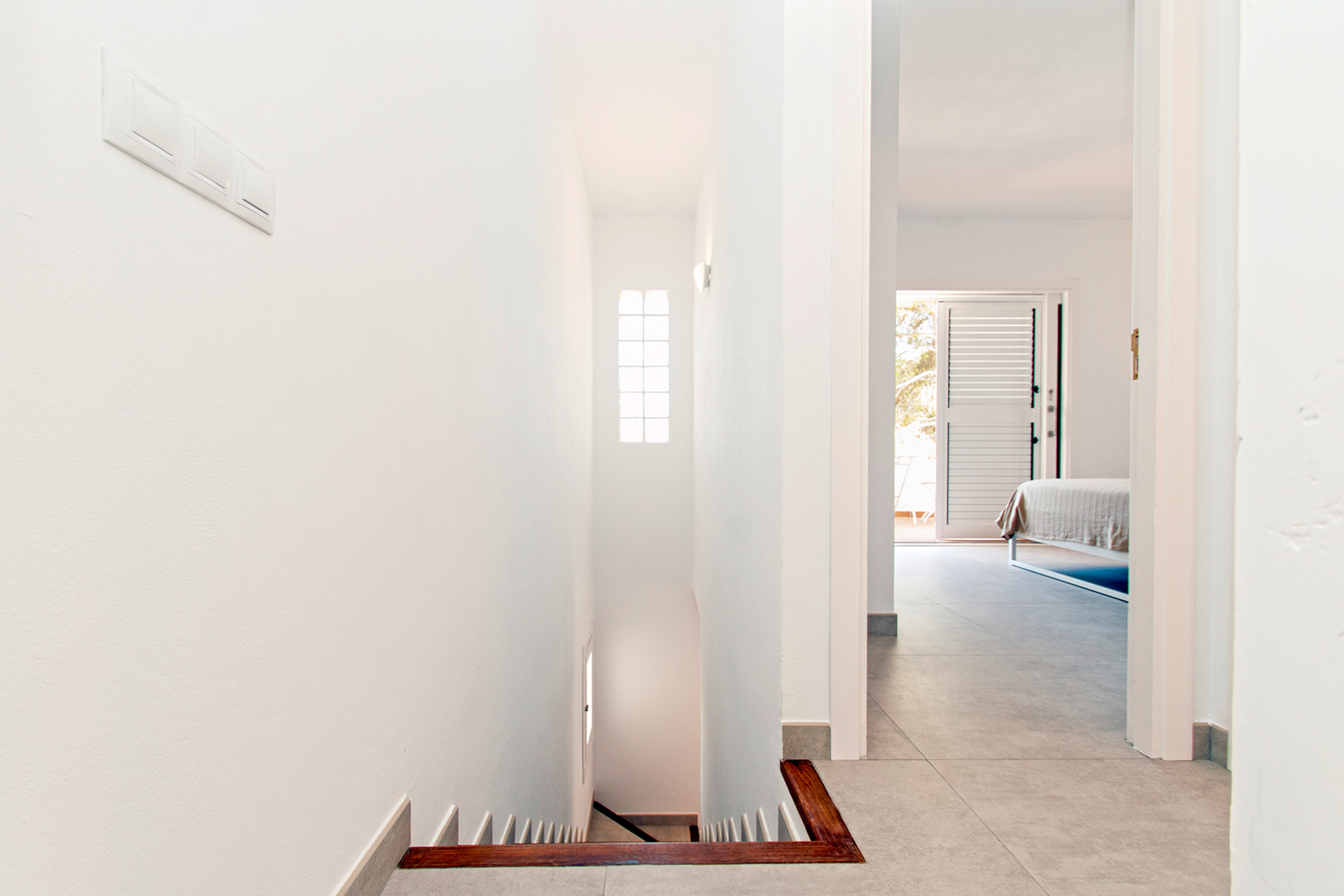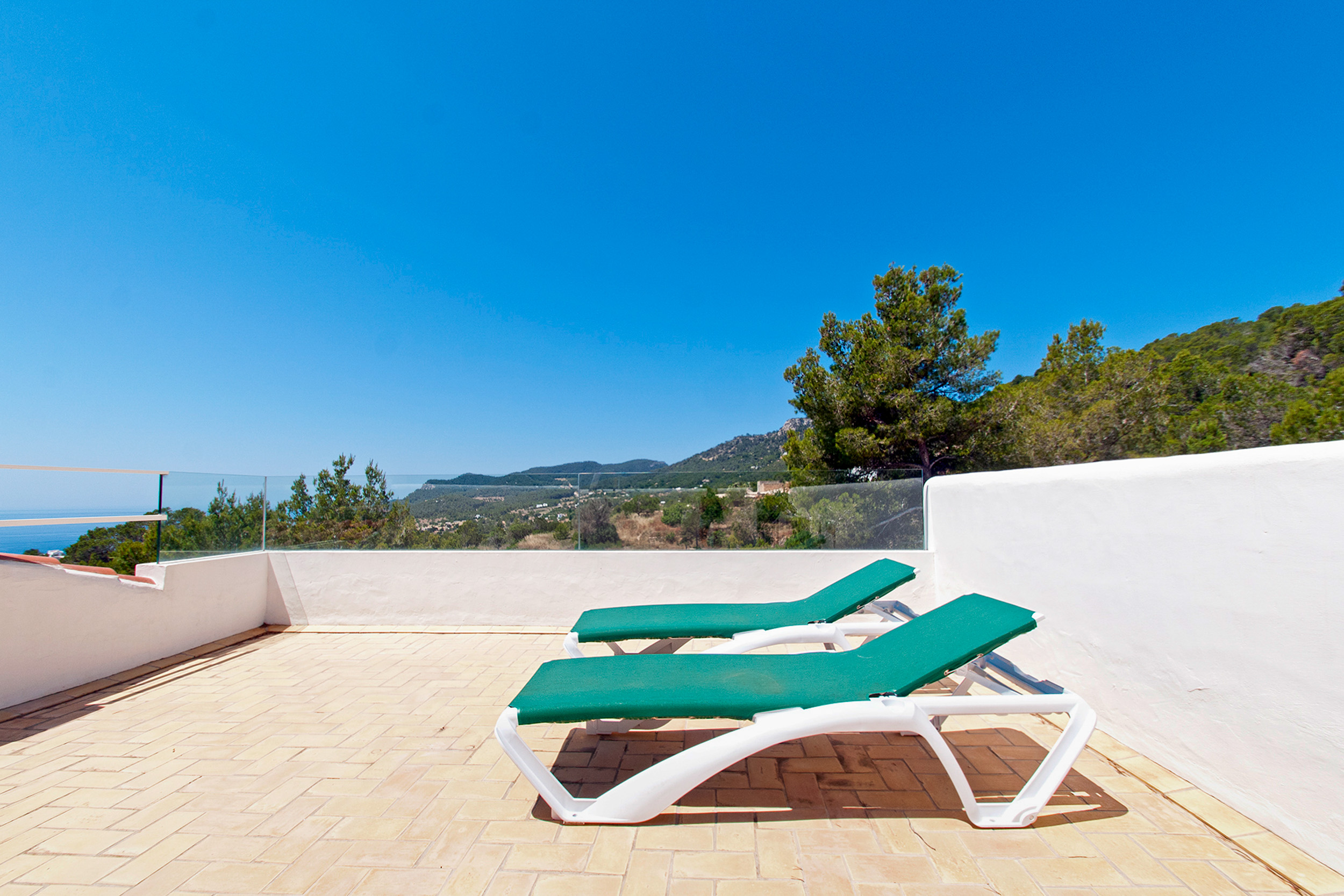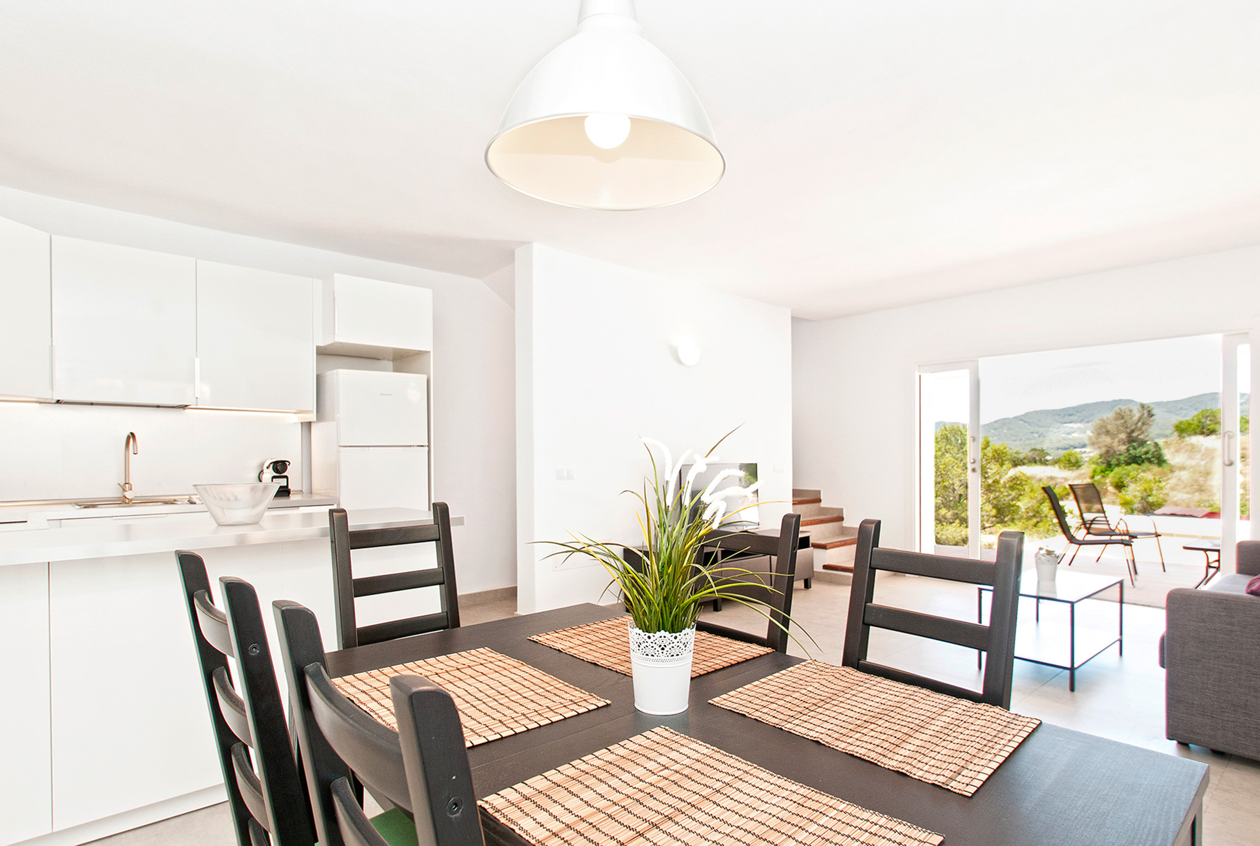 This charming semi-detached home is part of a small complex of just three other houses near San Jose. Designed with a nod towards traditional island architecture, this is pure Mediterranean living. Recently decorated to the highest standard, this property takes full advantage of sea views and the island lifestyle. Enter through large picture windows into the main living area where a brand new open plan kitchen and dining space lead to the living room and a tiled covered porch overlooking the lush pine forest. The upper level contains the second bedroom and master suite where French doors open to a private terrace. Summer days will play out on the roof terrace, perfect for yoga, snoozing or alfresco meals. From here the sea glitters majestically in the distance. Located just ten minutes from all the amenities and buzz of San Jose, this bright and breezy home is a fantastic home base or summer season second home.