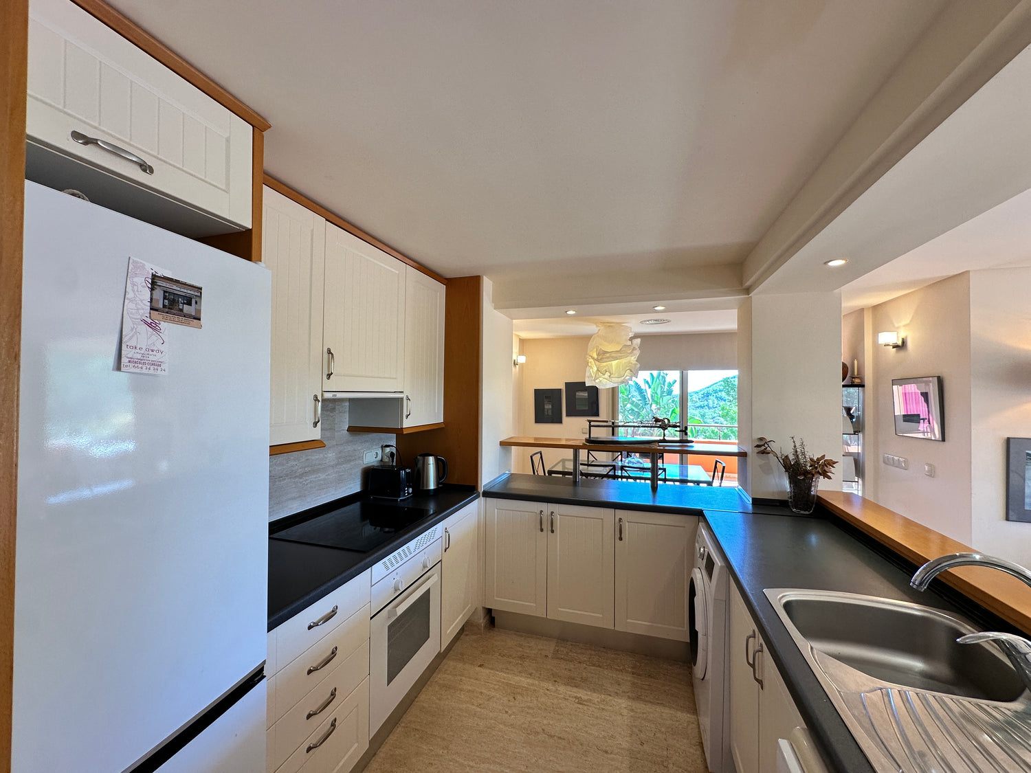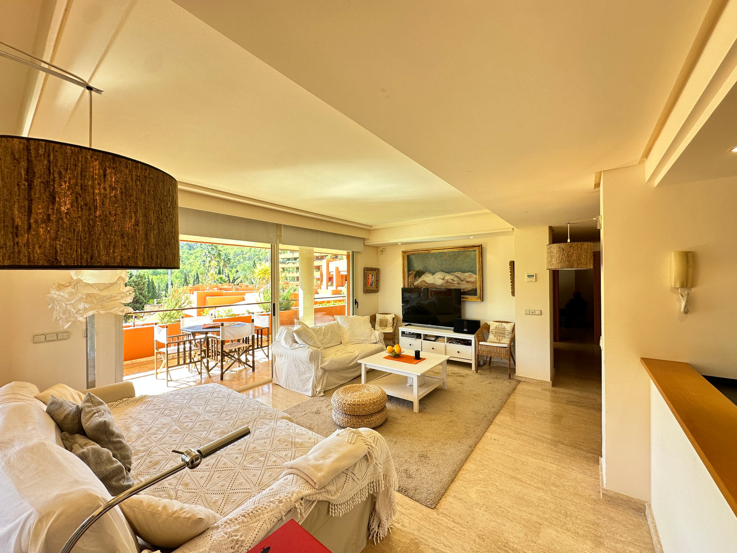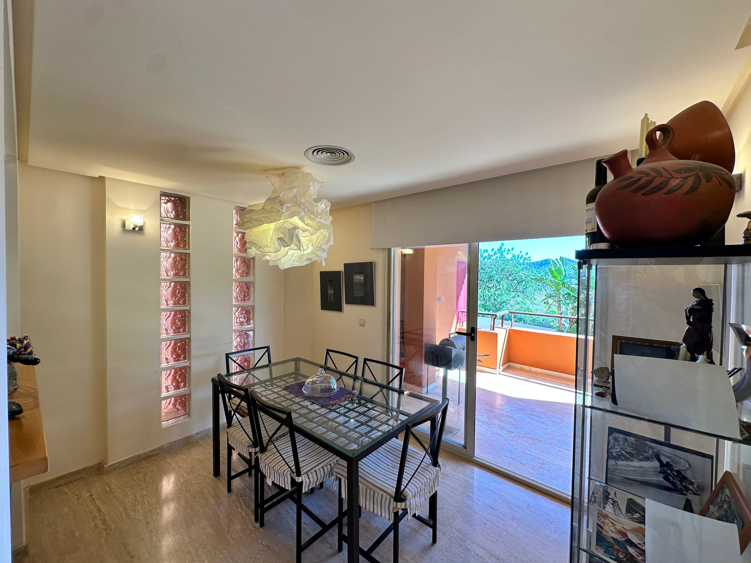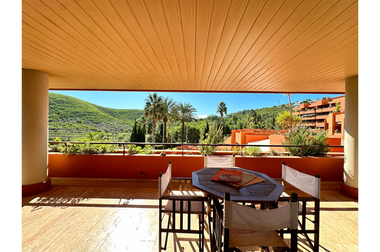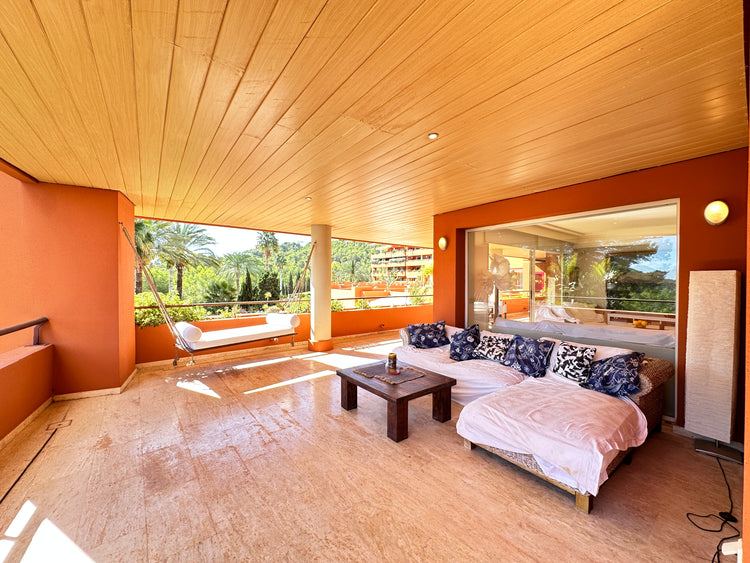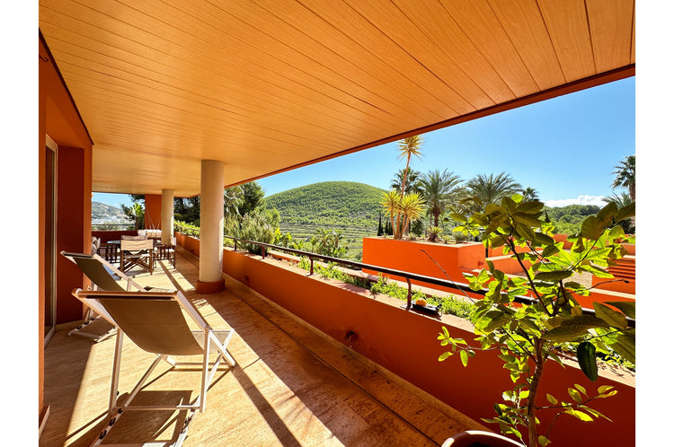 Roca Llisa spreads across pine woods down to Ibiza’s eastern coast. It offers high security living with stunning views. This 123m2 apartment is strategically located in a well-positioned building designed for privacy and whose community recently invested in painting its façades and the renovation of the communal pool area. Living space is semi-open plan and filled with light with a foyer, modern kitchen, living and dining areas. It opens to an incredible 68m2 terrace that extends round the corner of the building creating zones and nooks for relaxing outdoor living and offering views across the lush Ibiza countryside. The two good-sized double bedrooms also open to the terrace, one is ensuite while a separate bathroom serves the second bedroom and guests. With its 31m2 covered parking space, 13m2 additional storage and easy access to Santa Eulalia, Ibiza town and lovely beaches, this apartment is perfect for comfortable, practical and peaceful living.